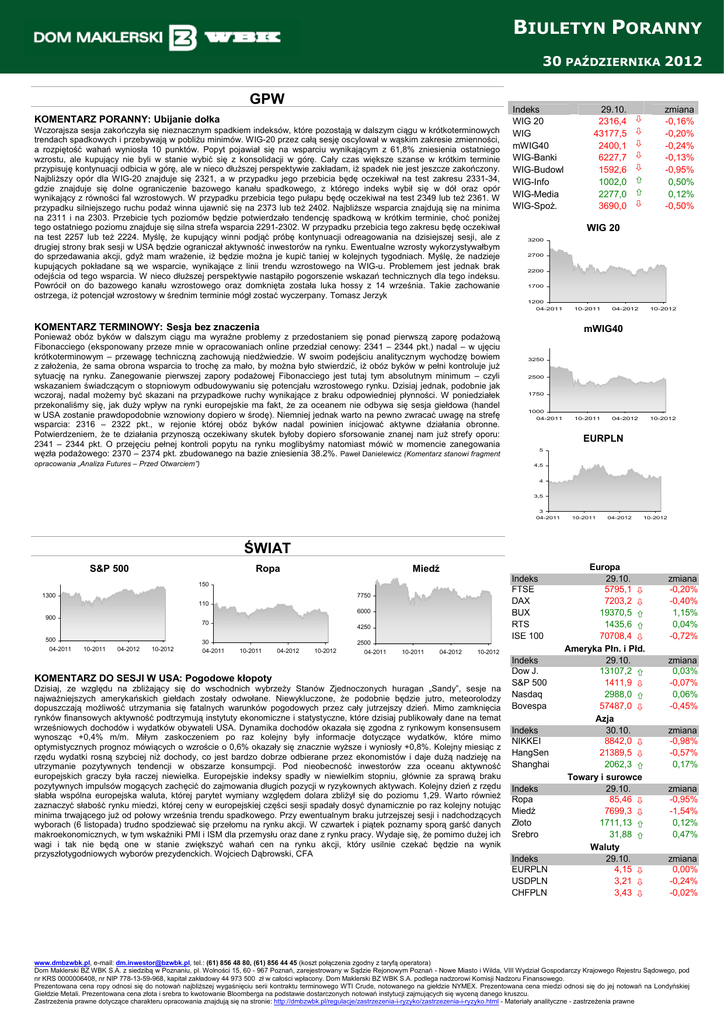 BIULETYN PORANNY o 30 PAŹDZIERNIKA 2012 GPW KOMENTARZ PORANNY: Ubijanie dołka Wczorajsza sesja zakończyła się nieznacznym spadkiem indeksów, które pozostają w dalszym ciągu w krótkoterminowych trendach spadkowych i przebywają w pobliŜu minimów. WIG-20 przez całą sesję oscylował w wąskim zakresie zmienności, a rozpiętość wahań wyniosła 10 punktów. Popyt pojawiał się na wsparciu wynikającym z 61,8% zniesienia ostatniego wzrostu, ale kupujący nie byli w stanie wybić się z konsolidacji w górę. Cały czas większe szanse w krótkim terminie przypisuję kontynuacji odbicia w górę, ale w nieco dłuŜszej perspektywie zakładam, iŜ spadek nie jest jeszcze zakończony. NajbliŜszy opór dla WIG-20 znajduje się 2321, a w przypadku jego przebicia będę oczekiwał na test zakresu 2331-34, gdzie znajduje się dolne ograniczenie bazowego kanału spadkowego, z którego indeks wybił się w dół oraz opór wynikający z równości fal wzrostowych. W przypadku przebicia tego pułapu będę oczekiwał na test 2349 lub teŜ 2361. W przypadku silniejszego ruchu podaŜ winna ujawnić się na 2373 lub teŜ 2402. NajbliŜsze wsparcia znajdują się na minima na 2311 i na 2303. Przebicie tych poziomów będzie potwierdzało tendencję spadkową w krótkim terminie, choć poniŜej tego ostatniego poziomu znajduje się silna strefa wsparcia 2291-2302. W przypadku przebicia tego zakresu będę oczekiwał na test 2257 lub teŜ 2224. Myślę, Ŝe kupujący winni podjąć próbę kontynuacji odreagowania na dzisiejszej sesji, ale z drugiej strony brak sesji w USA będzie ograniczał aktywność inwestorów na rynku. Ewentualne wzrosty wykorzystywałbym do sprzedawania akcji, gdyŜ mam wraŜenie, iŜ będzie moŜna je kupić taniej w kolejnych tygodniach. Myślę, Ŝe nadzieje kupujących pokładane są we wsparcie, wynikające z linii trendu wzrostowego na WIG-u. Problemem jest jednak brak odejścia od tego wsparcia. W nieco dłuŜszej perspektywie nastąpiło pogorszenie wskazań technicznych dla tego indeksu. Powrócił on do bazowego kanału wzrostowego oraz domknięta została luka hossy z 14 września. Takie zachowanie ostrzega, iŜ potencjał wzrostowy w średnim terminie mógł zostać wyczerpany. Tomasz Jerzyk Indeks WIG 20 WIG mWIG40 WIG-Banki WIG-Budowl WIG-Info WIG-Media WIG-SpoŜ. WIG 20 2700 2200 1700 KOMENTARZ TERMINOWY: Sesja bez znaczenia opracowania „Analiza Futures – Przed Otwarciem”) zmiana -0,16% -0,20% -0,24% -0,13% -0,95% 0,50% 0,12% -0,50% 3200 1200 04-2011 PoniewaŜ obóz byków w dalszym ciągu ma wyraźne problemy z przedostaniem się ponad pierwszą zaporę podaŜową Fibonacciego (eksponowany przeze mnie w opracowaniach online przedział cenowy: 2341 – 2344 pkt.) nadal – w ujęciu krótkoterminowym – przewagę techniczną zachowują niedźwiedzie. W swoim podejściu analitycznym wychodzę bowiem z załoŜenia, Ŝe sama obrona wsparcia to trochę za mało, by moŜna było stwierdzić, iŜ obóz byków w pełni kontroluje juŜ sytuację na rynku. Zanegowanie pierwszej zapory podaŜowej Fibonacciego jest tutaj tym absolutnym minimum – czyli wskazaniem świadczącym o stopniowym odbudowywaniu się potencjału wzrostowego rynku. Dzisiaj jednak, podobnie jak wczoraj, nadal moŜemy być skazani na przypadkowe ruchy wynikające z braku odpowiedniej płynności. W poniedziałek przekonaliśmy się, jak duŜy wpływ na rynki europejskie ma fakt, Ŝe za oceanem nie odbywa się sesja giełdowa (handel w USA zostanie prawdopodobnie wznowiony dopiero w środę). Niemniej jednak warto na pewno zwracać uwagę na strefę wsparcia: 2316 – 2322 pkt., w rejonie której obóz byków nadal powinien inicjować aktywne działania obronne. Potwierdzeniem, Ŝe te działania przynoszą oczekiwany skutek byłoby dopiero sforsowanie znanej nam juŜ strefy oporu: 2341 – 2344 pkt. O przejęciu pełnej kontroli popytu na rynku moglibyśmy natomiast mówić w momencie zanegowania węzła podaŜowego: 2370 – 2374 pkt. zbudowanego na bazie zniesienia 38.2%. Paweł Danielewicz (Komentarz stanowi fragment 29.10. 2316,4 43177,5 2400,1 6227,7 1592,6 1002,0 2277,0 3690,0 10-2011 04-2012 10-2012 mWIG40 3250 2500 1750 1000 04-2011 10-2011 04-2012 10-2012 EURPLN 5 4,5 4 3,5 3 04-2011 10-2011 04-2012 10-2012 ŚWIAT S&P 500 Ropa Miedź Indeks FTSE DAX BUX RTS ISE 100 150 1300 7750 110 6000 900 70 500 04-2011 4250 30 10-2011 04-2012 10-2012 04-2011 2500 10-2011 04-2012 10-2012 04-2011 10-2011 04-2012 10-2012 KOMENTARZ DO SESJI W USA: Pogodowe kłopoty Dzisiaj, ze względu na zbliŜający się do wschodnich wybrzeŜy Stanów Zjednoczonych huragan „Sandy”, sesje na najwaŜniejszych amerykańskich giełdach zostały odwołane. Niewykluczone, Ŝe podobnie będzie jutro, meteorolodzy dopuszczają moŜliwość utrzymania się fatalnych warunków pogodowych przez cały jutrzejszy dzień. Mimo zamknięcia rynków finansowych aktywność podtrzymują instytuty ekonomiczne i statystyczne, które dzisiaj publikowały dane na temat wrześniowych dochodów i wydatków obywateli USA. Dynamika dochodów okazała się zgodna z rynkowym konsensusem wynosząc +0,4% m/m. Miłym zaskoczeniem po raz kolejny były informacje dotyczące wydatków, które mimo optymistycznych prognoz mówiących o wzroście o 0,6% okazały się znacznie wyŜsze i wyniosły +0,8%. Kolejny miesiąc z rzędu wydatki rosną szybciej niŜ dochody, co jest bardzo dobrze odbierane przez ekonomistów i daje duŜą nadzieję na utrzymanie pozytywnych tendencji w obszarze konsumpcji. Pod nieobecność inwestorów zza oceanu aktywność europejskich graczy była raczej niewielka. Europejskie indeksy spadły w niewielkim stopniu, głównie za sprawą braku pozytywnych impulsów mogących zachęcić do zajmowania długich pozycji w ryzykownych aktywach. Kolejny dzień z rzędu słabła wspólna europejska waluta, której parytet wymiany względem dolara zbliŜył się do poziomu 1,29. Warto równieŜ zaznaczyć słabość ry