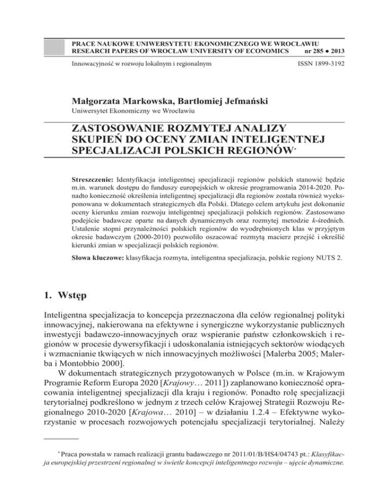 PRACE NAUKOWE UNIWERSYTETU EKONOMICZNEGO WE WROCŁAWIU RESEARCH PAPERS OF WROCŁAW UNIVERSITY OF ECONOMICS nr 285 ● 2013 Innowacyjność w rozwoju lokalnym i regionalnym ISSN 1899-3192 Małgorzata Markowska, Bartłomiej Jefmański Uniwersytet Ekonomiczny we Wrocławiu ZASTOSOWANIE ROZMYTEJ ANALIZY SKUPIEŃ DO OCENY ZMIAN INTELIGENTNEJ SPECJALIZACJI POLSKICH REGIONÓW* Streszczenie: Identyfikacja inteligentnej specjalizacji regionów polskich stanowić będzie m.in. warunek dostępu do funduszy europejskich w okresie programowania 2014-2020. Ponadto konieczność określenia inteligentnej specjalizacji dla regionów została również wyeksponowana w dokumentach strategicznych dla Polski. Dlatego celem artykułu jest dokonanie oceny kierunku zmian rozwoju inteligentnej specjalizacji polskich regionów. Zastosowano podejście badawcze oparte na danych dynamicznych oraz rozmytej metodzie k-średnich. Ustalenie stopni przynależności polskich regionów do wyodrębnionych klas w przyjętym okresie badawczym (2000-2010) pozwoliło oszacować rozmytą macierz przejść i określić kierunki zmian w specjalizacji polskich regionów. Słowa kluczowe: klasyfikacja rozmyta, inteligentna specjalizacja, polskie regiony NUTS 2. 1. Wstęp Inteligentna specjalizacja to koncepcja przeznaczona dla celów regionalnej polityki innowacyjnej, nakierowana na efektywne i synergiczne wykorzystanie publicznych inwestycji badawczo-innowacyjnych oraz wspieranie państw członkowskich i regionów w procesie dywersyfikacji i udoskonalania istniejących sektorów wiodących i wzmacnianie tkwiących w nich innowacyjnych możliwości [Malerba 2005; Malerba i Montobbio 2000]. W dokumentach strategicznych przygotowanych w Polsce (m.in. w Krajowym Programie Reform Europa 2020 [Krajowy… 2011]) zaplanowano konieczność opracowania inteligentnej specjalizacji dla kraju i regionów. Ponadto rolę specjalizacji terytorialnej podkreślono w jednym z trzech celów Krajowej Strategii Rozwoju Regionalnego 2010-2020 [Krajowa… 2010] – w działaniu 1.2.4 – Efektywne wykorzystanie w procesach rozwojowych potencjału specjalizacji terytorialnej. Należy * Praca powstała w ramach realizacji grantu badawczego nr 2011/01/B/HS4/04743 pt.: Klasyfikacja europejskiej przestrzeni regionalnej w świetle koncepcji inteligentnego rozwoju – ujęcie dynamiczne. 66 Małgorzata Markowska, Bartłomiej Jefmański również podkreślić, że w nowym okresie programowania (tj. w latach 2014-2020) określenie inteligentnej specjalizacji stanowiło będzie warunek dostępu do funduszy europejskich, co nakłada na zarządzających regionami obowiązek wyznaczenia branżowej specjalizacji oraz zdefiniowania mocnych i słabych stron regionu i rozwój z wykorzystaniem innowacji – taka polityka UE sprzyjać ma koncentracji zasobów na priorytetach o kluczowym znaczeniu [Dobrzycka 2012]. Celem artykułu jest przedstawienie możliwości zastosowania rozmytej analizy skupień do oceny dynamiki i kierunku zmian rozwoju inteligentnej specjalizacji polskich regionów. Dokonano podziału przestrzeni europejskiej na klasy regionów, wykorzystując dane dynamiczne oraz rozmyte metody klasyfikacji. Takie ujęcie wydaje się szczególnie przydatne jako instrument wspierający podejmowanie decyzji dotyczących kierunku i obszaru poszukiwań inteligentnej specjalizacji polskich regionów. Zastosowane podejście analityczne pozwoliło na identyfikację regionów, które w analizowanym okresie utrzymują sektorowy profil specjalizacji, oraz tych, dla których notowano zmiany w tym zakresie. Jest to wstępna selekcja obejmująca pola poszukiwań inteligentnej specjalizacji, dla której następnym etapem badań winno być uszczegółowienie do branż, a potem sekcji, w których regiony wykazują inteligentną specjalizację. 2. Znaczenie koncepcji inteligentnej specjalizacji i jej pomiaru Cel przewodni inicjatywy Unia Innowacji [Europe… 2010] stanowi poprawa warunków i dostępu do finansowania badań, co sprzyjać ma sytuacjom, w których innowacyjne pomysły przeradzać się będą w nowe produkty i usługi, stymulowaniu wzrostu gospodarczego oraz tworzeniu nowych miejsc pracy [A strategy… 2010]. Realizacja tego celu odbywać się ma w drodze wzmacniania roli unijnych instrumentów wspierających ten kierunek rozwoju, w tym: funduszy strukturalnych, funduszy rozwoju obszarów wiejskich, programów na rzecz wspierania konkurencyjności, zwłaszcza w efekcie zwiększenia nakładów na badania oraz nacisku na inteligentną specjalizację [Regional… 2010]. Fundusze europejskie to najważniejszy element oddziaływania, sprzyjający realizacji priorytetów Unii Innowacji oraz praktycznych działań w zakresie inteligentnej specjalizacji regionów. Do instrumentów finansowych polityki spójności, która po roku 2013 będzie warunkowa i silniej ukierunkowana na wyniki i efektywność, wprowadzony zostanie ex ante warunek dotyczący inteligentnej specjalizacji – jej określenie w regionie spowoduje przyznanie funduszy na badania naukowe, rozwój technologiczny i innowacje [Annex … 2011]. Osiągnięcie inteligentnej specjalizacji wymaga strategii rozwoju ukierunkowanej na innowacje, skupionej na mocnych stronach i przewadze konkurencyjnej regionu. Specjalizowanie się w sposób inteligentny to wykorzystanie regionalnych aktywów oraz umiejętności uczenia się tego, jakie specjalizacje można opracować i rozwinąć w odniesieniu do na przykład występujących w innych regionach na pod- Zastosowanie rozmytej analizy skupień do oceny zmian inteligentnej specjalizacji…67 stawie posiadanych informacji i z wykorzystaniem strategicznej inteligencji [Foray i van Ark 2007]. Podkreśla się, że inteligentna specjalizacja wymaga podejścia iteracyjnego i dynamicznego [Comparative… 2011]. Powinna być rozumiana jako dynamiczny proces identyfikowania obszarów, na których należy skupić uwagę. Nie chodzi zatem o „narzucenie” specjalizacji w wyniku realiz
