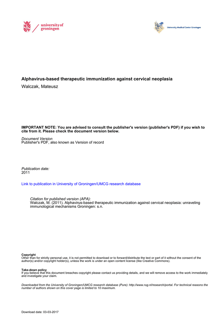 Alphavirus-based therapeutic immunization against cervical neoplasia Walczak, Mateusz IMPORTANT NOTE: You are advised to consult the publisher's version (publisher's PDF) if you wish to cite from it. Please check the document version below. Document Version Publisher's PDF, also known as Version of record Publication date: 2011 Link to publication in University of Groningen/UMCG research database Citation for published version (APA): Walczak, M. (2011). Alphavirus-based therapeutic immunization against cervical neoplasia: unraveling immunological mechanisms Groningen: s.n. Copyright Other than for strictly personal use, it is not permitted to download or to forward/distribute the text or part of it without the consent of the author(s) and/or copyright holder(s), unless the work is under an open content license (like Creative Commons). Take-down policy If you believe that this document breaches copyright please contact us providing details, and we will remove access to the work immediately and investigate your claim. Downloaded from the University of Groningen/UMCG research database (Pure): http://www.rug.nl/research/portal. For technical reasons the number of authors shown on this cover page is limited to 10 maximum. Download date: 03-03-2017 148 | CHAPTER 8 Rak szyjki macicy jest drugim co do częstości występowania nowotworem u kobiet. Na świecie diagnozowanych jest ok. 500.000 przypadków rocznie, z czego połowa prowadzi do zgonu. Choroba ta jest więc ważnym problemem medycznym jak i społecznym. Rak szyjki macicy wywoływany jest przez długotrwałe zakażenie onkogennymi typami ludzkiego wirusa brodawczaka (HPV). Profilaktyczne szczepienie przeciwko HPV może więc chronić przed zmianami przedrakowymi. Dostępne szczepionki przeciwko HPV nie usuwają jednakże istniejących infekcji HPV. Ponadto stosowane metody leczenia raka szyjki macicy, takie jak radioterapia, chemoterapia czy leczenie chirurgiczne są wysoce niespecyficzne i mogą powodować szereg efektów ubocznych. Biorąc pod uwagę powyższe ograniczenia istotnym jest aby kontynuować badania w celu poszukiwania nowych metod leczenia tej choroby. Immunoterapia może być nową strategią do zwalczania raka szyjki macicy. Metoda ta ma za zadanie stymulowanie układu immunologicznego do odrzucenia i niszczenia komórek nowotworowych. Wynaleziona w naszym laboratorium szczepionka terapeutyczna oparta na rekombinowanym wirusie Semliki Forest (rSFV) wydaję się być obiecującą i skuteczną immunoterapią raka szyjki macicy. Niniejsza rozprawa doktorska poświęcona była ocenie przeciwnowotworowej odpowiedzi immunologicznej wywołanej przez terapeutyczną immunizacje rSFV. Dodatkowo zbadany został wpływ wybranych immunologicznych mechanizmów na tą odpowiedź. Nasze badania przedkliniczne dowodzą iż rSFV indukuje silną odpowiedź immunologiczną skierowaną przeciwko komórkom nowotworowym. Odpowiedź ta jest na tyle silna że nie jest tłumiona przez limfocyty T regulatorowe. Otrzymane przez nas wyniki wskazują iż, efektywność naszej terapii może być dodatkowo zwiększona przez połączenie jej z lokalną radioterapią nowotworu. Podsumowując, terapeutyczna immunizacja rSFV wydaje się obiecującą i realistyczną metodą leczenia raka szyjki macicy wywołanego przez infekcję wirusem HPV. Kliniczne badania eksperymentalne są niezbędne aby potwierdzić skuteczność i bezpieczeństwo stosowania rSFV na ludziach. STRESZCZENIE | 149