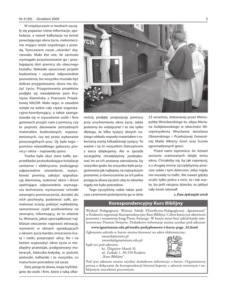 Nr 4 (30) - Grudzień 2009 W międzyczasie w mediach zaczęły się pojawiać różne informacje, spekulacje, a nawet kalkulacje na temat powstającego okna życia, niekoniecznie mające wiele wspólnego z prawdą. Tymczasem nasze „okienko” dojrzewało. Mało kto wie, ile zachodu wymagało przystosowanie go i przylegającej doń piwnicy do obecnego kształtu. Należało opracować projekt budowlany i uzyskać odpowiednie pozwolenia, bo wszystko musiało być dobrze przygotowane, skoro ma służyć życiu. Przygotowania projektów podjęła się nieodpłatnie pani Krystyna Klamińska z Pracowni Projektowej VACOR. Mało tego, w zasadzie wzięła na siebie cały ciężar organizacyjno-koordynujący, a także zaangażowała się w wyszukanie osób i firm gotowych przyjść nam z pomocą, czy to poprzez darowanie potrzebnych materiałów budowlanych, wyposażeniowych, czy też przez wykonanie poszczególnych prac. Oj, było tego – pomimo niewielkiego gabarytu piwnicy i okna – naprawdę sporo. Trzeba było skuć stare kafle, poprzekładać przeszkadzające instalacje sanitarne i elektryczne, podciągnąć odpowiednie oświetlenie, wytynkować piwnicę, założyć sygnalizację alarmową, wykonać okno i drzwi spełniające odpowiednie wymagania techniczne, wymurować schodki wewnątrz pomieszczenia, dorobić do nich pochwyty, podwiesić sufit, pomalować ściany, położyć wykładzinę, zamontować szyld podświetlany na zewnątrz, informujący, że to właśnie tu. Wreszcie, jakoś uporządkować najbliższe otoczenie: naprawić elewację, wymienić w oknach sąsiadujących z oknem życia bardzo zniszczone kraty i siatki, posprzątać ulicę. No i na koniec wyposażyć okno życia w niezbędny przewijak, podgrzewany materacyk, łóżeczko-kołyskę, w pościel, pieluszki, kaftaniki i to wszystko, co maluchowi potrzebne od zaraz. Dziś, pisząc te słowa, moja myśl biegnie do osób i firm, które z taką ofiar- 5 nością podjęły propozycję pomocy przy uruchomieniu okna życia. Jakże jesteśmy im wdzięczne! I to nie tylko dlatego, że kilka tysięcy złotych naszego wkładu wsparły materiałem i robocizną wartą kilkadziesiąt tysięcy. To ważne i za to wszystkim Darczyńcom z serca dziękujemy. Ale w sposób szczególny chciałybyśmy podziękować im za ich postawę zatroskania, by wszystko grało, by wszystko było przygotowane jak najlepiej, na najwyższym poziomie, a równocześnie za ich pełne przejęcia słowa życzeń: oby to okienko nigdy nie było potrzebne. Tego życzyliśmy sobie także podczas ceremonii poświęcenia go w dniu 23 września, dokonanej przez Metropolitę Wrocławskiego ks. abpa Mariana Gołębiewskiego w obecności Wiceprezydenta Wrocławia Jarosława Obremskiego i Przełożonej Generalnej Matki Alberty Groń oraz licznie zgromadzonych gości. Przed nami tajemnica: ile istnień zostanie uratowanych dzięki temu oknu. Chciałoby się, by jak najwięcej, a z drugiej strony życzyłybyśmy przecież sobie i tym dzieciom, żeby nigdy nie musiały tu trafić. Ale nawet gdyby ocalić tylko jedno z nich, to i tak warto, bo jeśli ratujesz dziecko, to jakbyś cały świat ratował! s. Ewa Jędrzejak smcb Korespondencyjny Kurs Biblijny Wydział Pedagogiczny Wyższej Szkoły Filozoficzno-Pedagogicznej „Ignatianum” w Krakowie organizuje Korespondencyjny Kurs Biblijny. Celem kursu jest ułatwienie poznania i rozumienia ksiąg Pisma Świętego. W kursie może brać udział każdy zainteresowany Pismem Świętym. Dodatkowe informacje można uzyskać pod adresem: www.ignatianum.edu.pl/studia-podyplomowe-i-kursy-page_32.html Zgłoszenia udziału w kursie można kierować na adres elektroniczny: [email protected] [email protected] bądź też pod adresem: ks. Zbigniew Marek SJ ul. Zaskale 1, 30-250 Kraków „Kurs Biblijny”. Pod tym adresem można uzyskać dodatkowe informacje o kursie. Organizatorzy proszą o dołączanie do korespondencji listowej koperty z adresem zwrotnym i naklejonym znaczkiem pocztowym.