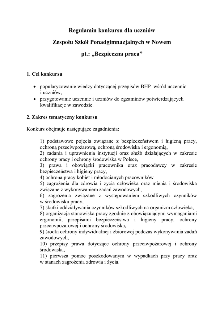 Regulamin konkursu dla uczniów Zespo u Szkó Ponadgimnazjalnych w Nowem pt.: „Bezpieczna praca” 1. Cel konkursu popularyzowanie wiedzy dotycz cej przepisów BHP w ród uczennic i uczniów, przygotowanie uczennic i uczniów do egzaminów potwierdzaj cych kwalifikacje w zawodzie. 2. Zakres tematyczny konkursu Konkurs obejmuje nast puj ce zagadnienia: 1) podstawowe poj cia zwi zane z bezpiecze stwem i higien pracy, ochron przeciwpo arow , ochron rodowiska i ergonomi , 2) zadania i uprawnienia instytucji oraz s b dzia aj cych w zakresie ochrony pracy i ochrony rodowiska w Polsce, 3) prawa i obowi zki pracownika oraz pracodawcy w zakresie bezpiecze stwa i higieny pracy, 4) ochrona pracy kobiet i m odocianych pracowników 5) zagro enia dla zdrowia i ycia cz owieka oraz mienia i rodowiska zwi zane z wykonywaniem zada zawodowych, 6) zagro enia zwi zane z wyst powaniem szkodliwych czynników w rodowisku pracy, 7) skutki oddzia ywania czynników szkodliwych na organizm cz owieka, 8) organizacja stanowiska pracy zgodnie z obowi zuj cymi wymaganiami ergonomii, przepisami bezpiecze stwa i higieny pracy, ochrony przeciwpo arowej i ochrony rodowiska, 9) rodki ochrony indywidualnej i zbiorowej podczas wykonywania zada zawodowych, 10) przepisy prawa dotycz ce ochrony przeciwpo arowej i ochrony rodowiska, 11) pierwsza pomoc poszkodowanym w wypadkach przy pracy oraz w stanach zagro enia zdrowia i ycia. 3. Uczestnicy konkursu Uczestnikami konkursu s uczennice i uczniowie klas Technikum i Zasadniczej Szko y Zawodowej w ZSP w Nowem. 4. Organizacja konkursu Konkurs przebiega w dwóch etapach: I etap konkursu to test (25 zada zamkni tych). Komisja konkursowa przeprowadza test i dokonuje oceny odpowiedzi w celu wy onienia pi ciu uczestników/uczestniczek z najwy sz liczb punktów. Termin przeprowadzenia testu: koniec marca 2016r. II etap konkursu - zadaniem konkursowym dla uczestników jest udzielenie odpowiedzi na wylosowane pytania przed komisj konkursow . Termin: kwiecie 2016r. Laureatami konkursu s trzy osoby, które zdoby y najwi ksz liczb punktów w II etapie konkursu. 5. Nagrody i wyró nienia Wszyscy uczestnicy II etapu konkursu otrzymuj okoliczno ciowe dyplomy Zwyci zcy otrzymuj dodatkowe nagrody. 6. Materia y pomocnicze http://www.kno.koweziu.edu.pl/repozytoriumkursow.html?view=kurs&id=391%3Ateoria-bhp&catid=99 (zaloguj si jako go ) http://www.kno.koweziu.edu.pl/repozytoriumkursow.html?view=kurs&id=392%3Apierwsza-pomoc&catid=99 (zloguj si jako go ) https://www.pip.gov.pl/pl/bhp organizator konkursu: Anna Bara ska, nauczyciel przedmiotów zawodowych