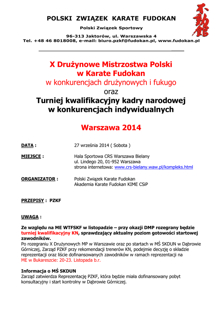 POLSKI ZWIĄZEK KARATE FUDOKAN Polski Związek Sportowy 96-313 Jaktorów, ul. Warszawska 4 Tel. +48 46 8018008, e-mail: [email protected], www.fudokan.pl ____ X Drużynowe Mistrzostwa Polski w Karate Fudokan w konkurencjach drużynowych i fukugo oraz Turniej kwalifikacyjny kadry narodowej w konkurencjach indywidualnych Warszawa 2014 DATA : 27 września 2014 ( Sobota ) MIEJSCE : Hala Sportowa CRS Warszawa Bielany ul. Lindego 20, 01-952 Warszawa strona internetowa: www.crs-bielany.waw.pl/kompleks.html ORGANIZATOR : Polski Związek Karate Fudokan Akademia Karate Fudokan KIME CSiP PRZEPISY : PZKF UWAGA : Ze względu na ME WTFSKF w listopadzie – przy okazji DMP rozegrany będzie turniej kwalifikacyjny KN, sprawdzający aktualny poziom gotowości startowej zawodników. Po rozegraniu X Drużynowych MP w Warszawie oraz po startach w MŚ SKDUN w Dąbrowie Górniczej, Zarząd PZKF przy rekomendacji trenerów KN, podejmie decyzję o składzie reprezentacji oraz liście dofinansowanych zawodników w ramach reprezentacji na ME w Bukareszcie: 20-23. Listopada b.r. Informacja o MŚ SKDUN Zarząd zatwierdza Reprezentację PZKF, która będzie miała dofinansowany pobyt konsultacyjny i start kontrolny w Dąbrowie Górniczej. KOLEJNOŚC STARTÓW w ciągu dnia: 1. Konkurencje DMP. 2. Konkurencje turniejowe KN. UWAGA: W konkurencjach turniejowych KN startują wszyscy chętni zawodnicy. Osoby spoza KN, które uzyskają wysoki wynik, otrzymają zaproszenie do składu KN. KONKURENCJE I GRUPY WIEKOWE: KATA – system punktowy. Zawodnicy prezentują dowolne kata WTFSKF. FUKUGO KLASYCZNE – naprzemiennie: Kitei + kumite klasyczne. FUKUGO WOLNE – naprzemiennie: Kata tokui + kumite wolne. Zawodnicy prezentują dowolne kata WTFSKF. KONKURENCJE i GRUPY WIEKOWE DMP: Konkurencje DMP kata drużynowe kobiet Grupy wiekowe Juniorzy młodsi (Kadeci) - 14-15 lat, urodzeni w 1999 i 2000 r. kata drużynowe mężczyzn enbu męskie enbu mix fukugo klasyczne kobiet fukugo klasyczne mężczyzn fukugo wolne kobiet fukugo wolne mężczyzn kumite drużynowe klasyczne kobiet kumite drużynowe klasyczne mężczyzn kumite drużynowe wolne kobiet kumite drużynowe wolne mężczyzn Juniorzy - 16-18 lat, urodzeni w 1996, 1997, 1998 r. Młodzieżowcy - 19-21 lat, urodzeni w 1993, 1994, 1995 r. Seniorzy -powyżej 21 lat, urodzeni w 1992 r. i starsi KONKURENCJE i GRUPY WIEKOWE TURNIEJU KWALIFIKACYJNEGO KN: Konkurencje turnieju kwalifikacyjnego KN kumite klasyczne indywidualne kobiet Grupy wiekowe turnieju kwalifikacyjnego KN Juniorzy młodsi (Kadeci) - 14-15 lat, urodzeni w 1999 i 2000 r. kumite klasyczne ind. mężczyzn kumite wolne indywidualne kobiet kumite wolne indywidualne mężczyzn Juniorzy - 16-18 lat, urodzeni w 1996, 1997, 1998 r. Młodzieżowcy - 19-21 lat, urodzeni w 1993, 1994, 1995 r. Seniorzy -powyżej 21 lat, urodzeni w 1992 r. i starsi KATEGORIE WAGOWE KONKURENCJI KUMITE WOLNE BEZKONTAKTOWE: Grupy wiekowe i wagi Grupy wiekowe i wagi Juniorki młodsze (Kadetki) 1999 i 2000 -50kg, +50kg Młodzieżówki urodz. 1993, 1994, 1995 -55kg,+55kg Juniorzy młodsi (Kadeci) 1999 i 2000 -55kg, -65kg, +65kg Młodzieżowcy urodz. 1993, 1994, 1995 -75kg,+75kg Juniorki urodz. 1996, 1997, 1998 -55kg, +55kg Seniorki urodz. w 1992 r. i starsze -55kg, -60kg, +60kg, OPEN Juniorzy urodz. 1996, 1997, 1998 -60kg, -70kg, +70kg Seniorzy urodz. w 1992 r. i starsi -65kg, -70kg, -78kg, -85kg, OPEN UWAGA: W ZGŁOSZENIACH PODAWAĆ DOKŁADNĄ WAGĘ ZAWODNIKA Organizator może zarządzić zmianę podziału grup wagowych OGÓLNE WARUNKI STARTU DLA ZAWODNIKÓW: 1. Odpowiedni wiek: zabrać dowód tożsamości lub legitymację szkolną. 2. Aktualne badania od lekarza specjalisty w dziedzinie medycyny sportowej – skan wysłać mailem do biura PZKF, [email protected] . 3. Ubezpieczenie NNW (indywidualne lub klubowe). 4. W konkurencjach kumite i fuku-go obowiązkowe są ochraniacze na krocze i na zęby u mężczyzn oraz na piersi i na zęby u kobiet (wskazane są ochraniacze krocza). 5. Posiadanie licencji zawodnika uprawniającej do udziału we współzawodnictwie sportowym. Licencja zawodnika PZKF na rok 2014. 6. Pisemna zgoda prawnego opiekuna na start w zawodach osób niepełnoletnich. 7. Dokonanie opłaty startowej. 8. Dokonanie właściwego zgłoszenia i rejestracji zawodników. 9. Do startu w danej kategorii wiekowej liczy się rok urodzenia. LICENCJE ! Formalności związane ze sprawdzeniem / wyrobieniem licencji zawodniczej i nostryfikowaniem lub rejestracją stopnia - z ramienia PZKF – koordynuje Magdalena Krauz, Tel. 532 116 567, e-mail: [email protected]. Zawodnicy z brakami w dokumentacji nie zostaną dopuszczeni do startu w zawodach. WARUNKI STARTU DLA KLUBÓW: Warunkiem startu dla klubu jest posiadanie przez klub WAŻNEJ NA ROK 2014 LICENCJI UPRAWNIAJĄCEJ DO UDZIAŁU WE WSPÓŁZAWODNICTWIE SPORTOWYM. Informacje znajdują się w dziale „Licencje” w serwisie www.fudokan.pl, (http://www.fudokan.pl/?page=113), zapytania kierować na e-mail: [email protected]. OPŁATY STARTOWE: Mistrzostwa Polski Konkurencje drużynowe: - 80 zł przy płatności na konto PZKF, - 100 zł przy płatności gotówkowej w biurze AKF/zawodów. Konkurencje Fukugo: - 40 zł przy płatności na konto PZKF, - 50 zł przy płatności gotówkowej w biurze AKF/zawodów. Turniej KN – każda osoba bez względu na ilość konkurencji: - 40 zł przy płatności na konto PZKF, - 50 zł przy płatności gotówkowej w biurze AKF/zawodów. ZGŁOSZENIA: 1. Zgłoszenia zawodników: a. Krok 1. elektroniczna forma rejestracji poprzez aplikację na stronie www.fudokan.pl – otwarcie rejestracji „online” nastąpi w dniu 17 września, zamknięcie w dniu 25 września o godz. 24.00. b. Krok 2. po zakończonej rejestracji aplikacja pozwoli na wydrukowanie kompletnego zgłoszenia całego klubu; należy je wydrukować, ostemplować i podpisać przez władze klubu oraz dostarczyć tę formę papierową w dniu 26. września w piątek do biura Akademii Karate Fudokan w Warszawie. c. Krok