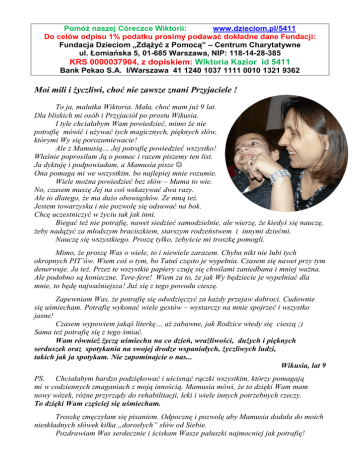 Pomóż naszej Córeczce Wiktorii: www.dzieciom.pl/5411 Do celów odpisu 1% podatku prosimy podawać dokładne dane Fundacji: Fundacja Dzieciom „Zdążyć z Pomocą” – Centrum Charytatywne ul. Łomiańska 5, 01-685 Warszawa, NIP: 118-14-28-385 KRS 0000037904, z dopiskiem: Wiktoria Kazior id 5411 Bank Pekao S.A. I/Warszawa 41 1240 1037 1111 0010 1321 9362 Moi mili i życzliwi, choć nie zawsze znani Przyjaciele ! To ja, malutka Wiktoria. Mała, choć mam już 9 lat. Dla bliskich mi osób i Przyjaciół po prostu Wikusia. I tyle chciałabym Wam powiedzieć, mimo że nie potrafię mówić i używać tych magicznych, pięknych słów, którymi Wy się porozumiewacie! Ale z Mamusią… Jej potrafię powiedzieć wszystko! Właśnie poprosiłam Ją o pomoc i razem piszemy ten list. Ja dyktuję i podpowiadam, a Mamusia pisze J Ona pomaga mi we wszystkim, bo najlepiej mnie rozumie. Wiele można powiedzieć bez słów – Mama to wie. No, czasem muszę Jej na coś wskazywać dwa razy. Ale to dlatego, że ma dużo obowiązków. Ze mną też. Jestem towarzyska i nie pozwolę się odsuwać na bok. Chcę uczestniczyć w życiu tak jak inni. Biegać też nie potrafię, nawet siedzieć samodzielnie, ale wierzę, że kiedyś się nauczę, żeby nadążyć za młodszym braciszkiem, starszym rodzeństwem i innymi dziećmi. Nauczę się wszystkiego. Proszę tylko, żebyście mi troszkę pomogli. Mimo, że proszę Was o wiele, to i niewiele zarazem. Chyba nikt nie lubi tych okropnych PIT’ów. Wiem coś o tym, bo Tatuś często je wypełnia. Czasem się nawet przy tym denerwuje. Ja też. Przez te wszystkie papiery czuję się chwilami zaniedbana i mniej ważna. Ale podobno są konieczne. Tere-fere! Wiem za to, że jak Wy będziecie je wypełniać dla mnie, to będę najważniejsza! Już się z tego powodu cieszę. Zapewniam Was, że potrafię się odwdzięczyć za każdy przejaw dobroci. Cudownie się uśmiecham. Potrafię wykonać wiele gestów – wystarczy na mnie spojrzeć i wszystko jasne! Czasem wypowiem jakąś literkę… aż zabawne, jak Rodzice wtedy się cieszą ;) Sama też potrafię się z tego śmiać. Wam również życzę uśmiechu na co dzień, wrażliwości, dużych i pięknych serduszek oraz spotykania na swojej drodze wspaniałych, życzliwych ludzi, takich jak ja spotykam. Nie zapominajcie o nas... Wikusia, lat 9 PS. Chciałabym bardzo podziękować i uścisnąć rączki wszystkim, którzy pomagają mi w codziennych zmaganiach z moją innością. Mamusia mówi, że to dzięki Wam mam nowy wózek, różne przyrządy do rehabilitacji, leki i wiele innych potrzebnych rzeczy. To dzięki Wam częściej się uśmiecham. Troszkę zmęczyłam się pisaniem. Odpocznę i pozwolę aby Mamusia dodała do moich nieskładnych słówek kilka „dorosłych” słów od Siebie. Pozdrawiam Was serdecznie i ściskam Wasze paluszki najmocniej jak potrafię! Najmilsi ! Zwracamy się do Was z prośbą o wsparcie dla naszej Wiktorii w ramach akcji „Podaruj innym 1%”. Wiktoria jest z nami i jesteśmy szczęśliwi z tego powodu, że udało się ją ocalić. Jej imię, choć wybrane znacznie wcześniej, znakomicie oddaje nasze i jej małe zwycięstwo. W wyniku komplikacji okołoporodowych doszło do dużego niedotlenienia naszej córeczki, wynikiem czego pewne obszary mózgu uległy uszkodzeniu. Po reanimacji i wielotygodniowej intensywnej opiece udało się nam odzyskać dziecko, jednakże jak sama powyżej o Sobie napisała, nasza Wiktoria jest trochę „inna”. Fachowo nazywa się to „Zespołem Westa” (rodzaj dziecięcego porażenia mózgowego, w jednej z najcięższych odmian, z mizernymi, wręcz zerowymi rokowaniami na istotną poprawę). Mimo tych komplikacji Wikusia jest cudowną, mądrą i bardzo towarzyską istotką. To nic, że wymaga stałej rehabilitacji i opieki medycznej oraz 100% zaangażowania czasu jednego z rodziców. Nie skarżymy się, choć bywają czasem ciężkie chwile. Również rodzeństwo Wikusi bardzo ją kocha, szanuje i pomaga na ile potrafi – myślę, że dzięki temu będą kiedyś dobrymi ludźmi. Jeśli to możliwe i uważacie, że warto pomagać innym, zwracamy się z apelem i prośbą o przekazanie właśnie tego 1% z Waszych podatków na cele związane z rehabilitacją Wiktorii. Warto i należy ten przepis wykorzystać – nawet jeśli nie pomagając nam, to komuś innemu. W naszym otoczeniu jest wiele takich osób, często niedostrzeganych, a czasem o zgrozo (!!!) w ramach jakiegoś źle pojętego wstydu czy obaw, nawet ukrywanych przez własne rodziny. Osoby te z reguły same nie potrafią wyrazić swoich uczuć, pragnień i potrzeb. Często również nie dostrzegamy konieczności pomocy innym, dopóki sami nie doświadczymy podobnej sytuacji. Zabiegani i rozkojarzeni mijamy ich. Bywa, że nie spoglądamy w ich kierunku z premedytacją… Oni są tylko trochę „inni”. Dostrzegajmy ich jako ludzi, a nie zazdrośćmy np. miejsca parkingowego… Pozdrawiamy serdecznie, Lucyna i Robert Kazior 606 438 215, [email protected] wdzięczni za każdą pomoc dla Wiktorii, dobre słowo ciepłe myśli My również pomagamy innym. Dzięki Wam jest nam łatwiej i możemy sponsorować imprezy dla osób niepełnosprawnych współfinansując czy fundując nagrody – nigdy nie odmawiamy. Zapraszamy do współpracy Ośrodki Pomocy, Stowarzyszenia i Fundacje: www.medale.pl Subkonto Wiktorii prowadzi : FUNDACJA DZIECIOM „ZDĄŻYĆ Z POMOCĄ”, która posiada status organizacji pożytku publicznego. www.dzieciom.pl/5411 Do celów odpisu 1% podatku należy podawać dokładne dane Fundacji: Fundacja Dzieciom „Zdążyć z Pomocą” – Centrum Charytatywne ul. Łomiańska 5, 01-685 Warszawa, NIP: 118-14-28-385 KRS 0000037904, z dopiskiem: Wiktoria Kazior id 5411 Bank Pekao S.A. I/Warszawa 41 1240 1037 1111 0010 1321 9362 W przypadku innych form pomocy (nie związanych z odliczeniami podatkowymi) możliwa jest również wpłata na konto w banku PKO BP: Robert Kazior, 50 10