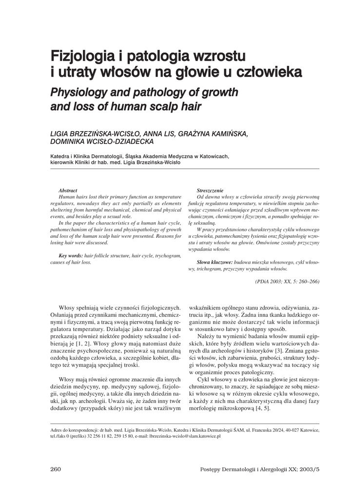 Fizjologia i patologia wzrostu i utraty włosów na głowie u człowieka Physiology and pathology of growth and loss of human scalp hair LIGIA BRZEZIŃSKA-WCISŁO, ANNA LIS, GRAŻYNA KAMIŃSKA, DOMINIKA WCISŁO-DZIADECKA Katedra i Klinika Dermatologii, Śląska Akademia Medyczna w Katowicach, kierownik Kliniki dr hab. med. Ligia Brzezińska-Wcisło Abstract Human hairs lost their primary function as temperature regulators, nowadays they act only partially as elements sheltering from harmful mechanical, chemical and physical events, and besides play a sexual role. In the paper the characteristics of a human hair cycle, pathomechanism of hair loss and physiopathology of growth and loss of the human scalp hair were presented. Reasons for losing hair were discussed. Key words: hair follicle structure, hair cycle, trychogram, causes of hair loss. Streszczenie Od dawna w³osy u cz³owieka straci³y swoj¹ pierwotn¹ funkcjê regulatora temperatury, w niewielkim stopniu zachowuj¹c czynnoœci os³aniaj¹ce przed szkodliwym wp³ywem mechanicznym, chemicznym i fizycznym, a ponadto spe³niaj¹c rolê seksualn¹. W pracy przedstawiono charakterystykê cyklu w³osowego u cz³owieka, patomechanizmy ³ysienia oraz fizjopatologiê wzrostu i utraty w³osów na g³owie. Omówione zosta³y przyczyny wypadania w³osów. S³owa kluczowe: budowa mieszka w³osowego, cykl w³osowy, trichogram, przyczyny wypadania w³osów. (PDiA 2003; XX, 5: 260–266) W³osy spe³niaj¹ wiele czynnoœci fizjologicznych. Os³aniaj¹ przed czynnikami mechanicznymi, chemicznymi i fizycznymi, a trac¹ swoj¹ pierwotn¹ funkcjê regulatora temperatury. Dzia³aj¹c jako narz¹d dotyku przekazuj¹ równie¿ niektóre podniety seksualne i odbieraj¹ je [1, 2]. W³osy g³owy maj¹ natomiast du¿e znaczenie psychospo³eczne, poniewa¿ s¹ naturaln¹ ozdob¹ ka¿dego cz³owieka, a szczególnie kobiet, dlatego te¿ wymagaj¹ specjalnej troski. W³osy maj¹ równie¿ ogromne znaczenie dla innych dziedzin medycyny, np. medycyny s¹dowej, fizjologii, ogólnej medycyny, a tak¿e dla innych dziedzin nauki, jak np. archeologii. Uwa¿a siê, ¿e ¿aden inny twór dodatkowy (przypadek skóry) nie jest tak wra¿liwym wskaŸnikiem ogólnego stanu zdrowia, od¿ywiania, zatrucia itp., jak w³osy. ¯adna inna tkanka ludzkiego organizmu nie mo¿e dostarczyæ tak wielu informacji w stosunkowo ³atwy i dostêpny sposób. Nale¿y tu wymieniæ badania w³osów mumii egipskich, które by³y Ÿród³em wielu wartoœciowych danych dla archeologów i historyków [3]. Zmiana gêstoœci w³osów, ich zabarwienia, gruboœci, struktury ³odygi w³osów, po³ysku mog¹ wskazywaæ na tocz¹cy siê w organizmie proces patologiczny. Cykl w³osowy u cz³owieka na g³owie jest niezsynchronizowany, to znaczy, ¿e s¹siaduj¹ce ze sob¹ mieszki w³osowe s¹ w ró¿nym okresie cyklu w³osowego, a ka¿dy z nich ma charakterystyczn¹ dla danej fazy morfologiê mikroskopow¹ [4, 5]. Adres do korespondencji: dr hab. med. Ligia Brzeziñska-Wcis³o, Katedra i Klinika Dermatologii ŒAM, ul. Francuska 20/24, 40-027 Katowice, tel./faks 0 (prefiks) 32 256 11 82, 259 15 80, e-mail: [email protected] 260 Postêpy Dermatologii i Alergologii XX; 2003/5 Ligia Brzeziñska-Wcis³o, Anna Lis, Gra¿yna Kamiñska, Dominika Wcis³o-Dziadecka 1 anagen katagen telogen 2 3 4 wczesny i œredni anagen nowy anagen Ryc. Przebieg cyklu w³osowego (schemat wg Randal i wsp. J Invest Dermatol, 1993, 101: 114-20) Włos anagenowy – okres wzrostu mieszka W³os anagenowy charakteryzuje siê obecnoœci¹ oderwanej czêœci opuszki zawieraj¹cej barwnik oraz stref¹ keratogenn¹ nieco ciemniej zabarwion¹. W³os rosn¹cy ma najczêœciej obie pochewki – jaœniejsz¹ wewnêtrzn¹ i ciemniejsz¹ zewnêtrzn¹ [6]. Mieszek sk³ada siê z czêœci ektodermalnej (korzeñ, pochewka wewnêtrzna i zewnêtrzna) i z otaczaj¹cej j¹ czêœci mezodermalnej (pochewka ³¹cznotkankowa). Mieszki usytuowane s¹ w skórze skoœnie do jej powierzchni, a ich dolna czêœæ le¿y w tkance podskórnej. Doln¹ czêœæ mieszka tworzy opuszka w³osa, z której powstaje w³os i pochewka wewnêtrzna. Na zewn¹trz od niej znajduje siê pochewka zewnêtrzna, otoczona bezkomórkow¹ b³on¹ szklist¹. Na zewn¹trz od b³ony szklistej obecna jest pochewka ³¹cznotkankowa, a brodawka w³osa jest poni¿ej opuszki. Opuszka ma kszta³t cebulasty, obejmuje brodawkê w³osa od góry i z boków. Podzia³ komórek nastêpuje w dolnej czêœci opuszki le¿¹cej poni¿ej tzw. linii Aubera. Ta dolna czêœæ to macierz w³osa, która charakteryzuje siê wysokim wskaŸnikiem mitotycznym, ka¿da komórka dzieli siê co 23 godz. Pochewka wewnêtrzna sk³ada siê z trzech mocno ze sob¹ zespolonych warstw; wewnêtrznej – os³onki, œrodkowej – warstwy Huxleya i zewnêtrznej – warstwy Henlego [3, 7]. Na pocz¹tku okresu anagenu w komórkach zawi¹zka w³osa wystêpuj¹ bardzo liczne podzia³y. Okres ten zwany jest anagenem I. Nastêpnie niezró¿nicowane 262 komórki zawi¹zka w³osa rosn¹ w dó³, wokó³ wysoko po³o¿onej brodawki i zaczynaj¹ tworzyæ opuszkê – jest to anagen II. Mieszek stopniowo wyd³u¿a siê; opuszka, w której mo¿na ju¿ wyró¿niæ macierz, zostaje ukszta³towana, co odpowiada anagenowi III. Rozpoczyna siê tworzenie w³osa, którego koniec dochodzi do poziomu podstawy gruczo³u ³ojowego – anagen IV, a nastêpnie do powierzchni naskórka – anagen V i wreszcie w³os roœnie ponad naskórkiem – anagen VI. Aktywnoœæ mitotyczna opuszki jest najwiêksza na pocz¹tku anagenu VI [7] (ryc.). Włos katagenowy – okres inwolucji mieszka W³os katagenowy, zale¿nie od okresu fazy inwolucji mo¿e wykazywaæ podobieñstwo albo do w³osa anagenowego, albo do telogenowego. We wczesnym okresie staje siê cieñszy i posiada zanikaj¹ce pochewki, w póŸniejszym okresie wskutek postêpuj¹cego rogowacenia, widoczna jest zarysowuj¹ca siê kolba w³osa telogenowego [3, 8, 9]. W³os katagenowy niekiedy wyrywa siê z kolu