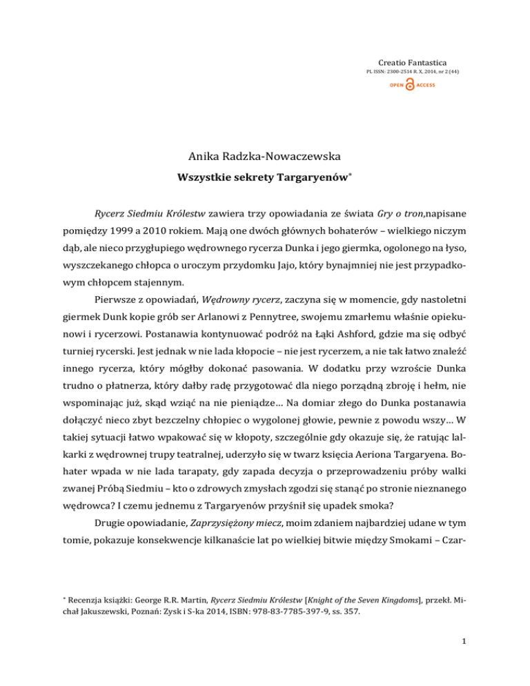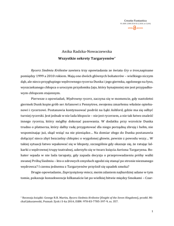 Creatio Fantastica PL ISSN: 2300-2514 R. X, 2014, nr 2 (44) Anika Radzka-Nowaczewska Wszystkie sekrety Targaryenów Rycerz Siedmiu Królestw zawiera trzy opowiadania ze świata Gry o tron,napisane pomiędzy 1999 a 2010 rokiem. Mają one dwóch głównych bohaterów – wielkiego niczym dąb, ale nieco przygłupiego wędrownego rycerza Dunka i jego giermka, ogolonego na łyso, wyszczekanego chłopca o uroczym przydomku Jajo, który bynajmniej nie jest przypadkowym chłopcem stajennym. Pierwsze z opowiadań, Wędrowny rycerz, zaczyna się w momencie, gdy nastoletni giermek Dunk kopie grób ser Arlanowi z Pennytree, swojemu zmarłemu właśnie opiekunowi i rycerzowi. Postanawia kontynuować podróż na Łąki Ashford, gdzie ma się odbyć turniej rycerski. Jest jednak w nie lada kłopocie – nie jest rycerzem, a nie tak łatwo znaleźć innego rycerza, który mógłby dokonać pasowania. W dodatku przy wzroście Dunka trudno o płatnerza, który dałby radę przygotować dla niego porządną zbroję i hełm, nie wspominając już, skąd wziąć na nie pieniądze… Na domiar złego do Dunka postanawia dołączyć nieco zbyt bezczelny chłopiec o wygolonej głowie, pewnie z powodu wszy… W takiej sytuacji łatwo wpakować się w kłopoty, szczególnie gdy okazuje się, że ratując lalkarki z wędrownej trupy teatralnej, uderzyło się w twarz księcia Aeriona Targaryena. Bohater wpada w nie lada tarapaty, gdy zapada decyzja o przeprowadzeniu próby walki zwanej Próbą Siedmiu – kto o zdrowych zmysłach zgodzi się stanąć po stronie nieznanego wędrowca? I czemu jednemu z Targaryenów przyśnił się upadek smoka? Drugie opowiadanie, Zaprzysiężony miecz, moim zdaniem najbardziej udane w tym tomie, pokazuje konsekwencje kilkanaście lat po wielkiej bitwie między Smokami – Czar- Recenzja książki: George R.R. Martin, Rycerz Siedmiu Królestw [Knight of the Seven Kingdoms], przekł. Michał Jakuszewski, Poznań: Zysk i S-ka 2014, ISBN: 978-83-7785-397-9, ss. 357. 1 nym i Czerwonym, czyli buntownikiem i bękartem Daemonem Blackfyre’em a prawowitym władcą. Tym razem Dunk i Jajo najmują się na służbę do lorda Eustace’a, którego ziemie dotknięte są wyjątkową suszą. Gdy postanawiają sprawdzić, dlaczego lokalny strumień gwałtownie wysechł, okazuje się, że sąsiadka zza miedzy, Czerwona Wdowa, pani Zimnej Fosy, która pochowała już czterech mężów, rozkazała zbudować tamę i odcięła dopływ wody lordowi Eustace’owi. Na domiar złego towarzyszący Dunkowi rycerz rani jednego z pilnujących tamy ludzi lady… W tej sytuacji Dunk zostaje wysłany do Czerwonej Wdowy na pertraktacje i jakież jest jego zdumienie, gdy owiana złą sławą kobieta okazuje się drobną, dwudziestopięcioletnią pięknością o rudych włosach. Ponadto lady informuje go, że według testamentu ojca musi jak najszybciej ponownie wyjść za mąż, inaczej straci ziemie na rzecz krewnych. Tłumaczy mu, że bycie panem (a w tym przypadku – panią) na włościach to takie zawody w szczaniu, a kobieta musi w nich szczać dwa razy dalej, jeśli ma dać sobie w nich radę. To opowiadanie jest pełne tego typu smaczków i inteligentnych uwag, czyta się je z ogromną przyjemnością. Intryga jest dość złożona, w klimacie najlepszych pomysłów z Gry o tron, a finał zaskakujący – z pewnością będzie natchnieniem na bardzo dobrą przygodę w rycerskich klimatach na sesji RPG. Trzecie opowiadanie, Tajemniczy rycerz, ponownie rozgrywa się na tle rycerskich popisów, tym razem z okazji ślubu: a do wygrania jest bardzo cenna nagroda – smocze jajo. Rozczarowanie Dunka nie ma granic, gdy już w czasie pierwszego starcia zostaje zwalony z konia ciosem kopii w twarz i przegrywa – musi bowiem oddać triumfatorowi swoją zbroję, miecz i konia. Na domiar złego nie może nigdzie znaleźć Jaja i zaczyna się domyślać, że coś jest nie tak, dopiero gdy jeden z biesiadników usiłuje zabić go przez wrzucenie do studni. Nie bez powodu Arlan mówił o nim „Dunk głupi jak buzdygan”. Czy bohaterom uda się wyjść z tej przygody cało? Mogę zdradzić tylko tyle, że motywacja postaci w tym opowiadaniu jest znów powiązana z bitwą pomiędzy Czarnym i Czerwonym Smokiem. Dunk to bardzo dobry bohater do poprowadzenia z punktu widzenia pisarza – nie wie i nie rozumie zbyt dużo, ale jest szlachetny i honorowy. Czytelnik chętnie podąży za taką postacią i będzie z nią krok po kroku poznawał świat natomiast autor dzięki niezbyt rozwiniętemu intelektowi Dunka będzie mógł zdradzić sekrety intrygi dokładnie wtedy, kiedy będzie chciał. Między innymi dzięki temu to udany tom opowiadań, który zdradza rozliczne sekrety rodu Targaryenów i który z pewnością osłodzi fanom Gry o tron oczeki- 2 wanie na kolejne części cyklu. I przypomina, za co lubimy Martina – za tworzenie barwnych, dających się lubić bohaterów… A oczekiwanie może być długie, bo autor będzie się teraz zajmował piątym i szóstym sezonem serialu HBO. 3