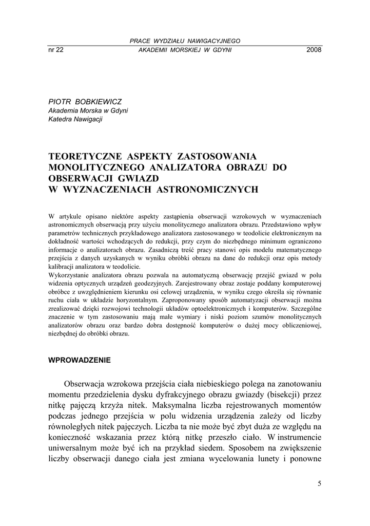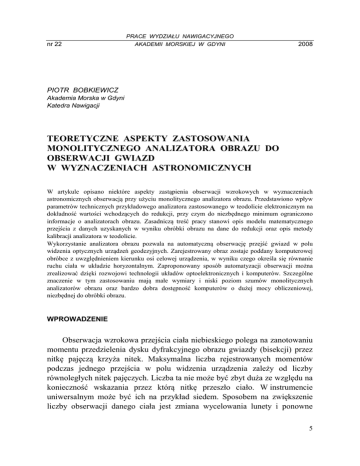 nr 22 PRACE WYDZIAŁU NAWIGACYJNEGO AKADEMII MORSKIEJ W GDYNI 2008 PIOTR BOBKIEWICZ Akademia Morska w Gdyni Katedra Nawigacji TEORETYCZNE ASPEKTY ZASTOSOWANIA MONOLITYCZNEGO ANALIZATORA OBRAZU DO OBSERWACJI GWIAZD W WYZNACZENIACH ASTRONOMICZNYCH W artykule opisano niektóre aspekty zastąpienia obserwacji wzrokowych w wyznaczeniach astronomicznych obserwacją przy użyciu monolitycznego analizatora obrazu. Przedstawiono wpływ parametrów technicznych przykładowego analizatora zastosowanego w teodolicie elektronicznym na dokładność wartości wchodzących do redukcji, przy czym do niezbędnego minimum ograniczono informacje o analizatorach obrazu. Zasadniczą treść pracy stanowi opis modelu matematycznego przejścia z danych uzyskanych w wyniku obróbki obrazu na dane do redukcji oraz opis metody kalibracji analizatora w teodolicie. Wykorzystanie analizatora obrazu pozwala na automatyczną obserwację przejść gwiazd w polu widzenia optycznych urządzeń geodezyjnych. Zarejestrowany obraz zostaje poddany komputerowej obróbce z uwzględnieniem kierunku osi celowej urządzenia, w wyniku czego określa się równanie ruchu ciała w układzie horyzontalnym. Zaproponowany sposób automatyzacji obserwacji można zrealizować dzięki rozwojowi technologii układów optoelektronicznych i komputerów. Szczególne znaczenie w tym zastosowaniu mają małe wymiary i niski poziom szumów monolitycznych analizatorów obrazu oraz bardzo dobra dostępność komputerów o dużej mocy obliczeniowej, niezbędnej do obróbki obrazu. WPROWADZENIE Obserwacja wzrokowa przejścia ciała niebieskiego polega na zanotowaniu momentu przedzielenia dysku dyfrakcyjnego obrazu gwiazdy (bisekcji) przez nitkę pajęczą krzyża nitek. Maksymalna liczba rejestrowanych momentów podczas jednego przejścia w polu widzenia urządzenia zależy od liczby równoległych nitek pajęczych. Liczba ta nie może być zbyt duża ze względu na konieczność wskazania przez którą nitkę przeszło ciało. W instrumencie uniwersalnym może być ich na przykład siedem. Sposobem na zwiększenie liczby obserwacji danego ciała jest zmiana wycelowania lunety i ponowne 5 wykonanie obserwacji przejść. Niektóre urządzenia wyposażone są w mikrometr okularowy, który umożliwia zaobserwowanie bisekcji gwiazdy na nitce ruchowej w dowolnym miejscu pola widzenia. Podobną funkcję spełnia mikrometr kontaktowy, który umożliwia w sposób półautomatyczny rejestrację chwilowego położenia nitki ruchomej. Maksymalna liczba pomiarów jest wówczas ograniczona rozdzielczością kontaktów. Wykorzystanie fotokomórki i kliszy fotograficznej do rejestracji położenia gwiazdy zastępuje obserwacje wzrokowe, pozwalając na zwiększenie liczby obserwacji podczas pojedynczego przejścia. Taki pomiar jest wolny od błędu osobowego [6]. Zastosowanie monolitycznego analizatora obrazu zamiast kliszy fotograficznej wnosi dodatkową wartość jaką jest bezpośredni przepływ danych pomiarowych do jednostki obliczeniowej. Daje to szansę na pełną automatyzację wyznaczeń astronomicznych. Takie rozwiązanie zastosowano w teleskopie zenitalnym skonstruowanym w Institut für Erdmessung na Uniwersytecie Hanowerskim [5]. Wszystkie operacje związane z określeniem pozycji są automatyczne: rejestracja, przesył i analiza danych obrazowych, pomiar czasu polegający na synchronizacji czasu naświetlania z odczytem czasu dostarczanym poprzez sygnał z GPS, obliczanie efemerydy i wykonywanie redukcji, sterowanie lunetą oraz odczyt z przechyłomierzy. Wymienione operacje realizuje jeden komputer, a zadaniem operatora jest transport urządzenia na miejsce pomiaru. Ponadto jasność gwiazd nadających się do obserwacji zmniejszyła się z 10,0m − przy pomiarach z użyciem kliszy, do 14,0m − po zastosowaniu analizatora typu CCD. Wydaje się więc, że użycie monolitycznego analizatora obrazu do obserwacji gwiazd wychodzi naprzeciw wielu oczekiwaniom związanym z automatyzacją pomiarów astronomicznych. W artykule przedstawiono poszczególne aspekty tego zastosowania. 1. MONOLITYCZNY ANALIZATOR OBRAZU Monolityczny analizator obrazu jest urządzeniem optoelektronicznym służącym do detekcji obrazu i przetworzenia go na zapis elektryczny. Tworzy go grupa detektorów optycznych, ułożonych jeden obok drugiego w jednej płaszczyźnie oraz układy elektroniczne wykonujące różne funkcje związane z przetwarzaniem sygnałów z detektorów (na przykład odczytujące wartość sygnału). Detektory (piksele) są ułożone w sposób regularny, najczęściej tworząc kolumny i wiersze, a położenie w kolumnie i wierszu względem krawędzi matrycy jest znane. Obraz powstaje poprzez złożenie kwantowanej informacji o zgromadzonym ładunku z poszczególnych detektorów. Na wyjściu z urządzenia obraz ma formę sygnału elektrycznego. Wyróżnia się dwa typy 6 tych urządzeń: przetworniki CCD (Charge-Coupled Device − urządzenie o sprzężeniu ładunkowym) i CMOS (Complementary Metal-Oxide-Semiconductor Imager − komplementarny układ obrazujący metal-tlenek-półprzewodnik). Różnią się one budową i funkcjonalnością, natomiast z punktu widzenia opracowania danych cyfrowych z analizatora, różnice między tymi typami są niewielkie. Określenie „monolityczny analizator obrazu” używa się w tej pracy zamiennie z określeniem „matryca” − w związku z uzyskanym obrazem. Piksel, przeważnie kwadratowy lub prostokątny, posiada długość boków mieszczącą się w granicach od 2,5 do μm 20 . W produkowanych obecnie urządzeniach, liczba pikseli w pojedynczej matrycy dochodzi do 60 milionów. Tylko część piksela jest światłoczuła. W urządzeniach CCD obszary nieczułe na promienie świetlne tworzą linie rozdzielające obszary światłoczułe. Ich szerokość jest zależna od budowy i wynosi 1/3 lub 1/4 wymiaru piksela. W CMOS obszar światłoczuły zajmuje zwarty obszar o powierzchni do 50% piksela, stąd też szerokość obs