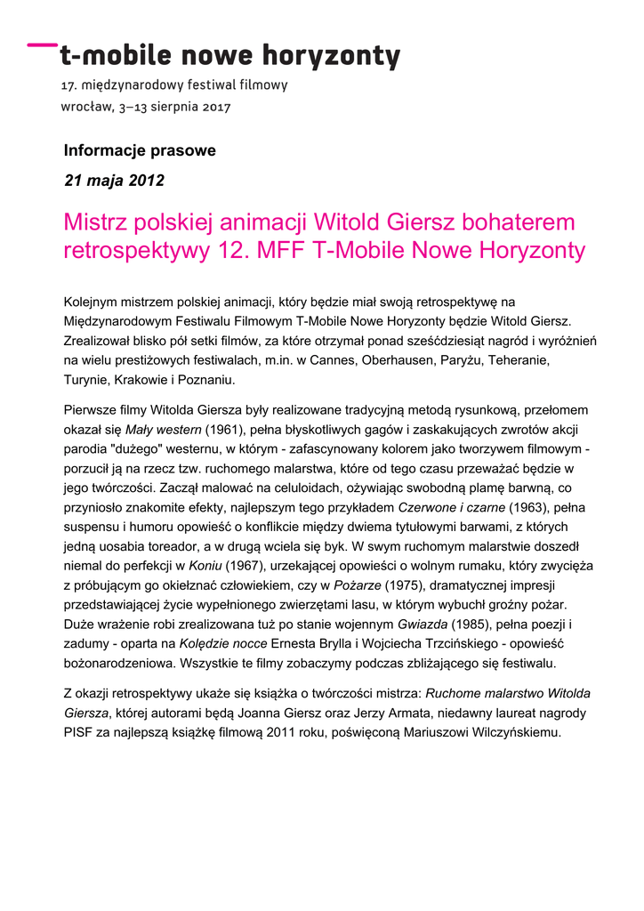 Informacje prasowe 21 maja 2012 Mistrz polskiej animacji Witold Giersz bohaterem retrospektywy 12. MFF T-Mobile Nowe Horyzonty Kolejnym mistrzem polskiej animacji, który będzie miał swoją retrospektywę na Międzynarodowym Festiwalu Filmowym T-Mobile Nowe Horyzonty będzie Witold Giersz. Zrealizował blisko pół setki filmów, za które otrzymał ponad sześćdziesiąt nagród i wyróżnień na wielu prestiżowych festiwalach, m.in. w Cannes, Oberhausen, Paryżu, Teheranie, Turynie, Krakowie i Poznaniu. Pierwsze filmy Witolda Giersza były realizowane tradycyjną metodą rysunkową, przełomem okazał się Mały western (1961), pełna błyskotliwych gagów i zaskakujących zwrotów akcji parodia "dużego" westernu, w którym - zafascynowany kolorem jako tworzywem filmowym porzucił ją na rzecz tzw. ruchomego malarstwa, które od tego czasu przeważać będzie w jego twórczości. Zaczął malować na celuloidach, ożywiając swobodną plamę barwną, co przyniosło znakomite efekty, najlepszym tego przykładem Czerwone i czarne (1963), pełna suspensu i humoru opowieść o konflikcie między dwiema tytułowymi barwami, z których jedną uosabia toreador, a w drugą wciela się byk. W swym ruchomym malarstwie doszedł niemal do perfekcji w Koniu (1967), urzekającej opowieści o wolnym rumaku, który zwycięża z próbującym go okiełznać człowiekiem, czy w Pożarze (1975), dramatycznej impresji przedstawiającej życie wypełnionego zwierzętami lasu, w którym wybuchł groźny pożar. Duże wrażenie robi zrealizowana tuż po stanie wojennym Gwiazda (1985), pełna poezji i zadumy - oparta na Kolędzie nocce Ernesta Brylla i Wojciecha Trzcińskiego - opowieść bożonarodzeniowa. Wszystkie te filmy zobaczymy podczas zbliżającego się festiwalu. Z okazji retrospektywy ukaże się książka o twórczości mistrza: Ruchome malarstwo Witolda Giersza, której autorami będą Joanna Giersz oraz Jerzy Armata, niedawny laureat nagrody PISF za najlepszą książkę filmową 2011 roku, poświęconą Mariuszowi Wilczyńskiemu.