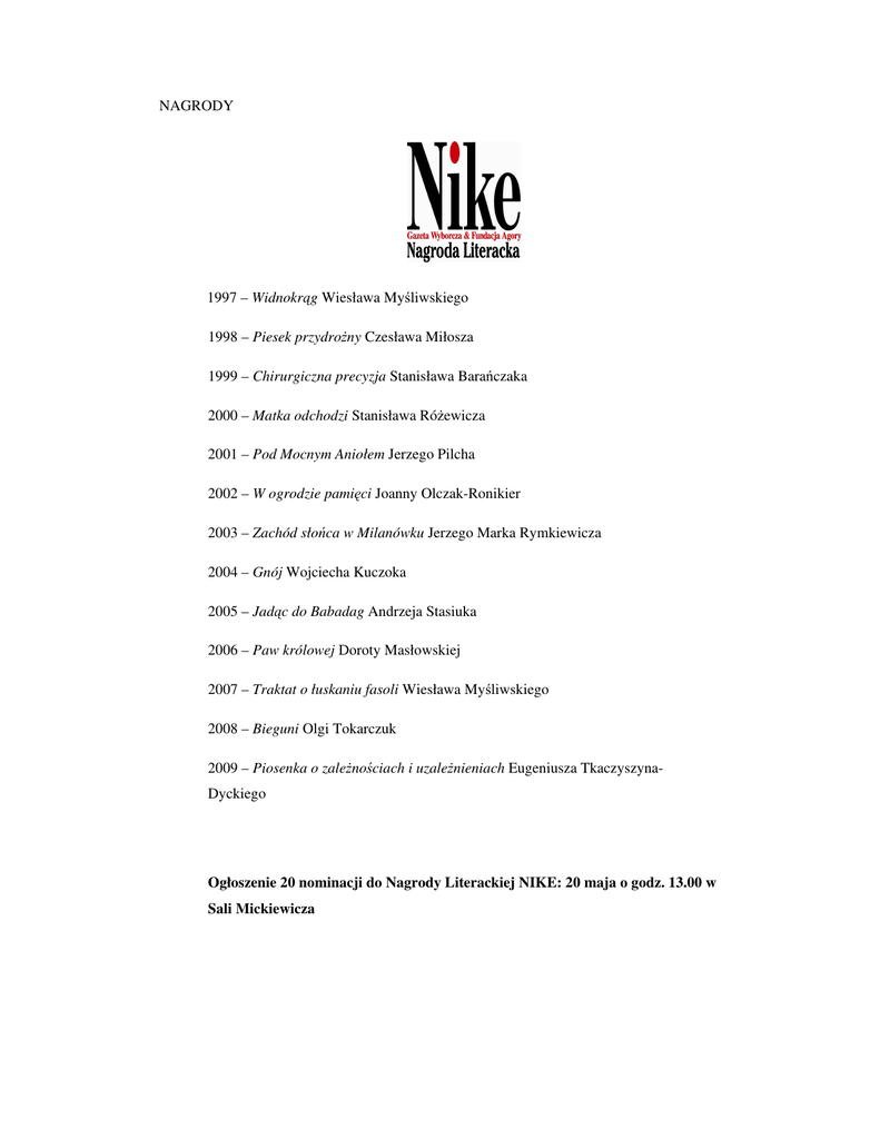NAGRODY 1997 – Widnokr g Wiesława My liwskiego 1998 – Piesek przydro ny Czesława Miłosza 1999 – Chirurgiczna precyzja Stanisława Bara czaka 2000 – Matka odchodzi Stanisława Ró ewicza 2001 – Pod Mocnym Aniołem Jerzego Pilcha 2002 – W ogrodzie pami ci Joanny Olczak-Ronikier 2003 – Zachód sło ca w Milanówku Jerzego Marka Rymkiewicza 2004 – Gnój Wojciecha Kuczoka 2005 – Jad c do Babadag Andrzeja Stasiuka 2006 – Paw królowej Doroty Masłowskiej 2007 – Traktat o łuskaniu fasoli Wiesława My liwskiego 2008 – Bieguni Olgi Tokarczuk 2009 – Piosenka o zale no ciach i uzale nieniach Eugeniusza TkaczyszynaDyckiego Ogłoszenie 20 nominacji do Nagrody Literackiej NIKE: 20 maja o godz. 13.00 w Sali Mickiewicza NAGRODA LITERACKA GDYNIA • proza 2006 Lubiewo Michała Witkowskiego 2007 Traktat o łuskaniu fasoli Wiesława My liwskiego 2008 Ostatni zlot aniołów Mariana Pankowskiego 2009 Jedena cie Marcina wietlickiego • poezja 2006 Dzieje rodzin polskich Eugeniusza Tkaczyszyna-Dyckego 2007 Pełne morze Wojciecha Bonowicza 2008 Pensum Adama Wiedemanna 2009 Piosenka o zale no ciach i uzale nieniach Eugeniusza Tkaczyszyna-Dyckiego • eseistyka 2006 Zamiast Marka Zaleskiego 2007 Projekt handlu kabardy skimi ko mi Krzysztofa rody 2008 Twarz Tuwima Piotra Matywieckiego 2009 Inne obrazy Marii Poprz ckiej W 2007 roku Kapituła Magrody Literackiej Gdynia przyznała tak e nagrod Magdalenie Tulli za Skaz . Ogłoszenie nominacji: czwartek 20 maja 2010 roku, godz. 11.30, Sala Goethego PAPIEROWY EKRAN Konkurs na najlepszy serwis internetowy o ksi ce PAPIEROWY EKRAN to przyznawana od 2007 roku nagroda dla najlepszego polskoj zycznego serwisu promuj cego ksi k i czytelnictwo. W konkursie mo e wzi udział ka dy serwis (ksi garnia, wydawnictwo, blog, czasopismo internetowe, portal społeczno ciowy...), którego rol jest promocja literatury i dzielenie si pasj do ksi ek. Serwisy do konkursu mog zgłasza zarówno ich wła ciciele, jak i czytelnicy. Strona konkursu: www.papierowyekran.pl Nagrod Główn przyznaje Kapituła, wybieraj c zwyci zc spo ród nominowanych serwisów. Nagrod Czytelników przyznaj internauci, głosuj c internetowo na ulubione serwisy. 2007 Nagroda Główna: Biuro Literackie www.biuroliterackie.pl Wyró nienie: BiblioNETka www.biblionetka.pl Wyró nienie: Kiedy Byłam Mała www.kiedybylammala.pl 2008 Nagroda Główna: artPAPIER www.artpapier.com.pl Wyró nienie: Ksi ki.tv www.ksiazki.tv Wyró nienie: Prószy ski i S-ka www.proszynski.pl 2009 Nagroda Główna: Niedoczytania www.niedoczytania.pl Wyró nienie: Instytut Ksi ki www.instytutksiazki.pl Wyró nienie: Qlturka www.qlturka.pl Wr czenie nagrody „Papierowy Ekran”: sobota 22 maja, godz. 15.15, Sala Puszkina. NAGRODA MAGELLANA Organizatorem konkursu jest Biblioteka Analiz Sp. z o.o., firma wydawnicza specjalizuj ca si w badaniach rynku wydawniczo-ksi garskiego. Nagroda Magellana została powołana w 2009 roku, aby uhonorowa najbardziej warto ciowe publikacje turystyczne wydane w ubiegłym roku wydawniczym. Nagroda ma by nie tylko wyró nieniem, lecz tak e wa n informacj dla samych turystów, którym coraz trudniej dokona wła ciwego wyboru spo ród kilkunastu tytułów po wi conych tym samym destynacjom. Wr czenie Nagrody Magellana: czwartek, 14.30, Sala Goethego „Przecinek i Kropka” To jedyny tego rodzaju konkurs na polskim rynku – nie tylko ze wzgl du na szeroki zakres rodzajów ksi ek, które bior w nim udział (wszystkie formy literackie, poradniki i ksi ki edukacyjne), ale równie ze wzgl du na sposób wyboru zwyci zcy – najbardziej demokratyczny i obiektywny z mo liwych. Z grona 10 nominowanych tytułów, wytypowanych przez grono ekspertów, to czytelnicy bezpo rednio wybrali najbardziej warto ciow i najpi kniej wydan ksi k przeznaczon dla dzieci w wieku 5–8 lat. Głosowanie trwaj ce od 23 kwietnia do 15 maja odbywało si za po rednictwem wyj tkowego portalu o ksi kach (dla dzieci, rodziców, nauczycieli, bibliotekarzy): www.przecinekikropka.pl. Organizatorem Konkursu na Najlepsz Ksi k Dzieci c „Przecinek i Kropka” jest Empik. Konkurs stanowi dopełnienie akcji edukacyjnej wychowania z ksi k i promocji czytelnictwa „Przecinek i Kropka”, prowadzonej przez Empik od ponad dwóch lat. Rozstrzygni cie Konkursu na Najlepsz Ksi k Dzieci c „Przecinek i kropka” 2009 20 maja, godz. 17.15, Sala Goethego.