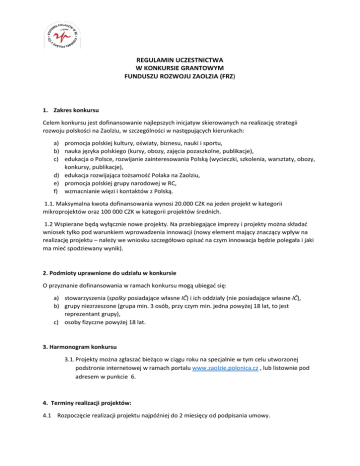 REGULAMIN UCZESTNICTWA W KONKURSIE GRANTOWYM FUNDUSZU ROZWOJU ZAOLZIA (FRZ) 1. Zakres konkursu Celem konkursu jest dofinansowanie najlepszych inicjatyw skierowanych na realizację strategii rozwoju polskości na Zaolziu, w szczególności w następujących kierunkach: a) promocja polskiej kultury, oświaty, biznesu, nauki i sportu, b) nauka języka polskiego (kursy, obozy, zajęcia pozaszkolne, publikacje), c) edukacja o Polsce, rozwijanie zainteresowania Polską (wycieczki, szkolenia, warsztaty, obozy, konkursy, publikacje), d) edukacja rozwijająca tożsamość Polaka na Zaolziu, e) promocja polskiej grupy narodowej w RC, f) wzmacnianie więzi i kontaktów z Polską. 1.1. Maksymalna kwota dofinansowania wynosi 20.000 CZK na jeden projekt w kategorii mikroprojektów oraz 100 000 CZK w kategorii projektów średnich. 1.2 Wspierane będą wyłącznie nowe projekty. Na przebiegające imprezy i projekty można składać wniosek tylko pod warunkiem wprowadzenia innowacji (nowy element mający znaczący wpływ na realizację projektu – należy we wniosku szczegółowo opisać na czym innowacja będzie polegała i jaki ma mieć spodziewany wynik). 2. Podmioty uprawnione do udziału w konkursie O przyznanie dofinansowania w ramach konkursu mogą ubiegać się: a) stowarzyszenia (spolky posiadające własne IČ) i ich oddziały (nie posiadające własne IČ), b) grupy niezrzeszone (grupa min. 3 osób, przy czym min. jedna powyżej 18 lat, to jest reprezentant grupy), c) osoby fizyczne powyżej 18 lat. 3. Harmonogram konkursu 3.1. Projekty można zgłaszać bieżąco w ciągu roku na specjalnie w tym celu utworzonej podstronie internetowej w ramach portalu www.zaolzie.polonica.cz , lub listownie pod adresem w punkcie 6. 4. Terminy realizacji projektów: 4.1 Rozpoczęcie realizacji projektu najpóźniej do 2 miesięcy od podpisania umowy. 4.2. Zakończenie realizacji maksymalnie 12 miesięcy od rozpoczęcia dla mikroprojektów oraz 36 miesięcy od rozpoczęcia dla średnich projektów. 4.3 Dostarczenie sprawozdania z realizacji projektu oraz rozliczenie przyznanych środków do 2 miesięcy od zakończenia projektu na odpowiednim formularzu. 4.4. W wypadku średnich projektów dostarczenie bieżących informacji o przebiegu projektu i wykorzystaniu środków do 15 lutego danego roku. 5. Sposób składania wniosków i rozliczenia: 6.1.Wniosek należy wysłać mailem na podstronę internetową przy portalu www.zaolzie.polonica.cz lub listownie na podany poniżej adres Kongresu Polaków. 6.2. Sprawozdanie i rozliczenie projektu należy wysłać pod adresem: Kongres Polaków w RC, Komenskiego 4, Czeski Cieszyn 737 01 6. Wymogi merytoryczne dotyczące wniosków Do wsparcia nie zostaną zakwalifikowane wnioski dotyczące: - bezpośredniej promocji wnioskodawcy, - zbiórek rzeczowych i finansowych, - projektów lub ich elementów zakładające przeprowadzenie kampanii o charakterze politycznym, lobbingu oraz zbierania podpisów pod petycjami do władz centralnych lub samorządowych, 7. Warunki finansowe 7.1 W każdym wniosku należy wykazać wkład własny stanowiący minimum 10 % całkowitego budżetu projektu. 7.2 Na wkład własny mogą składać się środki finansowe własne, środki finansowe pochodzące z innych źródeł, wkład rzeczowy, praca wolontariuszy. 7.3 Koszty muszą być uzasadnione, realistyczne i bezpośrednio związane z działaniami projektowymi. 7.4 Do wsparcia kwalifikują się: a) koszty osobowe - wynagrodzenia osób merytorycznie zaangażowanych w realizację projektu, koszty honorariów dla artystów, wykładowców itp., b) odpowiednie koszty wyżywienia i zakwaterowania (dokładnie sprecyzować ilość, cenę i powiązanie z działaniami projektu), c) koszty wynajmu pomieszczeń, sprzętu, środka transportu, usług niezbędnych do realizacji projektu, d) koszty promocji projektu, e) zakup niezbędnych towarów związanych bezpośrednio z realizacją projektu, f) zakup drobnego wyposażenia, sprzętu (do 5.000 CZK). 7.7 Do wsparcia nie kwalifikują się (nie mogą być częścią budżetu jako wkład własny): a) zwrot z kapitału, b) zadłużenie i koszt obsługi zadłużenia, c) odsetki od zadłużenia, d) straty związane z wymianą walut, e) koszty administracyjne (koszty związane z prowadzeniem biura, materiały kancelaryjne nie związane bezpośresdnio z realizacją projektu), f) pensje pracowników organizacji, g) koszty reprezentacyjne (np. usługi cateringowe, zakup kwiatów, wieńców, upominki itd.), i) koszty ubezpieczenia, j) koszty zakupu napojów alkoholowych. 8. Procedura wyboru wniosków 8.1 Oceny wniosków dokonuje Komisja Grantowa mianowana przez Radę KP 8.2 Komisja ocenia przede wszystkim spełnienie warunków merytorycznych: 8.2.1 Zgodność celów szczegółowych projektu i planowanych działań z zakresem tematycznym konkursu. 8.2.2 Adekwatność metod działania. 8.2.3 Realistyczność wykonania planowanych działań. 8.2.4 Mierzalność rezultatów i ich znaczenie dla rozwoju polskości na zaolziu i polaków w RC. 8.2.5 Gospodarne, rzetelne i przejrzyste opracowanie budżetu projektu. 8.3 Komisja nie wraca nadesłanych wniosków. 9. Dofinansowanie i rozliczenie: 9.1 Wnioskodawcy, którzy otrzymają dofinansowanie projektu, będą zobowiązani do udostępnienia wyników projektu na specjalnej podstronie internetowej portalu www.zaolzie.polonica.cz 9.2 Wnioskodawca ma obowiązek informowania podczas realizacji projektu i w związanych z nim publikacjach o tym, że projekt jest finansowany z FRZ przy KP. 9.3 Dotacje będą wypłacane na rachunek bankowy w jednej transzy, niezwłocznie po podpisaniu przez obie strony umowy dotacji. 9.4 Do rozliczenia należy przesłać: a) Sprawozdanie finansowe wraz z kopiami rachunków (grupy niezrzeszone przesyłają oryginały). b) Sprawozdanie merytoryczne wraz z fotografiami, materiałami propagacyjnymi (plakaty, ulotki), wycinkami z prasy. 9.5 Rachunki (faktury, umowy) w przypadku grup niezrzeszonych prowadzone 