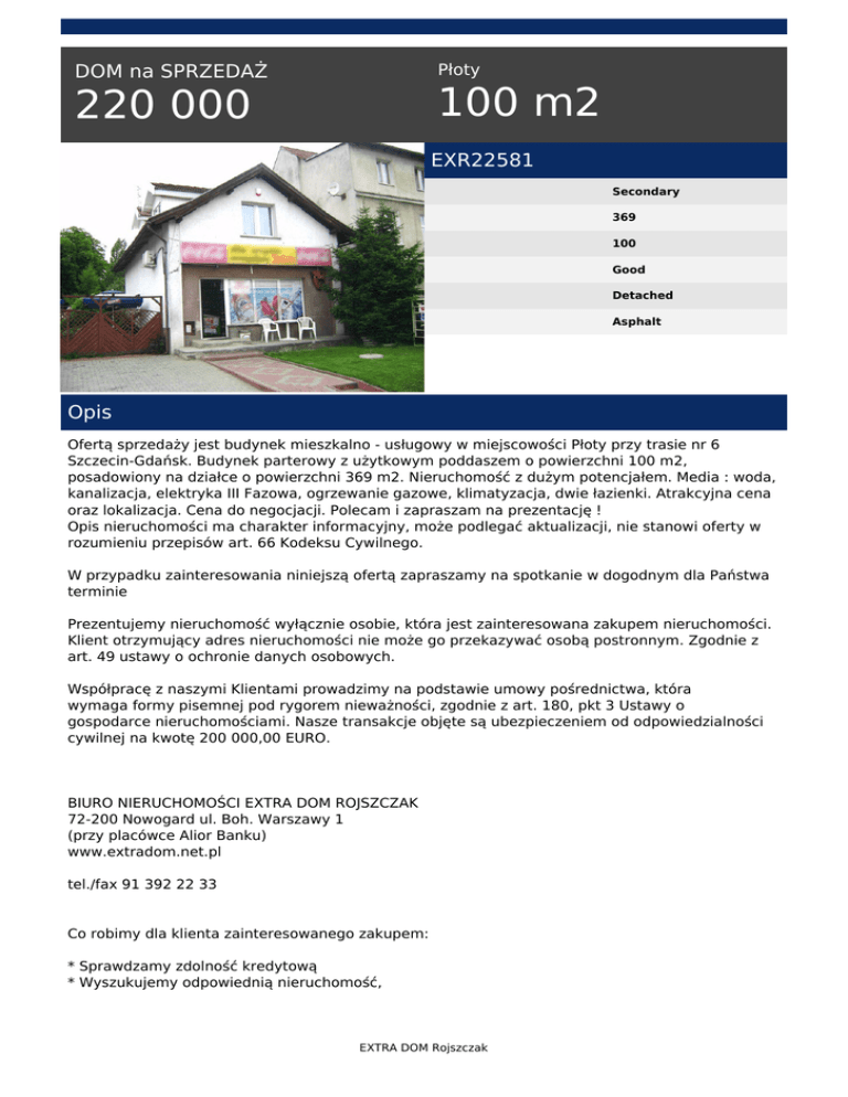 Płoty DOM na SPRZEDAŻ 100 m2 220 000 EXR22581 Secondary 369 100 Good Detached Asphalt Opis Ofertą sprzedaży jest budynek mieszkalno - usługowy w miejscowości Płoty przy trasie nr 6 Szczecin-Gdańsk. Budynek parterowy z użytkowym poddaszem o powierzchni 100 m2, posadowiony na działce o powierzchni 369 m2. Nieruchomość z dużym potencjałem. Media : woda, kanalizacja, elektryka III Fazowa, ogrzewanie gazowe, klimatyzacja, dwie łazienki. Atrakcyjna cena oraz lokalizacja. Cena do negocjacji. Polecam i zapraszam na prezentację ! Opis nieruchomości ma charakter informacyjny, może podlegać aktualizacji, nie stanowi oferty w rozumieniu przepisów art. 66 Kodeksu Cywilnego. W przypadku zainteresowania niniejszą ofertą zapraszamy na spotkanie w dogodnym dla Państwa terminie Prezentujemy nieruchomość wyłącznie osobie, która jest zainteresowana zakupem nieruchomości. Klient otrzymujący adres nieruchomości nie może go przekazywać osobą postronnym. Zgodnie z art. 49 ustawy o ochronie danych osobowych. Współpracę z naszymi Klientami prowadzimy na podstawie umowy pośrednictwa, która wymaga formy pisemnej pod rygorem nieważności, zgodnie z art. 180, pkt 3 Ustawy o gospodarce nieruchomościami. Nasze transakcje objęte są ubezpieczeniem od odpowiedzialności cywilnej na kwotę 200 000,00 EURO. BIURO NIERUCHOMOŚCI EXTRA DOM ROJSZCZAK 72-200 Nowogard ul. Boh. Warszawy 1 (przy placówce Alior Banku) www.extradom.net.pl tel./fax 91 392 22 33 Co robimy dla klienta zainteresowanego zakupem: * Sprawdzamy zdolność kredytową * Wyszukujemy odpowiednią nieruchomość, EXTRA DOM Rojszczak * Pomagamy w prowadzeniu negocjacji, * Pomagamy w uzyskaniu potrzebnych dokumentów * Pomagamy w uzyskaniu kredytu hipotecznego * Współpracujemy z kancelariami notarialnymi, geodetami Korzystając z naszych usług oszczędzasz swój czas, a także zyskujesz pewność, że Twoja transakcja zostanie przeprowadzona z należytą starannością, w sposób profesjonalny i co najważniejsze - BEZPIECZNY. Nr licencji pośredników: 21317, 21318 Dorota Więzowska tel. 517 770 353 tel. (91) 392 22 33 email: [email protected] EXTRA DOM Rojszczak Powered by TCPDF (www.tcpdf.org)