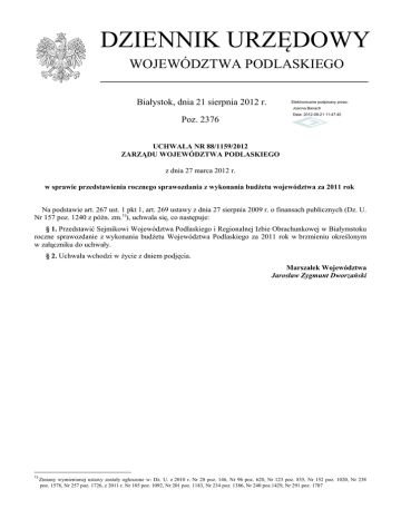 DZIENNIK URZĘDOWY WOJEWÓDZTWA PODLASKIEGO Białystok, dnia 21 sierpnia 2012 r. Elektronicznie podpisany przez: Joanna Banach Data: 2012-08-21 11:47:45 Poz. 2376 UCHWAŁA NR 88/1159/2012 ZARZĄDU WOJEWÓDZTWA PODLASKIEGO z dnia 27 marca 2012 r. w sprawie przedstawienia rocznego sprawozdania z wykonania budżetu województwa za 2011 rok Na podstawie art. 267 ust. 1 pkt 1, art. 269 ustawy z dnia 27 sierpnia 2009 r. o finansach publicznych (Dz. U. Nr 157 poz. 1240 z późn. zm.1)), uchwala się, co następuje: § 1. Przedstawić Sejmikowi Województwa Podlaskiego i Regionalnej Izbie Obrachunkowej w Białymstoku roczne sprawozdanie z wykonania budżetu Województwa Podlaskiego za 2011 rok w brzmieniu określonym w załączniku do uchwały. § 2. Uchwała wchodzi w życie z dniem podjęcia. Marszałek Województwa Jarosław Zygmunt Dworzański 1) Zmiany wymienionej ustawy zostały ogłoszone w: Dz. U. z 2010 r. Nr 28 poz. 146, Nr 96 poz. 620, Nr 123 poz. 835, Nr 152 poz. 1020, Nr 238 poz. 1578, Nr 257 poz. 1726, z 2011 r. Nr 185 poz. 1092, Nr 201 poz. 1183, Nr 234 poz. 1386, Nr 240 poz.1429, Nr 291 poz. 1707 Dziennik Urzędowy Województwa Podlaskiego –2– Poz. 2376 Załącznik Nr 1 do uchwały Nr 88/1159/2012 Zarządu Województwa Podlaskiego z dnia 27 marca 2012 r. Sprawozdanie z wykonania budżetu Województwa Podlaskiego za 2011 rok Białystok 2012 I. Dochody Tabela nr 1: Dochody budżetu województwa za 2011 r. Dział Rozdział Nazwa Plan po zmianach Plan Wykonanie % Paragraf 010 Rolnictwo i łowiectwo 29 427 993,00 40 692 285,00 40 144 550,50 98,7 01005 Prace geodezyjno-urządzeniowe na potrzeby rolnictwa 4 077 593,00 4 076 493,00 2 581 702,43 63,3 0830 Wpływy z usług 3 977 593,00 3 977 593,00 2 482 800,00 62,4 0920 Pozostałe odsetki 0,00 0,00 10,43 2210 Dotacje celowe otrzymane z budżetu państwa na zadania bieżące z zakresu administracji rządowej oraz inne zadania zlecone ustawami realizowane przez samorząd województwa 100 000,00 98 900,00 98 892,00 100,0 01006 Zarządy melioracji i urządzeń wodnych 519 800,00 519 800,00 598 455,92 115,1 0580 Grzywny i inne kary pieniężne od osób prawnych i innych jednostek organizacyjnych 0,00 0,00 23 995,94 X 0690 Wpływy z różnych opłat 0,00 0,00 6 834,90 X 0750 Dochody z najmu i dzierżawy składników majątkowych Skarbu Państwa, jednostek samorządu terytorialnego lub innych jednostek zaliczanych do sektora finansów publicznych oraz innych umów o podobnym charakterze 512 400,00 512 400,00 394 785,31 77,0 0830 Wpływy z usług 0,00 0,00 111 413,74 X 0870 Wpływy ze sprzedaży składników majątkowych 0,00 0,00 5 467,67 X 0920 Pozostałe odsetki 6 000,00 6 000,00 8 034,86 133,9 0970 Wpływy z różnych dochodów 01008 Melioracje wodne 2210 Dotacje celowe otrzymane z budżetu państwa na zadania bieżące z zakresu administracji rządowej oraz inne zadania zlecone ustawami realizowane przez samorząd województwa 2360 Dochody jednostek samorządu terytorialnego związane z realizacją zadań z zakresu administracji rządowej oraz innych zadań zleconych ustawami X 1 400,00 1 400,00 47 923,50 3423,1 17 342 600,00 29 024 328,00 29 033 121,05 100,0 4 275 000,00 15 291 000,00 15 286 171,03 100,0 26 600,00 26 600,00 40 244,24 151,3 6510 Dotacje celowe otrzymane z budżetu państwa na inwestycje i zakupy inwestycyjne z zakresu administracji rządowej oraz inne zadania zlecone ustawami realizowane przez samorząd województwa 2 894 000,00 3 101 257,00 3 101 245,80 100,0 6517 Dotacje celowe otrzymane z budżetu państwa na inwestycje i zakupy inwestycyjne z zakresu administracji rządowej oraz inne zadania zlecone ustawami realizowane przez samorząd województwa 7 610 000,00 7 954 100,00 7 954 094,93 100,0 6519 Dotacje celowe otrzymane z budżetu państwa na inwestycje i zakupy inwestycyjne z zakresu administracji rządowej oraz inne zadania zlecone ustawami realizowane przez samorząd województwa 2 537 000,00 2 651 371,00 2 651 365,05 100,0 01041 Program Rozwoju Obszarów Wiejskich 2007-2013 5 744 000,00 5 044 009,00 4 979 390,42 98,7 0970 Wpływy z różnych dochodów 0,00 0,00 822,84 2218 Dotacje celowe otrzymane z budżetu państwa na zadania bieżące z zakresu administracji rządowej oraz inne zadania zlecone ustawami realizowane przez samorząd województwa 4 252 000,00 3 727 000,00 3 278 800,27 88,0 2219 Dotacje celowe otrzymane z budżetu państwa na zadania bieżące z zakresu administracji rządowej oraz inne zadania zlecone ustawami realizowane przez samorząd województwa 1 418 000,00 1 243 000,00 1 092 938,81 87,9 X Dziennik Urzędowy Województwa Podlaskiego –3– Poz. 2376 Dział Rozdział Nazwa Plan po zmianach Plan Wykonanie % Paragraf 2910 Wpływy ze zwrotów dotacji oraz płatności, w tym wykorzystanych niezgodnie z przeznaczeniem lub wykorzystanych z naruszeniem procedur, o których mowa w art. 184 ustawy, pobranych nienależnie lub w nadmiernej wysokości 0,00 2,00 1,45 72,5 2918 Wpływy ze zwrotów dotacji oraz płatności, w tym wykorzystanych niezgodnie z przeznaczeniem lub wykorzystanych z naruszeniem procedur, o których mowa w art. 184 ustawy, pobranych nienależnie lub w nadmiernej wysokości 0,00 5,00 4,95 99,0 2919 Wpływy ze zwrotów dotacji oraz płatności, w tym wykorzystanych niezgodnie z przeznaczeniem lub wykorzystanych z naruszeniem procedur, o których mowa w art. 184 ustawy, pobranych nienależnie lub w nadmiernej wysokości 0,00 2,00 1,65 82,5 6518 Dotacje celowe otrzymane z budżetu państwa na inwestycje i zakupy inwestycyjne z zakresu administracji rządowej oraz inne zadania zlecone ustawami realizowane przez samorząd województwa 55 000,00 55 000,00 35 592,01 64,7 6519 Dotacje celowe otrzymane z budżetu państwa na inwestycje i zakupy inwestycyjne z zakresu administracji rządowej oraz inne zadania zlecone ustawami realizowane przez samorząd województwa 19 000,00 19 000,00 11 864,01 62,4 8518 Wpływy z różnych rozliczeń 0,00 0,00 419 523,31 X 8519 Wpływy z różnych rozlic