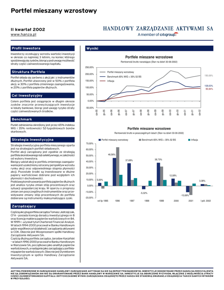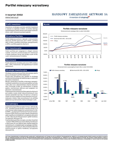 Portfel mieszany wzrostowy II kwartał 2002 www.hanza.pl Profil Inwestora Wyniki Inwestorzy oczekujący wzrostu wartości inwestycji w okresie co najmniej 3 letnim, na koniec którego spodziewają się zysków, biorący pod uwagę możliwość straty części zainwestowanego kapitału. Portfele mieszane wzrostowe Rentowność brutto narastająco (Stan na dzień 30−06−2002) 250,00% Inflacja 108,63% 95,94% 100,00% 50,00% 0,00% cze−02 gru−01 cze−01 gru−00 cze−00 gru−99 cze−99 gru−98 cze−98 gru−97 cze−97 −50,00% gru−96 Celem portfela jest osiągnięcie w długim okresie zysków znacznie przewyższających inwestycje w lokaty bankowe, biorąc pod uwagę ryzyko straty części zainwestowanych środków. 150,00% cze−96 Cel Inwestycyjny 190,06% Benchmark 65% WIG + 35% 52 BS gru−95 Portfel składa się zarówno z akcji jak i z instrumentów dłużnych. Portfel utworzony jest w 50% z portfela akcji, w 30% z portfela zmiennego zaangażowania, w 20% z portfela papierów dłużnych. Portfel mieszany wzrostowy 200,00% cze−95 Struktura Portfela Benchmark Punkt odniesienia określony jest przez 65% indeksu WIG i 35% rentowności 52-tygodniowych bonów skarbowych. Portfele mieszane wzrostowe Rentowność brutto w poszczególnych latach (Stan na dzień 30−06−2002) Strategia Inwestycyjna Strategia inwestycyjna portfela mieszanego oparta jest na strategiach portfeli składowych. Portfel akcji zarządzany jest zgodnie ze strategią portfela skorelowanego lub selektywnego, w zależności od wyboru Inwestora. Bieżący udział akcji w portfelu zmiennego zaangażowania jest uzależniony od oceny perspektyw wzrostu rynku akcji oraz odpowiedniego stopnia płynności akcji. Pozostałe środki są inwestowane w dłużne papiery wartościowe dobrane pod względem ich płynności i dochodowości. Podstawą konstruowania portfela papierów dłużnych jest analiza ryzyka zmian stóp procentowych oraz sytuacji gospodarczej kraju. W oparciu o prognozy zmian cen poszczególnych instrumentów oraz przewidywane zmiany stóp procentowych do portfela dobierane są instrumenty maksymalizujące zyski. Portfel mieszany wzrostowy Benchmark 65% WIG + 35% 52 BS Inflacja 70,00% 60,00% 46,56% 50,00% 38,73% 37,69% 40,00% 30,00% 20,00% 10,00% 12,08% 5,00% 3,38% 0,00% −10,00% −5,32% −10,06% −20,00% od lip 1995 1996 1997 1998 1999 2000 2001 I pół. 2002 Zarządzający Częścią akcyjną portfela zarządza Tomasz Jedrzejczak, CFA – posiada licencję doradcy inwestycyjnego nr 8 oraz licencję maklera papierów wartościowych nr 84. W 1999 r. uzyskał tytuł Chartered Financial Analyst. W latach 1994-2000 pracował w Banku Handlowym gdzie współtworzył działalność zarządzania aktywami w COK. Obecnie jest Wiceprezesem spółki Handlowy Zarządzanie Aktywami SA. Częścią dłużną portfela zarządza Jarosław Karpiński – w latach 1996-2000 pracował w Banku Handlowym w Warszawie SA, początkowo jako analityk papierów wartościowych, a następnie jako zarządzający portfelami papierów wartościowych. Obecnie jest Dyrektorem Inwestycyjnym w spółce Handlowy Zarządzanie Aktywami SA. AKTYWA POWIERZONE W ZARZĄDZANIE HANDLOWY ZARZĄDZANIE AKTYWAMI SA NIE SĄ DEPOZYTEM BANKOWYM. INWESTYCJE DOKONYWANE PRZEZ HANZA NA RZECZ KLIENTA NIE SĄ ZOBOWIĄZANIEM ANI NIE SĄ GWARANTOWANE PRZEZ BANK HANDLOWY W WARSZAWIE SA. INWESTYCJE SĄ OBARCZONE RYZYKIEM, WŁĄCZNIE Z MOŻLIWOŚCIĄ UTRATY CZĘŚCI ZAINWESTOWANEGO KAPITAŁU. DOTYCHCZASOWE WYNIKI ZARZĄDZANIA OSIĄGNIĘTE PRZEZ HANZA NIE STANOWIĄ GWARANCJI OSIĄGNIĘCIA TAKICH SAMYCH WYNIKÓW W PRZYSZŁOŚCI.