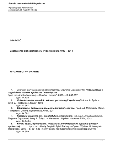 Starość - zestawienie bibliograficzne Wpisany przez Administrator poniedziałek, 05 maja 2014 07:36 - STAROŚĆ Zestawienie bibliograficzne w wyborze za lata 1999 – 2014 WYDAWNICTWA ZWARTE 1. Człowiek stary w placówce penitencjarnej / Sławomir Grzesiak // W: Resocjalizacja : zagadnienia prawne, społeczne i metodyczne / pod red. Anetty Jaworskiej. – Kraków : „Impuls”, 2009. – S. 247-257 sygn. 44.128 2. Człowiek wobec starości : szkice z gerontologii społecznej / Adam A. Zych. – Wyd. 2. – Katowice : „Śląsk”, 1999 sygn. 42.367 3. Edukacyjne, kulturowe i społeczne konteksty starości / pod red. Małgorzaty Malec. – Wrocław : Oficyna Wydawnicza ATUT, 2011 sygn. 44.581 4. Fizjologia starzenia się : profilaktyka i rehabilitacja / red. nauk. Anna Marchewka, Zbigniew Dąbrowski, Jerzy A. Żołądź. – Warszawa : Wydaw. Naukowe PWN, 2012 sygn. 44.748cz 5. Formy opieki, wychowania i wsparcia w zreformowanym systemie pomocy społecznej / pod red. Józefy Brągiel i Sylwii Badory. – Opole : Wydaw. Uniwersytetu Opolskiego, 2005. – S. 531-586 : Formy opieki nad ludźmi starymi i niepełnosprawnymi sygn. 44.559 1/6 Starość - zestawienie bibliograficzne Wpisany przez Administrator poniedziałek, 05 maja 2014 07:36 - 6. Gerontologia społeczna i oświatowa : zarys problematyki / Zofia Szarota. – Kraków : Wydaw. Naukowe Akademii Pedagogicznej, 2004 sygn. 43.608 7. Globalizacja problemów zdrowotnych i starzenia się a rodzina / Zbigniew Woźniak // W: Współczesne rodziny polskie – ich stan i kierunek przemian / pod red. nauk. Zbigniewa Tyszki. – Wyd. 2. – Poznań : Wydaw. Naukowe UAM, 2004. – S. 381-408 sygn. 43.353 8. Instytucje i placówki wspierające starość (na przykładzie Krakowa) / Zofia Szarota // W: Podmioty opieki i wychowania / pod red. Zofii Brańki. – Kraków : Wydaw. Naukowe Akademii Pedagogicznej, 2002. – S. 161-177 sygn. 42.817 9. Jakość życia w starości / Czesław Kustra // W: Niepełnosprawność – w zwierciadle dorosłości / red. nauk. Remigiusz J. Kijak. – Kraków : „Impuls”, 2012. – S. 273-288 sygn. 44.588 10. Leksykon gerontologii / Adam A. Zych. – Kraków : „Impuls”, 2007 sygn. 43.849cz 11. Okres późnej dorosłości. Jak rozpoznać potencjał ludzi w wieku podeszłym? / Joanna Janiszewska-Rain // W: Psychologiczne portrety człowieka / red. Anna I. Brzezińska. – Sopot : Gdańskie Wydaw. Psychologiczne, 2013. – S. 591-622 sygn. 44.761cz 12. Okres późnej dorosłości. Jak rozpoznać ryzyko i jak pomagać? / Anna Izabela Brzezińska i Szymon Hejmanowski // W: Psychologiczne portrety człowieka / red. Anna I. Brzezińska. – Sopot : Gdańskie Wydaw. Psychologiczne, 2013. – S. 623-664 sygn. 44.761cz 13. Pedagog wobec osoby chorego / Elżbieta Jundziłł, Róża Pawłowska. – Gdańsk : Wydaw. Harmonia, 2010. – S. 137-156 : Człowiek stary – choroba, diagnostyka i wsparcie sygn. 44.144 14. Pedagogiczne aspekty opieki paliatywnej / Wojciech Klapa, Iwona Oskędra // W: Pod mioty opieki i wychowania / pod red. Zofii Brańki. – Kraków : Wydaw. Naukowe Akademii Pedagogicznej, 2002. – S. 178-183 sygn. 42.817 15. Pedagogika społeczna wobec problemów człowieka starego / Stanisław Kawula // W: Pedagogika społeczna : dokonania, aktualność, perspektywy / red. nauk. Stanisław Kawula. – Toruń : Wydaw. Adam Marszałek, 2005. – S. 551-564 sygn. 43.601cz 16. Pielęgniarstwo geriatryczne / Josefa Schiefele, Ilse Staudt, M. Margarete Dach. – Wrocław : Wydaw. Medyczne Urban i Partner, 2007 sygn. 43.681 17. Pozytywne starzenie się : młodzi duchem w jesieni życia / Robert D. Hill. – Warszawa : „Laurum”, 2009 sygn. 43.975 18. Późna dorosłość. Wiek starzenia się / oprac. Maria Straś-Romanowska // W: 2/6 Starość - zestawienie bibliograficzne Wpisany przez Administrator poniedziałek, 05 maja 2014 07:36 - Psychologia rozwoju człowieka. [2], Charakterystyka okresów życia człowieka / red. nauk. Barbara Harwas-Napierała, Janusz Trempała. – Warszawa : Wydaw. Naukowe PWN, 2004. – S. 263-288 sygn. 43.074cz, 43.090 19. Przekraczając „smugę cienia” : szkice z gerontologii i tanatologii / Adam A. Zych. – Katowice : „Śląsk”, 2009 sygn. 44.140 20. Przygotowanie do życia na emeryturze : kształcenie wykładowców w ramach współpracy Uniwersytetu Łódzkiego i Uniwersytetu Lumiere / pod red. Barbary Juraś-Krawczyk. – Wyd. 2. – Łódź : Wydaw. Wyższej Szkoły Humanistyczno-Ekonomicznej, 2000 sygn. 43.171 21. Problemy wieku starczego / Anna Kowalewska, Andrzej Jaczewski, Krystyna Komosińska // W: Biologiczne i medyczne podstawy rozwoju i wychowania / pod red. Andrzeja Jaczewskiego. – Wyd. 2 rozsz. – Warszawa : „Żak”, 2003. – S. 290-310 sygn. 44.425 22. Psychologia rozwoju człowieka / Helen Bee. – Poznań : Zysk i S-ka Wydaw., 2004. – S. 543-614 sygn. 43.512cz 23. Psychologia starzenia się : wprowadzenie / Ian Stuart-Hamilton. – Poznań : Zysk i S-ka Wydaw., 2006 sygn. 43.508cz 24. Psychologia starzenia się i starości / Stanisława Steuden. – Warszawa : Wydaw. Naukowe PWN, 2011 sygn. 44.407 25. Psychologiczne wyznaczniki przeżywanej starości (psychoneuroimmunologia starości) / Grażyna Łój. – Mysłowice : GWSP im. Kardynała Augusta Hlonda, 2007 sygn. 44.200 26. Rodzina miejscem apostolatu ludzi w podeszłym wieku / Wiesław Przygoda // W: Rod zina wobec współczesnych wyzwań społeczno-kulturowych / red. Julia Gorbaniuk, Beata Parysiewicz. – Lublin : Wydaw. KUL, 2009. – S. 203-212 sygn. 43.978 27. Samobójstwo wieku starszego / Barbara Pilecka // W: Przemoc i marginalizacja : patologie społecznego dyskursu / pod red. Przemysława Piotrowskiego. – Warszawa : „Żak”, 2004. – S. 129-144 sygn. 42.963 28. Senior w domu : opieka długoterminowa nad niesprawnym seniorem / red. nauk. Jolanta Twardowska-Rajewska. – Poznań : Wydaw. Naukowe Uniwersytetu im. A. Mickiewicza, 2007 sygn. 43.859 29. Słownik gerontologii spo