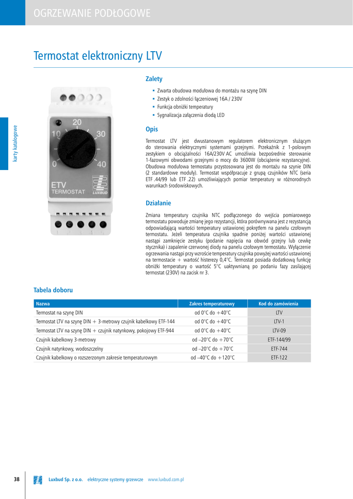 OGRZEWANIE PODŁOGOWE Termostat elektroniczny LTV Zalety Zwarta obudowa modułowa do montażu na szynę DIN Zestyk o zdolności łączeniowej 16A / 230V Funkcja obniżki temperatury karty katalogowe Sygnalizacja załączenia diodą LED Opis Termostat LTV jest dwustanowym regulatorem elektronicznym służącym do sterowania elektrycznymi systemami grzejnymi. Przekaźnik z 1-polowym zestykiem o obciążalności 16A/230V AC umożliwia bezpośrednie sterowanie 1-fazowymi obwodami grzejnymi o mocy do 3600W (obciążenie rezystancyjne). Obudowa modułowa termostatu przystosowana jest do montażu na szynie DIN (2 standardowe moduły). Termostat współpracuje z grupą czujników NTC (seria ETF .44/99 lub ETF .22) umożliwiających pomiar temperatury w różnorodnych warunkach środowiskowych. Działanie Zmiana temperatury czujnika NTC podłączonego do wejścia pomiarowego termostatu powoduje zmianę jego rezystancji, która porównywana jest z rezystancją odpowiadającą wartości temperatury ustawionej pokrętłem na panelu czołowym termostatu. Jeżeli temperatura czujnika spadnie poniżej wartości ustawionej nastąpi zamknięcie zestyku (podanie napięcia na obwód grzejny lub cewkę stycznika) i zapalenie czerwonej diody na panelu czołowym termostatu. Wyłączenie ogrzewania nastąpi przy wzroście temperatury czujnika powyżej wartości ustawionej na termostacie + wartość histerezy 0,4°C. Termostat posiada dodatkową funkcję obniżki temperatury o wartość 5°C uaktywnianą po podaniu fazy zasilającej termostat (230V) na zacisk nr 3. Tabela doboru Nazwa 38 Zakres temperaturowy Kod do zamówienia Termostat na szynę DIN od 0°C do +40°C LTV Termostat LTV na szynę DIN + 3-metrowy czujnik kabelkowy ETF-144 od 0°C do +40°C LTV-1 Termostat LTV na szynę DIN + czujnik natynkowy, pokojowy ETF-944 od 0°C do +40°C LTV-09 Czujnik kabelkowy 3-metrowy od –20°C do +70°C ETF-144/99 Czujnik natynkowy, wodoszczelny od –20°C do +70°C ETF-744 Czujnik kabelkowy o rozszerzonym zakresie temperaturowym od –40°C do +120°C ETF-122 Luxbud Sp. z o.o. elektryczne systemy grzewcze www.luxbud.com.pl OGRZEWANIE PODŁOGOWE Dane techniczne LTV Napięcie zasilania 230V AC ±10%, 50/60 Hz Pobór mocy 3VA od 0°C do +40°C Zestyk karty katalogowe Zakres regulacji SPST 16A / 230V AC Przekrój zacisków 2,5 mm2 Przekrój zacisków PE brak Histereza 0,4°C Obniżka temperatury (z zewnętrznego zegara) Stała o 5°C Stopień ochrony IP20 Temperatura pracy 0°C /+50°C Max. temperatura czujnika +70°C (ETF .44/99) lub +120°C (ETF .22) Min. temperatura czujnika –20°C (ETF .44/99) lub –40°C (ETF .22) Wymiary (wys. x szer. x głęb.) 86 x 36 x 58 mm Wymiary i schemat podłączeń 29 36 6 7 1 2 55 86 60 45 CZUJNIK LTV 19 58 10 3 Obniżka L N 4 5 Obwód grzejny lub stycznik Napięcie sterujące obniżką musi być podawane z tej samej fazy co napięcie zasilające termostat. www.luxbud.com.pl elektryczne systemy grzewcze Luxbud Sp. z o.o. 39