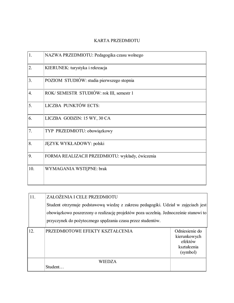KARTA PRZEDMIOTU 1. NAZWA PRZEDMIOTU: Pedagogika czasu wolnego 2. KIERUNEK: turystyka i rekreacja 3. POZIOM STUDIÓW: studia pierwszego stopnia 4. ROK/ SEMESTR STUDIÓW: rok III, semestr 1 5. LICZBA PUNKTÓW ECTS: 6. LICZBA GODZIN: 15 WY, 30 CA 7. TYP PRZEDMIOTU: obowiązkowy 8. JĘZYK WYKŁADOWY: polski 9. FORMA REALIZACJI PRZEDMIOTU: wykłady, ćwiczenia 10. WYMAGANIA WSTĘPNE: brak 11. ZAŁOŻENIA I CELE PRZEDMIOTU Student otrzymuje podstawową wiedzę z zakresu pedagogiki. Udział w zajęciach jest obowiązkowo poszerzony o realizację projektów poza uczelnią. Jednocześnie stanowi to przyczynek do pożytecznego spędzania czasu przez studentów. 12. PRZEDMIOTOWE EFEKTY KSZTAŁCENIA WIEDZA Student… Odniesienie do kierunkowych efektów kształcenia (symbol) P_W01 zna uwarunkowania zdrowego stylu życia, rozumie funkcje edukacji zdrowotnej K_W02 P_W02 zna psychologiczne podstawy kształtowania zachowań ludzkich, rozumie mechanizmy psychospołeczne K_W05 UMIEJĘTNOŚCI P_U01 potrafi przygotować osoby do racjonalnego spędzania czasu wolnego K_U07 P_U02 potrafi wyrazić własną opinię w ważnych sprawach zawodowych, światopoglądowych K_U16 P_U03 posiada umiejętność rozumienia psychicznych, społecznych mechanizmów podejmowania aktywności K_U17 KOMPETENCJE SPOŁECZNE P_K01 potrafi pracować w grupie przyjmując w niej różne role, jest odpowiedzialny za swoje działanie i zachowanie osób powierzonych jego opiece K_K05 P_K02 potrafi zainteresować innych przekazywaną wiedzą K_K07 P_K03 rozumie potrzebę uczenia się przez całe życie K_K08 13. METODY OCENY EFEKTÓW KSZTAŁCENIA Symbol przedmiotowego efektu kształcenia P_W01 Metody (sposoby) oceny końcowe Typ oceny Forma dokumentacji zaliczenie podsumowująca kolokwium zaliczenie podsumowująca kolokwium pisemne P_W02 końcowe pisemne P_U01 projekt formująca praca pisemna P_U02 śródsemestralne podsumowująca praca pisemna zaliczenie ustne P_U03 końcowe zaliczenie podsumowująca kolokwium pisemne P_K01 ocenianie ciągłe formująca kontrola obecności P_K02 projekt P_K03 końcowe formująca praca pisemna zaliczenie podsumowująca kolokwium pisemne 14. KRYTERIA OCENY OSIĄGNIĘTYCH EFEKTÓW KSZTAŁCENIA (opisowe, procentowe, punktowe, inne ……………………………. formy oceny do wyboru przez wykładowcę) EFEKTY KSZTAŁCENIA NA OCENĘ NA OCENĘ NA OCENĘ NA OCENĘ NA OCENĘ 3,0 3,5 4.0 4,5 5,0 P_W01 51-60% 61-70% 71-80% 81-90% 90-100% P_W02 51-60% 61-70% 71-80% 81-90% 90-100% P_U01 51-60% 61-70% 71-80% 81-90% 90-100% P_U02 51-60% 61-70% 71-80% 81-90% 90-100% P_U03 51-60% 61-70% 71-80% 81-90% 90-100% P_K01 51-60% 61-70% 71-80% 81-90% 90-100% P_K02 51-60% 61-70% 71-80% 81-90% 90-100% P_K03 51-60% 61-70% 71-80% 81-90% 90-100% 15. WARUNKI UZYSKANIA ZALICZENIA PRZEDMIOTU: 16. Osiągnięcie założonych efektów kształcenia i pozytywny wynik zaliczenia egzaminu pisemnego egzaminu ustnego egzaminu praktycznego egzaminu końcowego ……………………… TREŚCI PROGRAMOWE Symbol Forma przedmiotowych zajęć (liczba efektów kształcenia godz.) Treść zajęć Wykłady 1. Osobowość dojrzała 1 P_W02 P_K03 2. Przedmiot pedagogiki 1 P_W02 3. Pojęcie wychowania. Cel procesu wychowania 1 P_W02 4. Funkcje wychowania w życiu ludzkim 1 P_W02 5. Wychowanie w rodzinie. Funkcje rodziny 1 P_W02 P_K01 6. Wychowanie w szkole 3 P_W02 P_K01 7. Wspomaganie rozwoju człowieka 1 P_K01 P_U03 8. Wychowanie przez sztukę 1 P_K02 P_W01 9. Wychowanie przez sport i wypoczynek 2 P_W01 10. Wychowanie zdrowotne 2 P_W01 11. Zdrowie psychiczne a wartości 1 P_W01 Ćwiczenia 1. Rozwój człowieka 2 P_W02 2. Aspekty czasu wolnego 2 P_W01 3. Wartość czasu wolnego 2 P_U01 4. Sposoby i formy spędzania czasu wolnego 4 P_U01 5. Funkcje czasu wolnego 2 P_U01 P_K02 6. Zalety czasu wolnego 2 P_U02 7. Czas wolny kulturalny; czas wolny szkodliwy 2 P_W01 8. Organizacja czasu wolnego 2 P_K02 9. Znaczenie wychowawcze i zdrowotne czasu wolnego 2 P_U01 10. Wychowanie a wartości ( odpowiedzialność, współdziałanie, wolność, dobro, miłość Ojczyzny ) 10 P_U02 17. P_K03 METODY DYDAKTYCZNE: wykład nauczyciela, ćwiczenia, praca samodzielna, lektura własna, dyskusja 18. LITERATURA PODSTAWOWA I UZUPEŁNIAJĄCA: Czajkowski K. „ Wychowanie do rekreacji” „ Encyklopedia pedagogiczna XXI wieku” t. I Godlewski M. ( red. ) „ Pedagogika” Kamiński A. „ Czas wolny i jego problematyka społeczno-wychowawcza” Kunowski S. „ Postawy współczesnej pedagogiki” Matias S. „ Problematyka organizacji czasu wolnego dzieci i młodzieży” Suchodolski B. ( red. ) „ Pedagogika” t. 2 Sujak E. „ Rozważania o ludzkim rozwoju” Tatarkiewicz Wł. „ O szczęściu” 19. OBCIĄŻENIE PRACĄ STUDENTA Forma aktywności Rodzaj zajęć Liczba godzin na zrealizowanie aktywności w semestrze przedmiotu: 15 Realizacja przedmiotu: Zajęcia ćwiczenia wymagające Realizacja przedmiotu: udziału prowadzącego laboratoria 30 Realizacja wykłady Egzamin Godziny kontaktowe nauczycielem konsultacje z 15 ……………… ………………. Łączna liczba godzin zajęć realizowanych z udziałem prowadzącego (pkt. a +b + c + d + e…) 60 h) Przygotowanie się do zajęć i) Przygotowanie się do zaliczeń/kolokwiów j) Przygotowanie się do egzaminu/zaliczenia a) b) końcowego c) k) Wykonanie zadań poza uczelnią l) ………………… Łączna liczba godzin zajęć realizowanych we własnym zakresie (pkt. h + i +j + k + l …) Samokształce nie Razem godzin (zajęcia z udziałem prowadzącego + samokształcenie) Liczba punktów ECTS 20. PROWADZĄCY PRZEDMIOT (IMIĘ, NAZWISKO, ADRES E-MAIL, INSTYTUT, NR POKOJU KONSULTACJI) Halina Iwańczyk, [email protected], Instytut Humanistyczny, nr 12