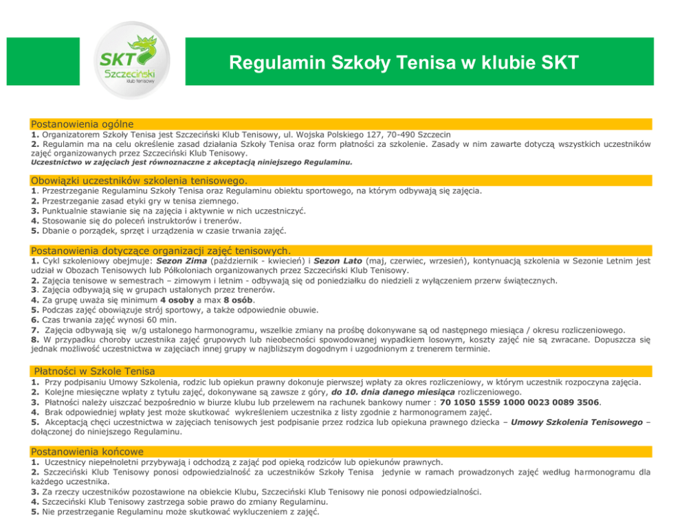 Regulamin Szkoły Tenisa w klubie SKT Postanowienia ogólne 1. Organizatorem Szkoły Tenisa jest Szczeciński Klub Tenisowy, ul. Wojska Polskiego 127, 70-490 Szczecin 2. Regulamin ma na celu określenie zasad działania Szkoły Tenisa oraz form płatności za szkolenie. Zasady w nim zawarte dotyczą wszystkich uczestników zajęć organizowanych przez Szczeciński Klub Tenisowy. Uczestnictwo w zajęciach jest równoznaczne z akceptacją niniejszego Regulaminu. Obowiązki uczestników szkolenia tenisowego. 1. 2. 3. 4. 5. Przestrzeganie Regulaminu Szkoły Tenisa oraz Regulaminu obiektu sportowego, na którym odbywają się zajęcia. Przestrzeganie zasad etyki gry w tenisa ziemnego. Punktualnie stawianie się na zajęcia i aktywnie w nich uczestniczyć. Stosowanie się do poleceń instruktorów i trenerów. Dbanie o porządek, sprzęt i urządzenia w czasie trwania zajęć. Postanowienia dotyczące organizacji zajęć tenisowych. 1. Cykl szkoleniowy obejmuje: Sezon Zima (październik - kwiecień) i Sezon Lato (maj, czerwiec, wrzesień), kontynuacją szkolenia w Sezonie Letnim jest udział w Obozach Tenisowych lub Półkoloniach organizowanych przez Szczeciński Klub Tenisowy. 2. Zajęcia tenisowe w semestrach – zimowym i letnim - odbywają się od poniedziałku do niedzieli z wyłączeniem przerw świątecznych. 3. Zajęcia odbywają się w grupach ustalonych przez trenerów. 4. Za grupę uważa się minimum 4 osoby a max 8 osób. 5. Podczas zajęć obowiązuje strój sportowy, a także odpowiednie obuwie. 6. Czas trwania zajęć wynosi 60 min. 7. Zajęcia odbywają się w/g ustalonego harmonogramu, wszelkie zmiany na prośbę dokonywane są od następnego miesiąca / okresu rozliczeniowego. 8. W przypadku choroby uczestnika zajęć grupowych lub nieobecności spowodowanej wypadkiem losowym, koszty zajęć nie są zwracane. Dopuszcza się jednak możliwość uczestnictwa w zajęciach innej grupy w najbliższym dogodnym i uzgodnionym z trenerem terminie. Płatności w Szkole Tenisa 1. Przy podpisaniu Umowy Szkolenia, rodzic lub opiekun prawny dokonuje pierwszej wpłaty za okres rozliczeniowy, w którym uczestnik rozpoczyna zajęcia. 2. Kolejne miesięczne wpłaty z tytułu zajęć, dokonywane są zawsze z góry, do 10. dnia danego miesiąca rozliczeniowego. 3. Płatności należy uiszczać bezpośrednio w biurze klubu lub przelewem na rachunek bankowy numer : 70 1050 1559 1000 0023 0089 3506. 4. Brak odpowiedniej wpłaty jest może skutkować wykreśleniem uczestnika z listy zgodnie z harmonogramem zajęć. 5. Akceptacją chęci uczestnictwa w zajęciach tenisowych jest podpisanie przez rodzica lub opiekuna prawnego dziecka – Umowy Szkolenia Tenisowego – dołączonej do niniejszego Regulaminu. Postanowienia końcowe 1. Uczestnicy niepełnoletni przybywają i odchodzą z zająć pod opieką rodziców lub opiekunów prawnych. 2. Szczeciński Klub Tenisowy ponosi odpowiedzialność za uczestników Szkoły Tenisa jedynie w ramach prowadzonych zajęć według harmonogramu dla każdego uczestnika. 3. Za rzeczy uczestników pozostawione na obiekcie Klubu, Szczeciński Klub Tenisowy nie ponosi odpowiedzialności. 4. Szczeciński Klub Tenisowy zastrzega sobie prawo do zmiany Regulaminu. 5. Nie przestrzeganie Regulaminu może skutkować wykluczeniem z zajęć.