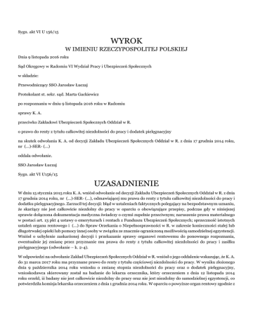 Sygn. akt VI U 156/15 WYROK W IMIENIU RZECZYPOSPOLITEJ POLSKIEJ Dnia 9 listopada 2016 roku Sąd Okręgowy w Radomiu VI Wydział Pracy i Ubezpieczeń Społecznych w składzie: Przewodniczący SSO Jarosław Łuczaj Protokolant st. sekr. sąd. Marta Gackiewicz po rozpoznaniu w dniu 9 listopada 2016 roku w Radomiu sprawy K. A. przeciwko Zakładowi Ubezpieczeń Społecznych Oddział w R. o prawo do renty z tytułu całkowitej niezdolności do pracy i dodatek pielęgnacyjny na skutek odwołania K. A. od decyzji Zakładu Ubezpieczeń Społecznych Oddział w R. z dnia 17 grudnia 2014 roku, nr (...)-SER- (...) oddala odwołanie. SSO Jarosław Łuczaj Sygn. akt VI U156/15 UZASADNIENIE W dniu 15 stycznia 2015 roku K. A. wniósł odwołanie od decyzji Zakładu Ubezpieczeń Społecznych Oddział w R. z dnia 17 grudnia 2014 roku, nr (...)-SER- (...), odmawiającej mu prawa do renty z tytułu całkowitej niezdolności do pracy i dodatku pielęgnacyjnego. Zarzucił tej decyzji: błąd w ustaleniach faktycznych polegający na bezpodstawnym uznaniu, że skarżący nie jest całkowicie niezdolny do pracy w oparciu o obowiązujące przepisy, podczas gdy w niniejszej sprawie dołączona dokumentacja medyczna świadczy o czymś zupełnie przeciwnym; naruszenie prawa materialnego w postaci art. 13 pkt 4 ustawy o emeryturach i rentach z Funduszu Ubezpieczeń Społecznych; sprzeczność istotnych ustaleń organu rentowego i (...) do Spraw Orzekania o Niepełnosprawności w R. w zakresie konieczności stałej lub długotrwałej opieki lub pomocy innej osoby w związku ze znacznie ograniczoną możliwością samodzielnej egzystencji. Wniósł o uchylenie zaskarżonej decyzji i przekazanie sprawy organowi rentowemu do ponownego rozpoznania, ewentualnie jej zmianę przez przyznanie mu prawa do renty z tytułu całkowitej niezdolności do pracy i zasiłku pielęgnacyjnego (odwołanie – k. 2-4). W odpowiedzi na odwołanie Zakład Ubezpieczeń Społecznych Oddział w R. wniósł o jego oddalenie wskazując, że K. A. do 31 marca 2017 roku ma przyznane prawo do renty z tytułu częściowej niezdolności do pracy. W wyniku złożonego dnia 9 października 2014 roku wniosku o zmianę stopnia niezdolności do pracy oraz o dodatek pielęgnacyjny, wnioskodawca skierowany został na badanie do lekarza orzecznika, który orzeczeniem z dnia 12 listopada 2014 roku orzekł, iż badany nie jest całkowicie niezdolny do pracy oraz nie jest niezdolny do samodzielnej egzystencji, co potwierdziła komisja lekarska orzeczeniem z dnia 1 grudnia 2014 roku. W oparciu o powyższe organ rentowy zgodnie z art. 14 i art. 107 ustawy o emeryturach i rentach z Funduszu Ubezpieczeń Społecznych sporną decyzją odmówił prawa żądanych świadczeń (odpowiedź na odwołanie – k. 7). Sąd Okręgowy ustalił i zważył, co następuje: K. A., urodzony (...), w dniu 15 czerwca 2012 roku złożył w Zakładzie Ubezpieczeń Społecznych Oddział w R. wniosek o rentę z tytułu niezdolności do pracy (wniosek – k. 1-2 akt ZUS). Decyzją z dnia 1 sierpnia 2012 roku, nr I (...), Zakład Ubezpieczeń Społecznych Oddział w R. przyznał K. A. rentę z tytułu częściowej niezdolności do pracy począwszy od 25 lipca 2012 roku, tj. od zaprzestania pobierania świadczenia rehabilitacyjnego, do 31 stycznia 2013 roku (decyzja – k. 42-43 akt ZUS). W dniu 17 grudnia 2012 roku K. A. złożył wniosek o przyznanie prawa do renty z tytułu niezdolności do pracy na dalszy okres (wniosek – k. 62 akt ZUS). Decyzją z dnia 4 lutego 2013 roku Zakład Ubezpieczeń Społecznych Oddział w R. przyznał K. A. rentę z tytułu częściowej niezdolności do pracy począwszy od 1lutego 2013 roku, tj. od miesiąca w którym wstrzymano wypłatę świadczenia, do 31 lipca 2013 roku (decyzja – k. 67 akt ZUS). W dniu 13 lipca 2013 roku K. A. złożył wniosek o przyznanie prawa do renty z tytułu niezdolności do pracy na dalszy okres (wniosek – k. 69 akt ZUS). Decyzją z dnia 19 września 2013 roku Zakład Ubezpieczeń Społecznych Oddział w R. przyznał K. A. rentę z tytułu częściowej niezdolności do pracy począwszy od 1 sierpnia 2013 roku, tj. od miesiąca w którym wstrzymano wypłatę świadczenia, do 30 marca 2014 roku (decyzja – k. 72 akt ZUS). W dniu 11 lutego 2014 roku K. A. złożył wniosek o przyznanie prawa do renty z tytułu niezdolności do pracy na dalszy okres (wniosek – k. 78 akt ZUS). Decyzją z dnia 24 marca 2014 roku Zakład Ubezpieczeń Społecznych Oddział w R. przyznał K. A. rentę z tytułu częściowej niezdolności do pracy począwszy od 1 lutego 2014 roku, tj. od miesiąca w którym zgłoszono wniosek, do 31 marca 2017 roku (decyzja – k. 81 akt ZUS). W dniu 9 października 2014 roku K. A. złożył wniosek o przyznanie dodatku pielęgnacyjnego oraz zmianę stopnia niezdolności do pracy (wniosek – k. 86 akt ZUS). W wyniku złożonego wniosku został skierowany na badanie przez lekarza orzecznika ZUS, który w opinii lekarskiej z dnia 12 listopada 2014 roku stwierdził u niego: łuszczycowe zapalenie stawów, zwyrodnienia wielostawowe, niewydolność funkcjonalną lewej kończyny górnej, nadciśnienie tętnicze, astmę oskrzelową, prawostronną głuchotę, niedosłuch lewostronny, a orzeczeniem z tego samego dnia uznał, że wnioskodawca nie jest całkowicie niezdolny do pracy i samodzielnej egzystencji (opinia lekarska – k. 15 dokumentacji orzeczniczo-lekarskiej znajdującej się w aktach ZUS, orzeczenie lekarza orzecznika ZUS w aktach ZUS). Od powyższego orzeczenia K. A. złożył sprzeciw (sprzeciw w aktach ZUS). W jego następstwie został skierowany na badanie przez komisję lekarską ZUS, która w opinii lekarskiej z dnia 1 grudnia 2014 roku rozpoznała u niego: zmiany zwyrodnieniowe stawów, możliwość łuszczycowego zapalenia stawów, astmę oskrzelową, nadciśnienie tętnicze, niedosłuch, otyłość, a orzeczeniem z tego samego dnia uznała, że wnioskodawca nie jest całkowicie niezdolny do pracy i do 