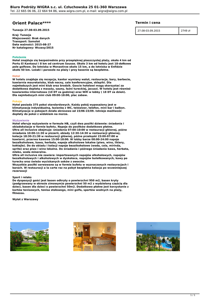 Biuro Podróży WIGRA s.c. ul. Człuchowska 25 01-360 Warszawa Tel. 22 665 06 06, 22 664 94 86, www.wigra.com.pl, e-mail: [email protected] Orient Palace**** Tunezja 27.08-03.09.2015 Termin i cena 27.08-03.09.2015 2749 zł Kraj: Tunezja Miejscowość: Brak danych Transport: Samolot Data ważności: 2015-08-27 Nr katalogowy: Wczasy/2015 Położenie Hotel znajduje się bezpośrednio przy przepięknej piaszczystej plaży, około 4 km od Portu El Kantaoui i 8 km od centrum Sousse. Około 3 km od hotelu jest 18-dołkowe pole golfowe. Do lotniska w Monastirze około 15 km, a do lotniska w Enfidzie około 50 km. Leżaki i parasole na plaży i przy basenie są bezpłatne. Hotel W hotelu znajduje się recepcja, kantor wymiany walut, restauracje, bary, barbecie, kawiarnia mauretańska, klub nocny, sale konferencyjne, sklepiki. Dla najmłodszych jest mini klub oraz brodzik. Goscie hotelowi mogą skorzystać za dodatkowa dopłatą z masaży, sauny, łaźni tureckiej, jacuzzi. W hotelu jest również kawiarenka internetowa (10 DT za godzinę) oraz Wifi w lobby ( 18 DT za dzień). Dla najmłodszych mini club 09:00-18:00, plac zabaw. Pokoje Hotel posiada 375 pokoi standardowych. Każdy pokój wyposażony jest w klimatyzację indywidualną, łazienkę z WC, telewizor, telefon, mini bar i balkon. Klimatyzacja w pokojach działa okresowo od 15/06-15/09. Istnieje możliwość dopłaty do pokoi z widokiem na morze. Wyżywienie Hotel oferuje wyżywienie w formule HB, czyli dwa posiłki dziennie: śniadania i obiadokolacje w formie bufetu. Napoje do posiłków dodatkowo płatne. Ultra all Inclusive obejmuje: śniadania 07:00-10:00 w restauracji głównej, późne śniadania 10:00-11:30 w pizzerii, obiady 12:30-14:30 w restauracji głównej, kolacje 18:30-21:30 w restauracji głównej, późne przekąski 23:00-07:00 w kawiarni, przerwa kawowa 15:00-18:00. W lobby barze 08:00-24:00 napoje bezalkoholowe, kawa, herbata, napoje alkoholowe lokalne (piwo, wino, likiery, koktajle). Do do obiadu i kolacji napoje bezalkoholowe (woda, cola, mirinda, sprite) oraz piwo i wino lokalne. Do śniadania i późnego śniadania kawa, herbata, mleko, woda mineralna. Ultra all inclusive nie zawiera: importowanych napojów alkoholowych, napojów bezalkoholowych i alkoholowych w dyskotece, napojów butelkowanych, kawy po turecku oraz świeżo wyciskanych soków z owoców. Wszystkie posiłki serwowane są w formie bufetu w wyznaczonych restauracjach i barach. W restauracji a la carte raz na pobyt bezpłatna kolacja po wcześniejszej rezerwacji Sport i relaks Do dyspozycji gości jest basen odkryty o powierzchni 950 m2, basen kryty (podgrzewany w okresie zimowym)o powierzchni 50 m2 z wydzieloną częścią dla dzieci, basen dla dzieci o powierzchni 50m2. Dodatkowo płatne jest korzystanie z kortów tenisowych, tenisa stołowego, mini golfa, sportów wodnych na plaży, fitnessu. Wylot z Warszawy 1/1 Powered by TCPDF (www.tcpdf.org)