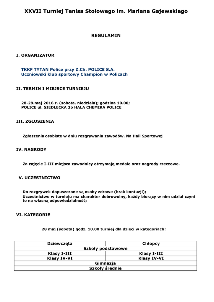 XXVII Turniej Tenisa Stołowego im. Mariana Gajewskiego REGULAMIN I. ORGANIZATOR TKKF TYTAN Police przy Z.Ch. POLICE S.A. Uczniowski klub sportowy Champion w Policach II. TERMIN I MIEJSCE TURNIEJU 28-29.maj 2016 r. (sobota, niedziela); godzina 10.00; POLICE ul. SIEDLECKA 2b HALA CHEMIKA POLICE III. ZGŁOSZENIA Zgłoszeniaosobiste w dniu rozgrywania zawodów. Na Hali Sportowej IV. NAGRODY Za zajęcie I-III miejsca zawodnicy otrzymają medale oraz nagrody rzeczowe. V. UCZESTNICTWO Do rozgrywek dopuszczone są osoby zdrowe (brak kontuzji); Uczestnictwo w turnieju ma charakter dobrowolny, każdy biorący w nim udział czyni to na własną odpowiedzialność; VI. KATEGORIE 28 maj (sobota) godz. 10.00 turniej dla dzieci w kategoriach: Dziewczęta Chłopcy Szkoły podstawowe Klasy I-III Klasy IV-VI Klasy I-III Klasy IV-VI Gimnazja Szkoły średnie 29 maj ( niedziela) godz. 10.00 turniej w kategoriach: Mężczyźni do 35 lat Mężczyźni od 36-50 lat Mężczyźni od 51- 60 lat Mężczyźni powyżej 61lat Kobiety Open VII. PRZEPISY GRY W czasie rozgrywek obowiązują przepisy gry w tenisa stołowego PZTS z niżej wymienionymi wyjątkami: VIII.SYSTEM ROZGRYWEK System rozgrywek w poszczególnych kategoriach: I tura – w grupach każdy z każdym do trzech wygranych setów II tura – system pucharowy do dwóch przegranych meczy ( mecze w systemie pucharowym rozgrywane będą do trzech wygranych setów ) Turniej rozgrywany będzie na stołach Tibhar i Tornado; UWAGA: Organizator zastrzega sobie możliwość zamiany systemu rozgrywek ze względów organizacyjnych. IX. DYSKWALIFIKACJE I WYKLUCZENIA Zawody zostaną zweryfikowane jako przegrana bez gry (walkower) w przypadku gdy: Zawodnik z własnej winy nie stawił się do rozgrywek lub spóźni się więcej niż 15 minut; Zawodnik wzbrania się grać pod kierunkiem wyznaczonego sędziego; Zawodnik odchodzi od stołu przed zakończeniem spotkania – w tym przypadku przeciwnikowi dopisuje się punkty potrzebne do wygrania seta; X. PROTESTY I ODWOŁANIA Wszystkie protesty i odwołania powinny być składane pisemnie, opatrzone szczegółowym opisem i czytelnym podpisem osoby składającej protest. Procedura ta powinna nastąpić bezpośrednio po zakończeniu spotkania po uprzednim poinformowaniu arbitra o zamiarze wniesienia uwag do protokołu spotkania. XI. UWAGI KOŃCOWE 1. Wymagane jest obuwie na zmianę oraz strój sportowy ( spodenki i koszulka). 2. Zawodnicy biorący udział w turnieju postanowień regulaminu i przepisów gry obowiązani są do przestrzegania 3. Zawodnicy ponoszą pełną odpowiedzialność materialną za szkody wyrządzone przez siebie; 4. Zawodnicy biorący udział w turnieju grają na własną odpowiedzialność; 5. Odbiór i przyjęcie zasad regulaminu potwierdzony jest zgłoszeniem się do turnieju 6. Organizator nie ponosi odpowiedzialności prawnej za szkody powstałe w wyniku utraty mienia w trakcie trwania rozgrywek; 7. Nad poprawnością przebiegu turnieju czuwa Organizator z ramienia TKKF TYTAN i UKS Champion XII. POZSTAŁE POSTANOWIENIA 1. 2. 3. Prawo do interpretacji regulaminu turnieju zastrzega sobie Organizator; W kwestiach nie objętych regulaminem ostateczną decyzję podejmuje Organizator Informacje można uzyskać pod numerem tel. 505 063 587. ZAPRASZMY SERDECZNIE