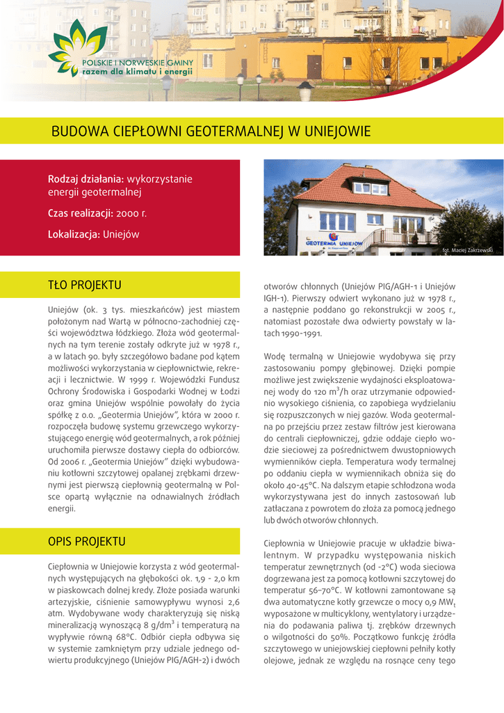 BUDOWA CIEPŁOWNI GEOTERMALNEJ W UNIEJOWIE Rodzaj działania: wykorzystanie energii geotermalnej Czas realizacji: 2000 r. Lokalizacja: Uniejów fot. Maciej Zakrzewski TŁO PROJEKTU Uniejów (ok. 3 tys. mieszkańców) jest miastem położonym nad Wartą w północno-zachodniej części województwa łódzkiego. Złoża wód geotermalnych na tym terenie zostały odkryte już w 1978 r., a w latach 90. były szczegółowo badane pod kątem możliwości wykorzystania w ciepłownictwie, rekreacji i lecznictwie. W 1999 r. Wojewódzki Fundusz Ochrony Środowiska i Gospodarki Wodnej w Łodzi oraz gmina Uniejów wspólnie powołały do życia spółkę z o.o. „Geotermia Uniejów”, która w 2000 r. rozpoczęła budowę systemu grzewczego wykorzystującego energię wód geotermalnych, a rok później uruchomiła pierwsze dostawy ciepła do odbiorców. Od 2006 r. „Geotermia Uniejów” dzięki wybudowaniu kotłowni szczytowej opalanej zrębkami drzewnymi jest pierwszą ciepłownią geotermalną w Polsce opartą wyłącznie na odnawialnych źródłach energii. OPIS PROJEKTU Ciepłownia w Uniejowie korzysta z wód geotermalnych występujących na głębokości ok. 1,9 - 2,0 km w piaskowcach dolnej kredy. Złoże posiada warunki artezyjskie, ciśnienie samowypływu wynosi 2,6 atm. Wydobywane wody charakteryzują się niską mineralizacją wynoszącą 8 g/dm³ i temperaturą na wypływie równą 68°C. Odbiór ciepła odbywa się w systemie zamkniętym przy udziale jednego odwiertu produkcyjnego (Uniejów PIG/AGH-2) i dwóch otworów chłonnych (Uniejów PIG/AGH-1 i Uniejów IGH-1). Pierwszy odwiert wykonano już w 1978 r., a następnie poddano go rekonstrukcji w 2005 r., natomiast pozostałe dwa odwierty powstały w latach 1990-1991. Wodę termalną w Uniejowie wydobywa się przy zastosowaniu pompy głębinowej. Dzięki pompie możliwe jest zwiększenie wydajności eksploatowanej wody do 120 m³/h oraz utrzymanie odpowiednio wysokiego ciśnienia, co zapobiega wydzielaniu się rozpuszczonych w niej gazów. Woda geotermalna po przejściu przez zestaw filtrów jest kierowana do centrali ciepłowniczej, gdzie oddaje ciepło wodzie sieciowej za pośrednictwem dwustopniowych wymienników ciepła. Temperatura wody termalnej po oddaniu ciepła w wymiennikach obniża się do około 40-45°C. Na dalszym etapie schłodzona woda wykorzystywana jest do innych zastosowań lub zatłaczana z powrotem do złoża za pomocą jednego lub dwóch otworów chłonnych. Ciepłownia w Uniejowie pracuje w układzie biwalentnym. W przypadku występowania niskich temperatur zewnętrznych (od -2°C) woda sieciowa dogrzewana jest za pomocą kotłowni szczytowej do temperatur 56–70°C. W kotłowni zamontowane są dwa automatyczne kotły grzewcze o mocy 0,9 MWt wyposażone w multicyklony, wentylatory i urządzenia do podawania paliwa tj. zrębków drzewnych o wilgotności do 50%. Początkowo funkcję źródła szczytowego w uniejowskiej ciepłowni pełniły kotły olejowe, jednak ze względu na rosnące ceny tego fot. Jacek Krupnik paliwa w 2006 r. podjęto decyzję o zastąpieniu ich kotłami na biomasę. Zakład w Uniejowie nie stosuje konwencjonalnych źródeł ciepła jako systemu wspomagającego – bazuje wyłącznie na energii geotermalnej i biomasie. Całkowita moc ciepłowni w Uniejowie wynosi 7,4 MWt, z czego 3,2 MWt pochodzi z systemu odbioru ciepła z wód geoter-malnych, 1,8 MWt z biomasowych kotłów szczy-towych oraz 2,4 MWt z kotłów olejowych (źródło rezerwowe). Całkowita roczna sprzedaż ciepła wy-nosi ok. 19861,64 GJ, w tym udział ciepła pochodzą-cego z geotermii 17875,48 GJ. Odbiorcami energii pochodzącej z ciepłowni geotermalnej w Uniejowie są głównie indywidualne gospodarstwa mieszkalne, spółdzielnie mieszkaniowe, budynki sektora użyteczności publicznej, firmy oraz obiekty turystyczno-rekreacyjne zarządzane przez Termy Uniejów. „Geotermia Uniejów” pokrywa zapotrzebowanie na energię cieplną oraz ciepłą wodę użytkową ok. 70% mieszkańców miasta przyłączonych do geotermalnej sieci ciepłowniczej, która liczy 13 km . Uniejowskie wody geotermalne są wodami chlorkowo-sodowymi z zawartością fluoru, jodu i kwasu metakrzemowego. Od 2002 r. ze względu na walory termiczne i chemiczne uniejowskie wody są stosowane w profilaktyce zdrowotnej i leczeniu schorzeń układów ruchu, mięśniowego, oddechowego, krążenia, nerwowego, pokarmowego i chorób skóry. W 2012 roku Uniejów, jako pierwsze miasto w województwie łódzkim, uzyskał status uzdrowiska. Z zabiegów balneoterapeutycznych można skorzystać m.in. w siedzibie spółki „Geotermia Uniejów” oraz w zakładzie przyrodoleczniczym Uzdrowisko Uniejów Park. W ofercie obiektów znajdują się m.in. inhalacje i kąpiele perełkowe w naturalnej wodzie geotermalnej (wskazane przy chorobach stawów, mięśni, zmianach skórnych, alergicznych, żylakach, bezsenności, nerwicach, stanach napięcia emocjonalnego i zapaleniach nerwów). Do celów balneologicznych wykorzystuje się ok. 5 m³/h wody termalnej. Od 2008 r. wody geotermalne są stosowane do zasilania niecek basenowych obiektów rekreacyjnych znajdujących się na terenie Uniejowa. Kąpiele w leczniczej solance są oferowane w Termach Uniejów, hotelu Medical SPA Lawendowe Termy, Hotelu Uniejów eco Active & Spa, a także Uzdrowisku Uniejów Park. Średnio do celów rekreacyjnych wykorzystuje się około 10-15 m³/h wody termalnej. Woda geotermalna jest również dostarczana do bloków mieszkalnych wybudowanych przez spółkę PGK Termy Uniejów. Ewenementem w skali kraju jest wykorzystanie wody termalnej do podgrzewania murawy boiska piłkarskiego, a także ścieżek spacerowych w parku zamkowym. Elementem służącym promocji miasta są fontanny z gorącą wodą i kadzie, w których stosuje się część wody termalnej wykorzystanej uprzednio do celów grzewczych w kompleksie rekreacyjnym. Dodatkową atrakcję stanowią tężnie termalne, w pobliżu których możn