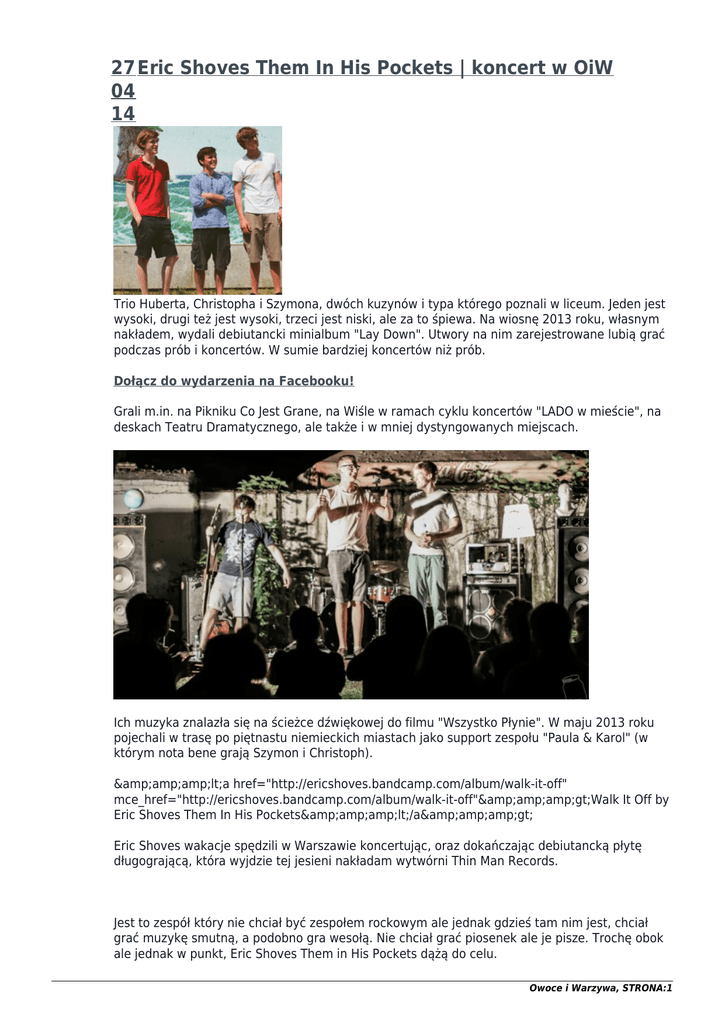 27 Eric Shoves Them In His Pockets | koncert w OiW 04 14 Trio Huberta, Christopha i Szymona, dwóch kuzynów i typa którego poznali w liceum. Jeden jest wysoki, drugi też jest wysoki, trzeci jest niski, ale za to śpiewa. Na wiosnę 2013 roku, własnym nakładem, wydali debiutancki minialbum "Lay Down". Utwory na nim zarejestrowane lubią grać podczas prób i koncertów. W sumie bardziej koncertów niż prób. Dołącz do wydarzenia na Facebooku! Grali m.in. na Pikniku Co Jest Grane, na Wiśle w ramach cyklu koncertów "LADO w mieście", na deskach Teatru Dramatycznego, ale także i w mniej dystyngowanych miejscach. Ich muzyka znalazła się na ścieżce dźwiękowej do filmu "Wszystko Płynie". W maju 2013 roku pojechali w trasę po piętnastu niemieckich miastach jako support zespołu "Paula & Karol" (w którym nota bene grają Szymon i Christoph). <a href="http://ericshoves.bandcamp.com/album/walk-it-off" mce_href="http://ericshoves.bandcamp.com/album/walk-it-off">Walk It Off by Eric Shoves Them In His Pockets</a> Eric Shoves wakacje spędzili w Warszawie koncertując, oraz dokańczając debiutancką płytę długogrającą, która wyjdzie tej jesieni nakładam wytwórni Thin Man Records. Jest to zespół który nie chciał być zespołem rockowym ale jednak gdzieś tam nim jest, chciał grać muzykę smutną, a podobno gra wesołą. Nie chciał grać piosenek ale je pisze. Trochę obok ale jednak w punkt, Eric Shoves Them in His Pockets dążą do celu. Owoce i Warzywa, STRONA:1 Eric Shoves Them In His Pockets | koncert niedziela | 27.04 | godz. 20:00 Owoce i Warzywa | Traugutta 9 | Łódź Owoce i Warzywa, STRONA:2