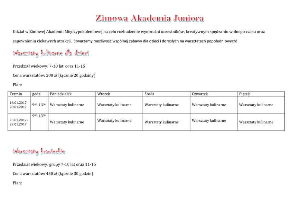 Udział w Zimowej Akademii Międzypokoleniowej na celu rozbudzenie wyobraźni uczestników, kreatywnym spędzaniu wolnego czasu oraz zapewnieniu ciekawych atrakcji. Stwarzamy możliwość wspólnej zabawy dla dzieci i dorosłych na warsztatach popołudniowych! Przedział wiekowy: 7-10 lat oraz 11-15 Cena warsztatów: 200 zł (łącznie 20 godziny) Plan: Termin godz. Poniedziałek Wtorek Środa Czwartek Piątek 16.01.201720.01.2017 900-1300 Warsztaty kulinarne Warsztaty kulinarne Warsztaty kulinarne Warsztaty kulinarne Warsztaty kulinarne Warsztaty kulinarne Warsztaty kulinarne Warsztaty kulinarne Warsztaty kulinarne Warsztaty kulinarne 23.01.201727.01.2017 900-1300 Przedział wiekowy: grupy 7-10 lat oraz 11-15 Cena warsztatów: 450 zł (łącznie 30 godzin) Plan: Termin godz. Poniedziałek Wtorek Środa Czwartek Piątek 16.01.201720.01.2017 900-1400 Warsztaty krawieckie Warsztaty krawieckie Warsztaty krawieckie Warsztaty krawieckie Warsztaty krawieckie Warsztaty krawieckie Warsztaty krawieckie Warsztaty krawieckie Warsztaty krawieckie Warsztaty krawieckie 23.01.201727.01.2017 900-1400 Przedział wiekowy: grupy 6-10 lat oraz 11-15 lat Cena warsztatów: Godzina zajęć 20 zł Plan: Termin 16.01.201720.01.2017 godz. 900-1300 Poniedziałek Wtorek Środa Czwartek Piątek Zajęcia z robotyki Zajęcia z robotyki Zajęcia z robotyki Zajęcia z robotyki Zajęcia z robotyki Kontakt: Ośrodek Kształcenia Zawodowego w Żarkach ul. Sosnowa 2, 42-310 Żarki tel.: 34 314 82 25 e-mail: [email protected] www: www.kursy.zarki.zdz.pl
