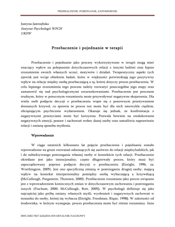 PRZEBACZENIE, POJEDNANIE, ZAPOMNIENIE Justyna Jastrzębska Instytut Psychologii WFCH UKSW Przebaczenie i pojednanie w terapii Przebaczenie i pojednanie jako procesy wykorzystywane w terapii mogą mieć znaczący wpływ na polepszenie dotychczasowych relacji z innymi ludźmi oraz lepsze zrozumienie swoich własnych uczuć, motywów i działań. Terapeutyczny aspekt tych zjawisk jest wciąż obiektem badań, które w większości potwierdzają jego pozytywny wpływ na relacje między osobą przebaczającą a tą, której dotyczy proces przebaczenia. W celu lepszego zrozumienia tego procesu należy rozważyć poszczególne jego etapy oraz zastanowić się nad psychologicznymi uwarunkowaniami. Przebaczenie jest procesem trudnym, który w potocznym rozumieniu może przywoływać negatywne skojarzenia. Dla wielu osób podjęcie decyzji o przebaczeniu wiąże się z ponownym przeżywaniem doznanych krzywd, co sprawia że proces ten może być dla nich niezwykle ciężkim, obciążającym psychicznie wydarzeniem. Okazuje się jednak, że konfrontacja z negatywnymi przeżyciami może być korzystna. Pozwala bowiem na zredukowanie negatywnych emocji, postaw i zachowań wobec danej osoby oraz umożliwia naprawienie relacji i zmianę sposobu myślenia. Wprowadzenie W ciągu ostatnich kilkunastu lat pojęcie przebaczenia i pojednania zostało wprowadzone na grunt rozważań odnoszących się zarówno do relacji międzyludzkich, jak i do subiektywnego postrzegania własnej osoby w kontekście tych relacji. Przebaczenie określane jest jako intencjonalny, często długotrwały proces, który musi być zapoczątkowany poprzez podjęcie decyzji o przebaczeniu (Enright, 1996, za: Worthington, 2005). Jest ono specyficzną zmianą w postrzeganiu drugiej osoby, mającą wpływ na kontekst interpersonalny pomiędzy osobą wybaczającą a krzywdzącą (McCullough, Pargament, Thoresen, 2000). Przebaczenie rozumiane jako proces związane jest z wprowadzeniem koniecznych zmian w dotychczasowym zachowaniu i postrzeganiu innych (Fincham, 2000; McCullough, Rott, 2005). W psychologii definiuje się jako najczęściej jako próbę zmiany własnych myśli, wyobrażeń i negatywnych zachowań w stosunku do osoby, której się wybacza (Enright, Freedman, Rique, 1998). W zależności od środowiska, w którym występuje, proces przebaczenia może być różnie rozumiany. Inne ISSN 2082-7067 2(26)2016 KWARTALNIK NAUKOWY PRZEBACZENIE, POJEDNANIE, ZAPOMNIENIE podejście mogą proponować szkoły terapeutyczne, inne zaś spojrzenie na ten proces może funkcjonować wśród osób stowarzyszających się w grupach samopomocowych. Funkcjonujący powszechnie w społeczeństwie sposób rozumienia tego pojęcia często kojarzy się z koniecznością zapomnienia o doznanych krzywdach i pogodzeniem się z przeszłością (Fincham, Hall, Beach, 2006). Dla niektórych takie rozumienie może tworzyć określone wyobrażenie dotyczące osoby przebaczającej, która może być postrzegana jako słaba, bezradna i pogodzona z możliwością doznawania krzywd w przyszłości (Kearns, Fincham, 2004). Taka postawa może być powodem niechęci do podjęcia decyzji o przebaczeniu, a co za tym idzie trudności w terapii i naprawieniu relacji z innymi. Ogromną rolę odgrywa rozróżnienie pomiędzy przebaczeniem a pojednaniem. Istotny jest fakt, że przebaczenie nie wymaga pojednania (Enright, 1996). Oznacza to, że przebaczenie jednej osoby nie wiąże się automatycznie z przebaczeniem ze strony drugiej. Przebaczenie jest więc procesem kierunkowym, dokonywanym przez ofiarę względem osoby krzywdzącej i nie wymaga jej zgody. Pojednanie zaś uwzględnia obie jednostki, które muszą wyrazić chęć i podjąć działania mające na celu umożliwienie zajścia tego procesu. W procesie przebaczenia każda ze stron otrzymuje pewne korzyści. Osoba przebaczająca ma możliwość zmiany negatywnego postrzegania drugiej osoby, zmiany swojego zachowania oraz odczuwanych wobec niej uczuć. Jednocześnie osoba, której się przebacza otrzymuje swoisty dar w kontekście relacji z partnerem (Gordon, Baucom, 1998). Przebaczenie zdaje się mieć silny wpływ na psychologiczny aspekt regulacji emocjonalnej jednostki, czego dowodzą badania Baskin i Enrighta (2004). Dowodzą one, że terapia z użyciem przebaczenia jest bardziej skuteczna od tradycyjnych metod. Ma to związek z rozładowaniem negatywnych emocji osoby pokrzywdzonej, zmianą w postrzeganiu osoby uważanej za krzywdzącą oraz wykształceniem pozytywnych uczuć w stosunku do niej. Rozpoczęty proces przebaczenia, w miarę upływu czasu postępuje dalej, obejmując wiele różnych sfer życia. Przebaczenie jest instrumentalne, a co za tym idzie również podejmowane w jego ramach zachowania są zachowaniami instrumentalnymi, świadomie podejmowanymi przez daną osobę. Ważnym aspektem pojęć przebaczenia i pojednania jest ich istnienie w sferze religijnej. Może to mieć duży wpływ na stosunek danej osoby do terapii z wykorzystaniem tych procesów. Niektóre badania dowodzą związku między chęcią przebaczenia drugiej osobie, a własnym stosunkiem do religii (Rye, Pargament, 2002). Religijność danej osoby może mieć pozytywny wpływ na proces przebaczenia i pojednania uwzględniając podstawowe zasady moralne przekazywane poprzez wiarę. Wiele par małżeńskich deklaruje duże znaczenie religii jako komponentu ich związku (Blumel, 1992), co może mieć duże znaczenie podczas rozwiązywania konfliktów małżeńskich, gdzie koniecznym elementem jest przebaczenie wobec małżonka. FIDES ET RATIO Strona 129 PRZEBACZENIE, POJEDNANIE, ZAPOMNIENIE 1. Rodzaje przebaczenia Przebaczenie może przyjmować różne formy. Baumeister, Exline i Sommer (1998) wyróżnili kilka rodzajów przebaczenia w zależności od przeżywanych przez osobę przebaczającą stanów emocjonalnych. Te rodzaje to przebaczenie ciche, bezwartościowe (próżne) oraz prawdziwe (totalne). Wszystkie określone rodzaje pr