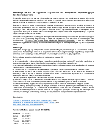 Rekrutacja MKiDN na stypendia zagraniczne dla kandydatów reprezentujących dziedziny artystyczne Stypendia przeznaczone są na kilkumiesięczne staże artystyczne, naukowo-badawcze lub studia podyplomowe realizowane za granicą. Limit wieku przyszłych stypendystów określany przez większość państw to 35 lat w chwili rozpoczęcia pobytu – jesień 2014 roku. Rekrutacja dotyczy osób posiadających dyplom ukończenia artystycznych studiów wyższych w uczelniach podległych MKiDN. Niektóre kraje dopuszczają jednak przyjęcie wniosków studentów ostatniego roku. Reprezentanci wszystkich dziedzin sztuki są równouprawnieni w ubieganiu się o stypendium. Kandydat w danym roku może ubiegać się o wyjazd wyłącznie do jednego kraju, do jednej instytucji artystycznej lub naukowej. Kandydaci na stypendium uzyskują we własnym zakresie dokumenty świadczące o gotowości przyjęcia ich przez daną placówkę zagraniczną – instytucję artystyczną lub naukową w konkretnym roku akademickim. Placówka taka winna mieć charakter państwowy/publiczny – nie ma możliwości otrzymania stypendium na pobyt w ośrodkach finansowanych ze źródeł prywatnych czy też na prywatne lekcje. Rekrutacja Kandydaci ubiegający się o stypendia rządów państw obcych powinni złożyć w Ministerstwie Kultury i Dziedzictwa Narodowego wniosek o przyznanie stypendium zagranicznego, wypełniając odpowiedni formularz zamieszczony poniżej. Wniosek powinien być wypełniony w języku polskim. Do formularza wniosku należy dołączyć następujące załączniki: a. życiorys b. korespondencję z daną placówką zagraniczną potwierdzająca gotowość przyjęcia kandydata w przypadku przyznania stypendium lub list zapraszający od placówki zagranicznej, c. co najmniej dwie opinie od profesorów (instytucji polskich lub zagranicznych), popierających starania kandydata o przyznanie stypendium, d. zaświadczenie o znajomości języka obcego, zgodnego z wymogami partnerów zagranicznych, e. kserokopię dyplomu ukończenia artystycznych studiów wyższych, a w przypadku studentów ostatniego roku - wyciąg z indeksu potwierdzony przez uczelnię (lista egzaminów z przedmiotów wiodących podczas całego przebiegu studiów), f. kopie dyplomów, wyróżnień z konkursów, wystaw, recenzje itp. g. portfolio – zdjęcia prac i szkiców lub CD z utworami o różnych stylach muzycznych lub DVD z formami scenicznymi oraz inne dokumenty potwierdzające osiągnięcia kandydata w danej dziedzinie. Wszelkie dokumenty w językach obcych powinny zawierać robocze tłumaczenie na język polski. Wnioski należy przesyłać pocztą lub złożyć osobiście w biurze podawczym Ministerstwa Kultury i Dziedzictwa Narodowego, ul. Krakowskie Przedmieście 15/17, 00-071 Warszawa. Wnioski można składać do ostatniego dnia w danym naborze. W przypadku przesyłki pocztowej nie decyduje data stempla pocztowego. Dokumenty powinny zostać przesłane z odpowiednim wyprzedzeniem. Do pobrania: Wniosek o przyznanie stypendium zagranicznego (pdf) Informacje nt. stypendiów w poszczególnych krajach (pdf) Regulamin rekrutacji na stypendia (pdf) Terminy składania podań na rok 2014/2015: Armenia 15.11.2013 Belgia 25.01.2014 Egipt 15.11.2013 Francja 22.02.2014 Grecja 14.12.2013 Gruzja 15.11.2013 Izrael 15.11.2013 Japonia 12.03.2014 Meksyk 13.06.2014 Rumunia 15.11.2013 Serbia 15.11.2013 Słowenia 15.11.2013 Szwajcaria 31.10.2013 Tunezja 12.03.2014 Turcja 14.12.2013 Lista krajów prowadzących bezpośredni nabór wniosków oraz linki do stron internetowych zawierających informacje nt. kryteriów ubiegania się o stypendia, warunków administracyjnych i finansowych oraz formularze zgłoszeniowe: Austria www.grants.at Dania http://en.iu.dk/ Finlandia http://www.studyinfinland.fi/tuition_and_scholarships/cimo_scholarships/cimo_fellowships Islandia http://www.arnastofnun.is/page/a_inter_scholarships Hiszpania http://www.educacion.gob.es/polonia Niemcy www.daad.pl Norwegia www.rcn.no/is Portugalia www.instituto-camoes.pt Szwecja www.si.se Źródło: MKiDN http://www.mkidn.gov.pl/pages/strona-glowna/finanse/stypendia/stypendia-zagraniczne.php