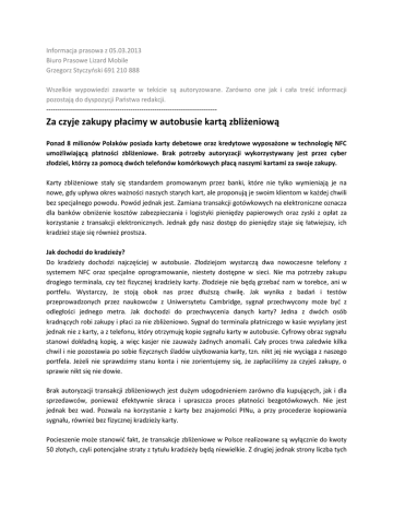 Informacja prasowa z 05.03.2013 Biuro Prasowe Lizard Mobile Grzegorz Styczyński 691 210 888 Wszelkie wypowiedzi zawarte w tekście są autoryzowane. Zarówno one jak i cała treść informacji pozostają do dyspozycji Państwa redakcji. ------------------------------------------------------------------------------- Za czyje zakupy płacimy w autobusie kartą zbliżeniową Ponad 8 milionów Polaków posiada karty debetowe oraz kredytowe wyposażone w technologię NFC umożliwiającą płatności zbliżeniowe. Brak potrzeby autoryzacji wykorzystywany jest przez cyber złodziei, którzy za pomocą dwóch telefonów komórkowych płacą naszymi kartami za swoje zakupy. Karty zbliżeniowe stały się standardem promowanym przez banki, które nie tylko wymieniają je na nowe, gdy upływa okres ważności naszych starych kart, ale proponują je swoim klientom w każdej chwili bez specjalnego powodu. Powód jednak jest. Zamiana transakcji gotówkowych na elektroniczne oznacza dla banków obniżenie kosztów zabezpieczania i logistyki pieniędzy papierowych oraz zyski z opłat za korzystanie z transakcji elektronicznych. Jednak gdy nasz dostęp do pieniędzy staje się łatwiejszy, ich kradzież staje się również prostsza. Jak dochodzi do kradzieży? Do kradzieży dochodzi najczęściej w autobusie. Złodziejom wystarczą dwa nowoczesne telefony z systemem NFC oraz specjalne oprogramowanie, niestety dostępne w sieci. Nie ma potrzeby zakupu drogiego terminala, czy też fizycznej kradzieży karty. Złodzieje nie będą grzebać nam w torebce, ani w portfelu. Wystarczy, że stoją obok nas przez dłuższą chwilę. Jak wynika z badań i testów przeprowadzonych przez naukowców z Uniwersytetu Cambridge, sygnał przechwycony może być z odległości jednego metra. Jak dochodzi do przechwycenia danych karty? Jedna z dwóch osób kradnących robi zakupy i płaci za nie zbliżeniowo. Sygnał do terminala płatniczego w kasie wysyłany jest jednak nie z karty, a z telefonu, który otrzymuję kopie sygnału karty w autobusie. Cyfrowy obraz sygnału stanowi dokładną kopię, a więc kasjer nie zauważy żadnych anomalii. Cały proces trwa zaledwie kilka chwil i nie pozostawia po sobie fizycznych śladów użytkowania karty, tzn. nikt jej nie wyciąga z naszego portfela. Jeżeli nie sprawdzimy stanu konta i nie zorientujemy się, że zapłaciliśmy za czyjeś zakupy, o sprawie nikt się nie dowie. Brak autoryzacji transakcji zbliżeniowych jest dużym udogodnieniem zarówno dla kupujących, jak i dla sprzedawców, ponieważ efektywnie skraca i upraszcza proces płatności bezgotówkowych. Nie jest jednak bez wad. Pozwala na korzystanie z karty bez znajomości PINu, a przy procederze kopiowania sygnału, również bez fizycznej kradzieży karty. Pocieszenie może stanowić fakt, że transakcje zbliżeniowe w Polsce realizowane są wyłącznie do kwoty 50 złotych, czyli potencjalne straty z tytułu kradzieży będą niewielkie. Z drugiej jednak strony liczba tych transakcji, teoretycznie ograniczona do 5 dziennie, może spowodować wyczyszczenie naszego konta. W jaki sposób? Znany jest przypadek 78 transakcji wykonanych kartą zbliżeniową jednego dnia, ponieważ tego typu płatności wykonywane są w trybie off-line i nie są rejestrowane w czasie rzeczywistym. Banki otrzymują coraz więcej reklamacji związanych z nieprawnym użyciem kart zbliżeniowych przez osoby postronne. Z racji tego, że autoryzacja transakcji przy użyciu takiej karty odbywa się poprzez jej posiadanie w portfelu, kieszeni, nie pozostają inne ślady jej użycia, takie jak podpis, czy PIN. Ubezpieczenia kart często pokrywają straty w wyniku takich transakcji od kwoty 200 PLN, a więc jeśli straciliśmy 50, 100, lub 150 złotych, ubezpieczenie nas nie dotyczy. Warto zwrócić na to uwagę przy podpisywaniu umowy w banku. Czy można bezpiecznie korzystać z kart zbliżeniowych? Okazuje się, że lepiej zabezpieczeni przed przechwytywaniem danych z kart płatniczych są posiadacze telefonów z możliwością płatności zbliżeniowej takich jak T-Mobile My Wallet, czy Orange Cash. Najpierw wprowadzają dane karty lub kart do telefonu, a następnie korzystają z sygnału wysyłanego z komórki podczas płatności. Uruchomienie takiej płatności wymaga autoryzacji PIN w telefonie, a więc właściciele kart są świadomi każdej transakcji. Mogą również przy pomocy kilku kliknięć wyłączyć przekazywanie danych NFC. - Posiadacze klasycznych kart zbliżeniowych są skazani na owijanie ich folią aluminiową, co sprawia, że wbudowana w kartę antena traci swoje właściwości - podpowiada Piotr Konieczny, ekspert zabezpieczeń IT z portalu Niebezpiecznik.pl. Testowanie nowych technologii Nowe technologie stawiają przed projektantami, deweloperami i informatykami nowe wyzwania komunikacyjne. Nie chodzi tylko o warstwę oprogramowania i sprzęt, ale także o „user experience”, czyli wrażenia użytkownika, a także jego poziom wiedzy i umiejętności do posługiwania się tą technologią. Jeżeli wrażenia są złe, a technologia trudna lub niebezpieczna w codziennym użytkowaniu, to może się nie przyjąć. Takimi prawami rządzą się finansowe aplikacje mobilne. W przypadku „płatności przez telefon” zagrożenia dla danych użytkownika mogą powstawać dopiero w momencie fizycznego kontaktu atakującego z urządzeniem, na przykład kradzieży telefonu. – Warto w procesie projektowym kłaść nacisk nie tylko na identyfikację kluczowych funkcjonalności, ale i głównych zagrożeń dla bezpieczeństwa danych - mówi Mateusz Biliński, mobility manager w Lizard Mobile. - Wspomaganie się tutaj ekspertyzą osób spoza projektu, które zadają właściwe pytania, skutecznie zwiększa szanse aplikacji na zaistnienie w świecie mobilnym – dodaje Mateusz Biliński. Warto inwestować w najnowsze technologie oraz uczyć się jak korzystać z tych, które już na co dzień nosimy w portfelu. Jak zabezpieczyć s