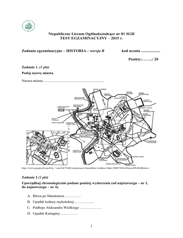 Niepubliczne Liceum Ogólnokształcące nr 81 SGH TEST EGZAMINACYJNY – 2015 r. Zadania egzaminacyjne – HISTORIA – wersja B kod ucznia ................... Punkty:……../ 20 Zadanie 1. (1 pkt) Podaj nazwę miasta. Nazwa miasta................................................................... https://www.google.pl/search?q= +staro%C5%BCytny&source=lnms&tbm=isch&sa=X&ei=bMtYVbXvH4eeywPE44GIBw&ve Zadanie 2 (1 pkt) Uporządkuj chronologicznie podane poniżej wydarzenia (od najstarszego – nr 1, do najnowszego – nr 4). A. Bitwa po Maratonem……….…. B. Upadek kultury mykeńskiej…………….. C. Podboje Aleksandra Wielkiego ……………… D. Upadek Kartaginy…………… 1 Zadanie 3 (1 pkt) Poniżej przedstawiona została skorupka glinianego naczynia z wydrapanym imieniem ateńskiego polityka. Podaj nazwę tajnego głosowania, w wyniku którego powstała. https://www.google.pl/search?q=&biw=1280&bih=869&source=lnms&tbm=isch&sa=X&ei=RyNaVeHaK- ............................................................................................................................................. Zadanie 4. (2 pkt) Napisz, kim byli i jaką rolę w dziejach odegrali: Konstantyn Wielki ............................................................................................................................................. ............................................................................................................................................. Bolesław Chrobry .............................................................................................................................................. ............................................................................................................................................ Zadanie 5 (2 pkt) Podczas synodu w Clermont w 1095 roku papież Urban II zaapelował o zbrojne wyzwolenie Ziemi Świętej. Dało to początek wyprawom krzyżowym. Podaj najważniejsze ich konsekwencje . 1. ........................................................................................................................................... 2. ........................................................................................................................................... 3. ........................................................................................................................................... 2 Zadanie 6 (1 pkt) Wpisz obok zdania prawdziwego literę P, a obok fałszywego – literę F. A. Folwark, w średniowieczu, to gospodarstwo pańskie produkujące na potrzeby własne i na zbyt, uprawiane przez chłopów odrabiających pańszczyznę…………………….. B. Czynsz to renta pieniężna świadczona panu zwierzchniemu przez chłopa ……………………… C. Renta pańszczyźniana to świadczenia w naturze i danina pieniężna świadczona panu zwierzchniemu przez chłopa…………………….. D. System feudalny powstał w Polsce w XV wieku………………….. Zadanie 7 (1 pkt) Poniżej przedstawiono kościół Wniebowzięcia NMP w Krakowie. Podaj nazwę stylu, w jakim został zbudowany. https://www.google.pl/search?q=architektura&source=lnms&tbm=isch&sa=X&e Styl................................................................................................................................................ Zadanie 8. (1 pkt) Wpisz władców Polski, za których panowania miały miejsce wymienione wydarzenia. A. Bitwa pod Grunwaldem……………...………….. B. Konfederacja targowicka …………..…..……….. C. Powstanie kościuszkowskie…….………………… D. Założenie Akademii Krakowskiej. ……….………………… 3 Zadanie 9. (1 pkt) Zaznacz zdanie, w którym wydarzenia uporządkowano chronologicznie. A. Sejm Czteroletni - powstanie kościuszkowskie- drugi rozbiór Polski B. Drugi rozbiór Polski – Sejm Czteroletni – powstanie kościuszkowskie C. Sejm Czteroletni – drugi rozbiór Polski - powstanie kościuszkowskie Zadanie 10. (1 pkt) Zaznacz prawidłowe zakończenie zdania. Koloniami Wielkiej Brytanii w XIX wieku były: A. Indie B. Chiny C. Japonia D. Wietnam Zadanie 11 (1 pkt) Wpisz imiona i nazwiska postaci spośród niżej podanych. Karol Marks, Ludwik Bonaparte, Abraham Lincoln, Giuseppe Garibaldi, Camillo Cavour A. W 1860 r objął urząd prezydenta USA. Opowiadał się za zniesieniem niewolnictwa ………………………………………… B. Był bratankiem Napoleona I. W 1852 roku obalił republikę i ogłosił się cesarzem ……..…………………………………… C. Był włoskim generałem i rewolucjonistą. W 1860 roku zorganizował wyprawę „tysiąca czerwonych koszul”.…………………………………………………… D. Wraz z Fryderykiem Engelsem sformułował idee komunizmu. Był również współautorem” Manifestu komunistycznego”………………………………………… Zadanie 12 (2 pkt) Uzupełnij poniższy tekst. W dniu 14 lipca 1789 roku uzbrojony tłum zaatakował i zdobył ……………….. Szturm na słynne więzienie będące, symbolem dynastii……………………………...uznaje absolutyzmu się ………………………………………………………. 4 za monarchy początek Ludwika rewolucji XVI z zwanej Zadanie 13 (1 pkt) Podaj rok wymienionych wydarzeń. Wybierz je spośród następujących: 1815, 1846, 1848, 1861, 1871, 1904 A. Ogłoszenie powstania cesarstwa niemieckiego………….. B. Wybuch Wiosny Ludów we Francji ………… C. Powstanie Rzeczypospolitej Krakowskiej………… D. Wybuch wojny rosyjsko-japońskiej………… Zadanie 14 (1 pkt) Wpisz, która z podanych informacji jest prawdziwa /P/, a która fałszywa /F/. A. W 1864 roku z inicjatywy Karola Marksa powołano w Londynie I Międzynarodówkę …………… B. Romuald Traugutt był generałem i ostatnim dyktatorem powstania listopadowego …..…….. C. W końcu XIX powstała Komisja Kolo