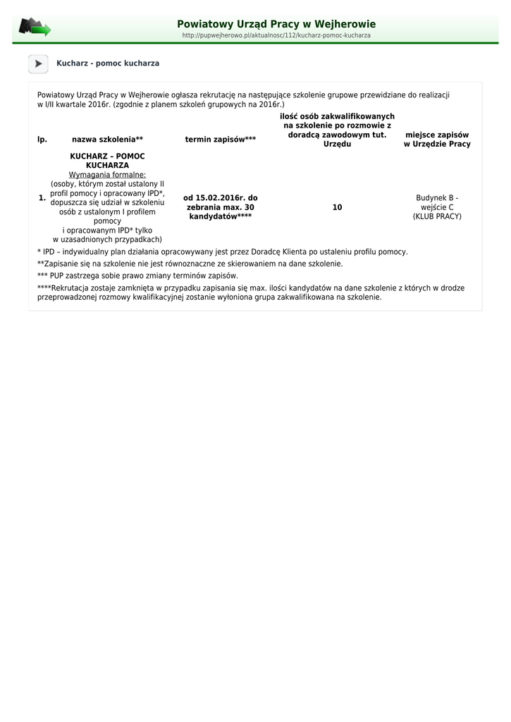 Powiatowy Urząd Pracy w Wejherowie http://pupwejherowo.pl/aktualnosc/112/kucharz-pomoc-kucharza Kucharz - pomoc kucharza Powiatowy Urząd Pracy w Wejherowie ogłasza rekrutację na następujące szkolenie grupowe przewidziane do realizacji w I/II kwartale 2016r. (zgodnie z planem szkoleń grupowych na 2016r.) lp. nazwa szkolenia** KUCHARZ – POMOC KUCHARZA Wymagania formalne: (osoby, którym został ustalony II profil pomocy i opracowany IPD*, 1. dopuszcza się udział w szkoleniu osób z ustalonym I profilem pomocy i opracowanym IPD* tylko w uzasadnionych przypadkach) termin zapisów*** od 15.02.2016r. do zebrania max. 30 kandydatów**** ilość osób zakwalifikowanych na szkolenie po rozmowie z doradcą zawodowym tut. Urzędu miejsce zapisów w Urzędzie Pracy 10 Budynek B wejście C (KLUB PRACY) * IPD – indywidualny plan działania opracowywany jest przez Doradcę Klienta po ustaleniu profilu pomocy. **Zapisanie się na szkolenie nie jest równoznaczne ze skierowaniem na dane szkolenie. *** PUP zastrzega sobie prawo zmiany terminów zapisów. ****Rekrutacja zostaje zamknięta w przypadku zapisania się max. ilości kandydatów na dane szkolenie z których w drodze przeprowadzonej rozmowy kwalifikacyjnej zostanie wyłoniona grupa zakwalifikowana na szkolenie.