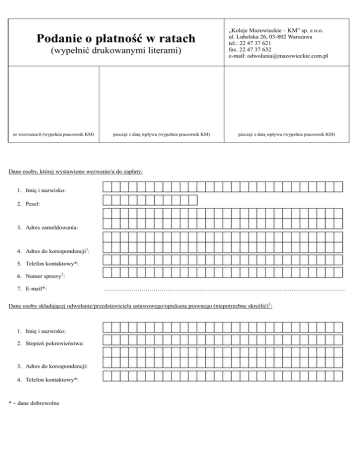 Podanie o płatność w ratach (wypełnić drukowanymi literami) nr wezwania/ń (wypełnia pracownik KM) pieczęć z datą wpływu (wypełnia pracownik KM) „Koleje Mazowieckie – KM” sp. z o.o. ul. Lubelska 26, 03-802 Warszawa tel.: 22 47 37 621 fax. 22 47 37 632 e-mail: [email protected] pieczęć z datą wpływu (wypełnia pracownik KM) Dane osoby, której wystawiono wezwanie/a do zapłaty: nr wezwań (wypełnia pracownik KM) 1. Imię i nazwisko: pieczęć z datą wpływu (wypełnia pracownik KM) pieczęć z datą wpływu (wypełnia pracownik KM) 2. Pesel: 3. Adres zameldowania: 4. Adres do korespondencji1: 5. Telefon kontaktowy*: 6. Numer sprawy2: 7. E-mail*: …………………………………………………………………………….….….……………………. Dane osoby składającej odwołanie/przedstawiciela ustawowego/opiekuna prawnego (niepotrzebne skreślić)3: 1. Imię i nazwisko: 2. Stopień pokrewieństwa: 3. Adres do korespondencji: 4. Telefon kontaktowy*: * - dane dobrowolne Uprzejmie proszę o rozłożenie na raty mojego zadłużenia wynikającego z przejazdu/ów bez ważnego dokumentu przewozu/dokumentu poświadczającego uprawnienie do bezpłatnego albo ulgowego przejazdu. Zobowiązuję się do spłaty w (zaznaczyć wybraną opcję): ratach w wysokości ………………… miesięcznie, począwszy od …………………, aż do całkowitej spłaty zadłużenia, ………………… (podać liczbę rat) ratach miesięcznych, począwszy od …………………, aż do całkowitej spłaty zadłużenia. Uzasadnienie podania o raty: …………………………………………………………………………………………………………………………………………………… …………………………………………………………………………………………………………………………………………………… …………………………………………………………………………………………………………………………………………………… …………………………………………………………………………………………………………………………………………………… …………………………………………………………………………………………………………………………………………………… …………………………………………………………………………………………………………………………………………………… …………………………………………………………………………………………………………………………………………………… …………………………………………………………………………………………………………………………………………………… Wykaz załączonych dokumentów4: …………………………………………………………………………………………………………………………………………………… …………………………………………………………………………………………………………………………………………………… …………………………………………………………………………………………………………………………………………………… Na podstawie art. 24 ust 1 ustawy z dnia 29 sierpnia 1997 r. o ochronie danych osobowych (Dz. U. z 2002 r. nr 101 poz. 926 z późn. zm.) informujemy, że administratorem Pana/Pani danych osobowych jest „Koleje Mazowieckie – KM sp. z o.o. z siedzibą przy ul. Lubelskiej 26, 03-802 w Warszawie. Pana/Pani dane osobowe przetwarzane będą w celu rozpatrzenia odwołania na podstawie Rozporządzenia Ministra Transportu i Budownictwa z dnia 24 lutego 2006 r. w sprawie ustalania stanu przesyłek oraz postępowania reklamacyjnego (Dz. U. Nr 38, poz. 266), a także Regulaminu odprawy oraz przewozu osób, rzeczy i zwierząt przez ,,Koleje Mazowieckie – KM (RP-KM). Osobom, których dane osobowe są przetwarzane, przysługuje prawo dostępu do ich treści oraz poprawiania. ………………………………………………………………. data oraz czytelny podpis Wyrażam zgodę na przetwarzanie przez „Koleje Mazowieckie – KM sp. z o.o. z siedzibą przy ul. Lubelskiej 26, 03-802 w Warszawie, udostępnionych przeze mnie dobrowolnie danych osobowych dotyczących mojego stanu zdrowia/stanu zdrowia osoby pozostającej pod moją opieką w celu przeprowadzenia postępowania dotyczącego rozłożenia zadłużenia na raty. W przypadku braku wyrażenia zgody na przetwarzanie umieszczonych danych osobowych dotyczących stanu zdrowia, dane te zostaną przez administratora usunięte i nieuwzględnione podczas prowadzenia przedmiotowego postępowania 5. ………………………………………………………………. data oraz czytelny podpis 1 Wypełnić jeśli inny niż zameldowania; 2 Podać serię oraz numer/y wezwania/ń do zapłaty, sygnatury akt, numer pisma; 3 Wypełnić jeśli inne niż dane osoby, której wystawiono wezwanie. Podać dane przedstawiciela ustawowego – w przypadku osoby małoletniej, bądź dane opiekuna prawnego – w przypadku osoby ubezwłasnowolnionej; 4 Dołączyć oryginał biletu oraz kopie innych dokumentów potwierdzone przez wystawcę, notariusza lub wyznaczonego pracownika Spółki Koleje Mazowieckie – KM; 5 Podpisać w przypadku dołączenia dokumentów o stanie zdrowia;