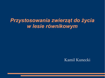 Przystosowania zwierząt do życia w lesie równikowym Kamil Kunecki Mapa Afryki Źrodło: Delorme, wikipedia, Domena publiczna (20.12.2015 r.) Kameleon jemeński BS Thurner Hof, wikipedia, Domena publiczna (20.12.2015 r.) Przystosowania zwierzęcia do życia w lesie równikowym: Niezwykła umiejętność dostosowania ubarwienia ciała do otoczenia. ●Długi język, pokryty lepkim śluzem pomaga w zdobywaniu pokarmu. ●Długi i chwytny ogon pozwala przytrzymać się gałęzi. ●Palce zrośnięte w rodzaj szczypiec pozwalają przytrzymać się gałęzi. ●Prowadzą nadrzewny tryb życia. ● Opracowanie na podstawie: wikipedia (20.12.2015 r.) Dziękuję za uwagę