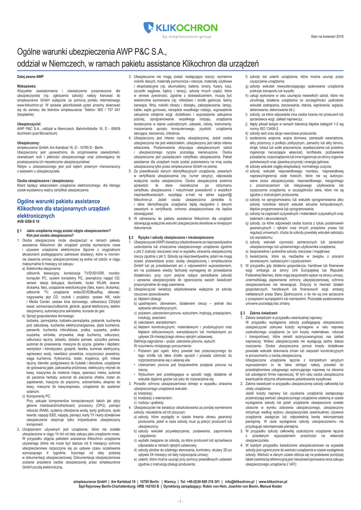 Stan na kwiecień 2016 Ogólne warunki ubezpieczenia AWP P&C S.A., oddział w Niemczech, w ramach pakietu assistance Klikochron dla urządzeń Dalej zwane AWP Wskazówka: Wszystkie zawiadomienia i oświadczenia przeznaczone dla ubezpieczyciela (np. zgłoszenia szkody) należy kierować do simplesurance GmbH wyłącznie za pomocą portalu internetowego www.klikochron.pl. W sprawie jakichkolwiek pytań prosimy skierować się do serwisu dla klientów simplesurance: Telefon: 800 / 707 041 (bezpłatnie) Ubezpieczyciel: AWP P&C S.A., oddział w Niemczech, Bahnhofstraße 16, D - 85609 Aschheim (pod Monachium) Ubezpieczony: simplesurance GmbH, Am Karlsbad 16, D - 10785 D - Berlin Ubezpieczony jest upoważniony do przyjmowania zawiadomień, oświadczeń woli i płatności ubezpieczonego oraz zobowiązany do przekazywania ich niezwłocznie ubezpieczycielowi. Wpływ u ubezpieczonego jest pod kątem prawnym równoznaczny z wpływem u ubezpieczyciela. Osoba ubezpieczona / ubezpieczony: Klient będący właścicielem urządzenia elektronicznego, dla którego został wystawiony ważny certyfikat ubezpieczenia. Ogólne warunki pakietu assistance Klikochron dla stacjonarnych urządzeń elektronicznych AVB GSB-S 16 § 1Jakie urządzenia mogą zostać objęte ubezpieczeniem? Kim jest osoba ubezpieczona? 1.Osoba ubezpieczona może ubezpieczyć w ramach pakietu assistance Klikochron dla urządzeń poniżej wymienione nowe i używane urządzenia elektroniczne (łącznie z oryginalnymi akcesoriami podlegającemu zakresowi dostawy), które w momencie zawarcia umowy ubezpieczeniowej są wolne od szkód, w ciągu maksymalnie 6 miesięcy od zakupu: a) Elektronika stacjonarna: odbiornik telewizyjny, kombinacja TV/DVD/VDR, monitor, komputer PC, system kompletny PC, zewnętrzny napęd CD, serwer, stacja dokująca, słuchawki, router WLAN, skaner, drukarka, faks, urządzenie wielofunkcyjne (faks, ksero, drukarka), odbiornik TV, urządzenie wideo/DVD/BlueRay, dekoder, nagrywarka płyt CD, rzutnik i projektor, zestaw Hifi, radio i Media Center, zestaw kina domowego, odtwarzacz CD/płyt/ kaset, wzmacniacz/odbiornik, głośnik, aparat telefoniczny, telefon stacjonarny, automatyczna sekretarka, konsola do gier. b) Sprzęt gospodarstwa domowego: lodówka, zamrażarka, lodówko-zamrażarka, piekarnik, kuchenka pod zabudowę, kuchenka elektryczna/gazowa, płyta kuchenna, parownik, kuchenka mikrofalowa, pralka, suszarka, pralkosuszarka, wirówka, zmywarka, okap kuchenny, odkurzacz, odkurzacz ręczny, żelazko, żelazko parowe, szczotka parowa, automat do prasowania, maszyna do szycia, golarka i depilator, wentylator i klimatyzator, grzejnik, farelka, kominek elektryczny, ogrzewacz wody, nawilżacz powietrza, oczyszczacz powietrza, waga kuchenna, frytkownica, toster, krajalnica, grill, mikser ręczny, blender, podgrzewacz do butelek i słoiczków, urządzenie do gotowania jajek, pakowarka próżniowa, elektryczny młynek do kawy, maszynka do mielenia mięsa, spieniacz mleka, automat do parzenia herbaty, automat do pieczenia chleba, toster do zapiekanek, maszyna do popcornu, sokowirówka, ekspres do kawy, maszyna do kawy/espresso, urządzenie do opalania/ solarium. c) Komponenty PC: Przy zakupie komponentów komputerowych takich jak płyty główne mainboard/motherboard, procesory (CPU), pamięci robocze (RAM), systemy chłodzenia wodą, karty graficzne, dyski twarde, napędy SSD, napędy, pamięci, karty TV i karty dźwiękowe ubezpieczenie obejmuje tylko indywidualnie ubezpieczony komponent. 2.Urządzeniem używanym jest urządzenie, które nie zostało ubezpieczone w ciągu 14 dni od daty zakupu jako urządzenie nowe. W przypadku objęcia pakietem assistance Klikochron urządzenia używanego (które nie może być starsze niż 6 miesięcy) ochrona ubezpieczeniowa rozpoczyna się po upływie czasu oczekiwania wynoszącego 4 tygodnie, liczonego od daty podanej w dokumentacji ubezpieczeniowej. Dokumentacja ubezpieczeniowa zostanie przesłana osobie ubezpieczonej przez simplesurance GmbH pocztą elektroniczną. 3.Ubezpieczone nie mogą zostać następujące rzeczy: wymienne nośniki danych, materiały pomocnicze i robocze, materiały użytkowe i eksploatacyjne (np. akumulatory, baterie, tonery, fusery, tusz, szczotki węglowe, bębny i lampy), szkody innych części, które w okresie żywotności, zgodnie z doświadczeniem, muszą być wielokrotnie wymieniane (np. chłodziwo i środki gaśnicze, taśmy barwiące, filmy, nośniki obrazu i dźwięku, zabezpieczenia, lampy, kable, węże gumowe), narzędzia wszelkiego rodzaju, wyposażenie zakupione odrębnie wzgl. dodatkowo i wyposażenie zakupione później, oprogramowanie wszelkiego rodzaju, urządzenia dostarczone w stanie uszkodzonym, zabawki, roboty, instrumenty, rozszerzenia sprzętu komputerowego, joysticki, urządzenia sterujące, kierownice, chłodnice. 4.Ubezpieczony jest interes osoby ubezpieczonej. Jeżeli osoba ubezpieczona nie jest właścicielem, ubezpieczony jest także interes właściciela. Postanowienia dotyczące ubezpieczonych szkód i ubezpieczonego ryzyka pozostają nienaruszone. Osoba ubezpieczona jest posiadaczem certyfikatu ubezpieczenia. Pakiet assistance dla urządzeń może zostać przeniesiony na inną osobę ubezpieczoną tylko przez simplesurance GmbH na piśmie. 5.Za prawidłowość danych identyfikacyjnych urządzenia, zawartych w certyfikacie ubezpieczenia (np. numer seryjny), odpowiada wyłącznie osoba ubezpieczona. Osoba ubezpieczona powinna sprawdzić te dane niezwłocznie po otrzymaniu certyfikatu ubezpieczenia i natychmiast powiadomić o wszelkich nieprawidłowościach, wysyłając e-mail na adres support@ klikochron.pl. Jeżeli osoba ubezpieczona zaniedba to i dane identyfikacyjne urządzenia będą niezgodne z danymi zawartymi w certyfikacie, ochrona ubezpieczoniowa nie będzie obowiązywać. 6.W odniesieniu do pakietu assistance Klikochron dla urządzeń obowiązują wyłącznie warunki ubezpieczenia określone w niniejszym dokumencie. 
