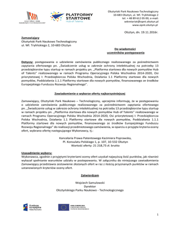 Olsztyński Park Naukowo-Technologiczny 10-683 Olsztyn, ul. Wł. Trylińskiego 2 tel. + 48 89 612 05 00, e-mail: [email protected] www.opnt.olsztyn.pl Olsztyn, dn. 19.11.2016r. Zamawiający Olsztyński Park Naukowo Technologiczny ul. Wł. Trylińskiego 2, 10-683 Olsztyn Do wiadomości uczestników postępowania Dotyczy: postępowania o udzielenie zamówienia publicznego realizowanego za pośrednictwem zapytania ofertowego pn. „Świadczenie usług w zakresie ochrony intelektualnej na potrzeby 13 przedsiębiorstw typu startup w ramach projektu pn. „Platforma startowa dla nowych pomysłów Hub of Talents” realizowanego w ramach Programu Operacyjnego Polska Wschodnia 2014-2020, Osi priorytetowej I: Przedsiębiorcza Polska Wschodnia, Działania 1.1 Platformy startowe dla nowych pomysłów, Poddziałania 1.1.1 Platformy startowe dla nowych pomysłów, finansowanego ze środków Europejskiego Funduszu Rozwoju Regionalnego”. Zawiadomienie o wyborze oferty najkorzystniejszej Zamawiający, Olsztyński Park Naukowo – Technologiczny, uprzejmie informuję, że w postępowaniu o udzielenie zamówienia publicznego realizowanego za pośrednictwem zapytania ofertowego pn. „Świadczenie usług w zakresie ochrony intelektualnej na potrzeby 13 przedsiębiorstw typu startup w ramach projektu pn. „Platforma startowa dla nowych pomysłów Hub of Talents” realizowanego w ramach Programu Operacyjnego Polska Wschodnia 2014-2020, Osi priorytetowej I: Przedsiębiorcza Polska Wschodnia, Działania 1.1 Platformy startowe dla nowych pomysłów, Poddziałania 1.1.1 Platformy startowe dla nowych pomysłów, finansowanego ze środków Europejskiego Funduszu Rozwoju Regionalnego” do realizacji przedmiotowego zamówienia, w oparciu o przyjęte kryteria oceny ofert, wybrano ofertę następującego Wykonawcy, tj.: Kancelaria Prawa Patentowego Kazimiera Poprawska, Pl. Konsulatu Polskiego 1, p. 107, 10-532 Olsztyn Wartość oferty: 21 218,73 zł. brutto Uzasadnienie wyboru: Wykonawca, zgodnie z przyjętymi kryteriami oceny ofert uzyskał najwyższą ilość punktów, jak również wykazał spełnianie warunków udziału w postepowaniu. W załączniku do niniejszego zawiadomienia Zamawiający przedstawia zestawienie złożonych ofert w raz z ilością przyznanych punktów w ramach ustanowionych kryteriów oceny ofert. Zatwierdzam Wojciech Samulowski Dyrektor Olsztyńskiego Parku Naukowo - Technologicznego 1 Olsztyński Park Naukowo-Technologiczny 10-683 Olsztyn, ul. Wł. Trylińskiego 2 tel. + 48 89 612 05 00, e-mail: [email protected] www.opnt.olsztyn.pl Załącznik nr 1: Zestawienie złożonych ofert wraz z punktacją przyznaną przez Zamawiającego w ramach ustanowionych kryteriów oceny ofert. 1) Jarzynka i Wspólnicy Kancelaria Prawno-Patentowa sp. z o.o. ul. Słomińskiego 19/522, 00-195 Warszawa Wartość oferty: 29 211,00 zł. brutto (56,32 pkt.) Doświadczenie zawodowe osób wyznaczonych do realizacji przedmiotowego zamówienia: 20 pkt. Łączna ilość punktów: 76,32 pkt. 2) Izabela Raniszewska, ul. Narutowicza 23d m7, 10-581 Olsztyn Wartość oferty: 23 985,00 zł. brutto (68,64 pkt.) Doświadczenie zawodowe osób wyznaczonych do realizacji przedmiotowego zamówienia: (18,86 pkt.) Łączna ilość punktów: (87,5 pkt.) 3) Joanna Kluczewska – Strojny, Rzecznik Patentowy, ul. Głowackiego 98, 32-300 Olkusz Wartość oferty: 23 959,00 zł. brutto (68,72 pkt.) Doświadczenie zawodowe osób wyznaczonych do realizacji przedmiotowego zamówienia: (4,16 pkt.) Łączna ilość punktów: 72,88 pkt. 4) Kancelaria Patentowa KWANT Bogdan Niesiobędzki, ul. Grunwaldzka 77D/1, 82-300 Elbląg Wartość oferty: 23 779,60 zł. brutto (69,12 pkt.) Doświadczenie zawodowe osób wyznaczonych do realizacji przedmiotowego zamówienia: (8 pkt.) Łączna ilość punktów: 77,12 pkt. 5) Kancelaria Prawa Patentowego Kazimiera Poprawska, Pl. Konsulatu Polskiego 1, p. 107, 10-532 Olsztyn Wartość oferty: 21 218,73 zł. brutto (77,60 pkt.) Doświadczenie zawodowe osób wyznaczonych do realizacji przedmiotowego zamówienia: (14,94 pkt.) Łączna ilość punktów: 92,54 pkt. 6) AOMB Polska sp. z o.o., ul. Emilii Plater 53, 00-113 Warszawa Wartość oferty: 20 592,00 zł. brutto (80 pkt.) Doświadczenie zawodowe osób wyznaczonych do realizacji przedmiotowego zamówienia: (8,34 pkt.) Łączna ilość punktów: 88,34 pkt. 2