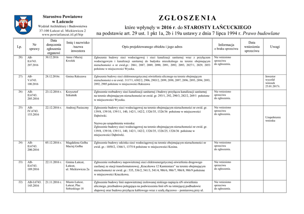 Lp. Starostwo Powiatowe w Łańcucie ZGŁOSZENIA Wydział Architektury i Budownictwa 37-100 Łańcut ul. Mickiewicza 2 www.powiatlancut.itl.pl/bip które wpłynęły w 2016 r. do STAROSTY ŁAŃCUCKIEGO na podstawie art. 29 ust. 1 pkt 1a, 2b i 19a ustawy z dnia 7 lipca 1994 r. Prawo budowlane Nr sprawy Data doręczenia zgłoszenia organowi Imię i nazwisko /nazwa inwestora Opis projektowanego obiektu i jego adres Informacja o braku sprzeciwu 28) ABII.6743. 207.2016 30.12.2016 Anna i Maciej Kwolek Zgłoszenie budowy sieci wodociągowej i sieci kanalizacji sanitarnej wraz z przyłączem wodociągowym i kanalizacji sanitarnej do budynku mieszkalnego na terenie obejmującym nieruchomości o nr ewid.gr.: 2061, 2087, 2089, 2090, 2091, 2092, 2093, 2027/1, 2029, 2053 położone w miejscowości Wysoka. 27) ABV.6743. 100.2016 28.12.2016r. Gmina Rakszawa Zgłoszenie budowy sieci elektroenergetycznej oświetlenia ulicznego na terenie obejmującym nieruchomości o nr ewid.: 3117/1, 6302/2, 2906, 2903/2, 2899, 2898, 2897, 2896, 2895, 2894, 2893, 2892, 2905 położone w miejscowości Rakszawa 26) ABII.6743. 205.2016 23.12.2016 r. Krzysztof Szkutnik Zgłoszenie rozbudowy sieci kanalizacji sanitarnej i budowy przyłącza kanalizacji sanitarnej na terenie obejmującym nieruchomości nr ewid. gr. 293/1, 292, 290/3, 282/2, 269/1 położone w miejscowości Wysoka. Nie wniesiono sprzeciwu do zgłoszenia. 25) ABIV.6743. 153.2016 22.12.2016 r. Andrzej Pasieczny Zgłoszenie budowy sieci wodociągowej na terenie obejmującym nieruchomości nr ewid. gr. 139/8, 139/10, 139/11, 140, 142/1, 142/2, 1326/35, 1326/36 położone w miejscowości Dąbrówki. Nie wniesiono sprzeciwu do zgłoszenia. Data wniesienia sprzeciwu Uwagi Nie wniesiono sprzeciwu do zgłoszenia. Inwestor wycofał wniosek 25.01.2017r. Uzupełnienie wniosku Nazwa po uzupełnieniu wniosku: Zgłoszenie budowy sieci wodociągowej na terenie obejmującym nieruchomości nr ewid. gr. 139/8, 139/10, 139/11, 140, 142/1, 142/2, 1326/35, 1326/25, 1326/36 położone w miejscowości Dąbrówki. 24) ABII.6743. 200.2016 05.12.2016 r. Magdalena Golba Maciej Golba Zgłoszenie budowy odcinka sieci wodociągowej na terenie obejmującym nieruchomości nr ewid. gr.: 1050/2, 1366/1, 1375/4 położone w miejscowości Kosina. Nie wniesiono sprzeciwu do zgłoszenia. 23) ABII.6743. 189.2016 22.11.2016 r. Gmina Łańcut, Łańcut, ul. Mickiewicza 2a Zgłoszenie rozbudowy napowietrznej sieci elektroenergetycznej oświetlenia drogowego zasilanej ze stacji transformatorowej „Kraczkowa 12 Kamieniarz” na terenie obejmującym nieruchomości nr ewid. gr.: 535, 536/2, 541/3, 541/4, 986/6, 986/7, 986/8, 986/9 położone w miejscowości Kraczkowa. Nie wniesiono sprzeciwu do zgłoszenia. 22) AB-I.6743. 145.2016 21.11.2016 r. Miasto Łańcut, Łańcut, Plac Sobieskiego 18 Zgłoszenie budowy linii napowietrznej izolowanej niskiego napięcia nN oświetlenia ulicznego, przebudowa polegająca na podwieszeniu linii nN na istniejącej podbudowie słupowej oraz budowa przyłącza kablowego wraz z szafą złączowo – pomiarową przy ul. Nie wniesiono sprzeciwu do zgłoszenia. Lp. Starostwo Powiatowe w Łańcucie ZGŁOSZENIA Wydział Architektury i Budownictwa 37-100 Łańcut ul. Mickiewicza 2 www.powiatlancut.itl.pl/bip które wpłynęły w 2016 r. do STAROSTY ŁAŃCUCKIEGO na podstawie art. 29 ust. 1 pkt 1a, 2b i 19a ustawy z dnia 7 lipca 1994 r. Prawo budowlane Nr sprawy Data doręczenia zgłoszenia organowi Imię i nazwisko /nazwa inwestora Opis projektowanego obiektu i jego adres Informacja o braku sprzeciwu Data wniesienia sprzeciwu Uwagi Kraszewskiego w Łańcucie na terenie obejmującym nieruchomości 2207/4, 1861/4, 1846/4, 1846/3, 1846/2, 1844/1, 1861/1, 1831/4, 2079/5, 1860, 1893/1, 1886, 1885, 1883/2, 1883/4, 1883/3, 1882/1, 1880/6, 1880/5, 1880/3, 1880/1, 1879, 1878/8 położone w Łańcucie. 21) ABII.6743. 179.2016 18.10.2016 r. Gmina Łańcut, Łańcut, ul. Mickiewicza 2A Zgłoszenie budowy sieci elektroenergetycznej oświetlenia drogowego wraz z przebudową linii elektroenergetycznej napowietrznej niskiego napięcia i przyłącza energii elektrycznej do budynku mieszkalnego na terenie obejmującym nieruchomości nr ewid. gr.: 145, 146, 147, 148, 150, 151, 152, 153, 155, 156, 158, 159, 160, 161, 162, 163, 164, 165, 166, 1496/1, 352/2, 353/1, 353/2, 354/1, 354/2, 355/2, 355/5, 355/6, 356, 357, 358, 359, 360, 361, 362, 363, 364, 366, 365/2, 367, 369, 370, 371, 372, 512 położone w miejscowości Rogóżno. Nie wniesiono sprzeciwu do zgłoszenia. Uzupełnienie wniosku Nazwa po uzupełnieniu wniosku: Zgłoszenie budowy sieci elektroenergetycznej oświetlenia drogowego, przebudową sieci elektroenergetycznej napowietrznej niskiego napięcia na terenie obejmującym nieruchomości nr ewid. gr.: 145, 146, 147, 148, 150, 151, 152, 153, 155, 156, 158, 160, 161, 162, 163, 164, 165, 166, 1496/1, 353/2, 354/1, 354/2, 355/2, 355/5, 355/6, 356, 357, 358, 359, 360, 361, 362, 363, 364, 366, 365/2, 367, 369, 370, 371, 372, 512 położone w miejscowości Rogóżno. 20) ABIV.6743. 137.2016 14.10.2016 r. Gmina Czarna, Czarna 260 Zgłoszenie budowy sieci elektroenergetycznej oświetlenia drogowego na terenie obejmującym nieruchomości nr ewid. gr. 3112/1, 3112/2, 3115, 3116/6 położone w miejscowości Krzemienica. Nie wniesiono sprzeciwu do zgłoszenia. 19) ABV.6743. 77.2016 12.10.2016 r. Gmina Rakszawa, Rakszawa 506 Zgłoszenie budowy sieci elektroenergetycznej oświetlenia ulicznego na terenie obejmującym nieruchomości nr ewid. gr. 6775, 6774, 6766, 6773, 6822/1, 6858/3 położone w miejscowości Rakszawa. Nie wniesiono sprzeciwu do zgłoszenia. 18) ABIV.6743. 133.2016 11.10.2016 r. Gmina Czarna, Czarna 260 Zgłoszenie budowy sieci elektroenergetycznej oświetlenia drogowego na terenie obejmującym nieruchomości nr ewid. gr. 999/20, 999/21, 999/22, 999/104, 999/107, 999/114, 999/150, 823/10 położone w miejscowości Krzemienica. Nie wniesiono sprzeciwu do zgłoszenia. Nazwa po uzupełnieniu w