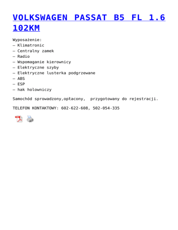 VOLKSWAGEN PASSAT B5 FL 1.6 102KM Wyposażenie: – Klimatronic – Centralny zamek – Radio – Wspomaganie kierownicy – Elektryczne szyby – Elektryczne lusterka podgrzewane – ABS – ESP – hak holowniczy Samochód sprowadzony,opłacony, przygotowany do rejestracji. TELEFON KONTAKTOWY: 602-622-608, 502-054-335