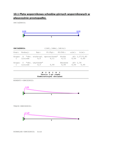 10.1 Płyta wspornikowa schodów górnych wspornikowych w płaszczyźnie prostopadłej. OBCIĄŻENIA: 6,00 4,11 6,00 4,11 1 OBCIĄŻENIA: ([kN],[kNm],[kN/m]) -----------------------------------------------------------------Pręt: Rodzaj: Kąt: P1(Tg): P2(Td): a[m]: b[m]: -----------------------------------------------------------------Grupa: A "obc. stałe-pł. spocznikowa" Stałe γf= 1,27/0,83 1 Liniowe 0,0 4,11 4,11 0,00 0,60 Grupa: C "obc. użytkowe" Zmienne γf= 1,30 1 Liniowe 0,0 6,00 6,00 0,00 0,60 -----------------------------------------------------------------================================================================== W Y N I K I Teoria I-go rzędu Kombinatoryka obciążeń ================================================================== MOMENTY-OBWIEDNIE: -3,06 -2,73 1 TNĄCE-OBWIEDNIE: 10,19 9,10 1 NORMALNE-OBWIEDNIE: brak SIŁY PRZEKROJOWE - WARTOŚCI EKSTREMALNE: T.I rzędu Obciążenia obl.: Ciężar wł.+"Kombinacja obciążeń" -----------------------------------------------------------------Pręt: x[m]: M[kNm]: Q[kN]: N[kN]: Kombinacja obciążeń: -----------------------------------------------------------------1 0,600 0,00* 0,00 0,00 AC 0,000 -3,06* 10,19 0,00 AC 0,000 -3,06 10,19* 0,00 AC 0,000 -3,06 10,19 0,00* AC 0,600 0,00 0,00 0,00* AC 0,000 -3,06 10,19 0,00* AC 0,600 0,00 0,00 0,00* AC -----------------------------------------------------------------* = Max/Min Cechy przekroju: zadanie SCHODY_W, pręt nr 1, przekrój: xa=0,00 m, xb=0,60 m Wymiary przekroju [cm]: h=15,0, b=100,0, Cechy materiałowe dla sytuacji stałej lub przejściowej BETON: B25 fck= 20,0 MPa, fcd=α·fck/γc=1,00×20,0/1,50=13,3 MPa 15,00 Cechy geometryczne przekroju betonowego: Ac=1500 cm2, Jcx=28125 cm4, Jcy=1250000 cm4 100,00 Siły przekrojowe: zadanie: SCHODY_W, pręt nr 1, przekrój: xa=0,00 m, xb=0,60 m Obciążenia działające w płaszczyźnie układu: AC Momenty zginające: Mx = 3,06 kNm, My = 0,00 kNm, Siły poprzeczne: Vy = 10,19 kN, Vx = 0,00 kN, Siła osiowa: N = 0,00 kN = NSd, . Zbrojenie wymagane: (zadanie SCHODY_W, pręt nr 1, przekrój: xa=0,00 m, xb=0,60 m) a1 h d zc Fs1 Fc 100,00 100×0,66/1500=0,04 % Wielkości geometryczne [cm]: Wielkości obliczeniowe: NSd=0,00 kN, MSd=√(MSdx2+ MSdy2) = √(3,062+0,002) =3,06 kNm fcd=13,3 MPa, fyd=350 MPa (ftd=435 MPa uwzgl. wzmocnienia) , 15,00Zbrojenie rozciągane (εs1=10,00 ‰): As1=0,66 cm2 < min As1=1,87 cm2, przyjęto As1=1,87 cm2, ⇒ (3¤10 = 2,36 cm2), Dodatkowe zbrojenie ściskane(*As2=0 nie jest obliczeniowo wymagane.*|* (εc=-0,59 ‰,): As2=0,00 cm2 ⇒ (0¤10 = 0,00 cm2) *) As=As1+As2=0,66 cm2, ρ=100×As/Ac= h=15,0, d=12,5, x=0,7 (ξ=0,056), a1=2,5, ac=0,2, zc=12,3, Acc=70 cm2, εc=-0,59 ‰, εs1=10,00 ‰, Wielkości statyczne [kN, kNm]: Fc= -24,93, Fs1 = 24,93, Mc= 1,81, Ms1 = 1,25, Warunki równowagi wewnętrznej: Fc+Fs1=-24,93+(24,93)=-0,00 kN (NSd=0,00 kN) Mc+Ms1=1,81+(1,25)=3,06 kNm (MSd=3,06 kNm) Nośność przekroju prostopadłego: zadanie SCHODY_W, pręt nr 1, przekrój: xa=0,00 m, xb=0,60 m Wielkości obliczeniowe: NSd=0,00 kN, MSd=√(MSdx2+ MSdy2) = √(3,062+0,002) =3,06 kNm fcd=13,3 MPa, fyd=350 MPa (ftd=435 MPa uwzgl. wzmocnienia) , 4¤10 a1 Fs1 2 h d zc 15,00Zbrojenie rozciągane: As1=3,14 cm , Fs2 a2 Fc Zbrojenie ściskane: As2=3,14 cm2, 4¤10 As=As1+As2=6,28 cm2, ρ=100×As/Ac= 100,00 100×6,28/1500=0,42 % Wielkości geometryczne [cm]: h=15,0, d=12,5, x=3,0 (ξ=0,237), a1=2,5, a2=2,5, ac=1,0, zc=11,5, Acc=296 cm2, εc=-0,13 ‰, εs2=-0,02 ‰, εs1=0,43 ‰, Wielkości statyczne [kN, kNm]: Fc= -25,44, Fs1 = 26,73, Fs2 = -1,29, Mc= 1,66, Ms1 = 1,34, Ms2 = 0,06, Warunek stanu granicznego nośności: MRd = 14,76 kNm > MSd =Mc+Ms1+Ms2=1,66+(1,34)+(0,06)=3,06 kNm Zbrojenie poprzeczne (strzemiona) zadanie SCHODY_W, pręt nr 1 Na całej długości pręta przyjęto strzemiona o średnicy φ=8 mm ze stali A-III, dla której f ywd = 350 MPa. Minimalny stopień zbrojenia na ścinanie: ρw,min = 0,08 f ck / fyk = 0,08× 20 / 410 = 0,00087 60,0 Rozstaw strzemion: Strefa nr 1 Początek i koniec strefy: xa = 0,0 xb = 60,0 cm Maksymalny rozstawy strzemion: smax = 0,75 d = 0,75×125 = 94 smax ≤ 400 mm przyjęto smax = 94 mm. Przyjęto strzemiona 2-cięte, prostopadłe do osi pręta o rozstawie 9,4 cm, dla których stopień zbrojenia na ścinanie wynosi: ρw = Asw /(s bw sin α) = 1,01 / (9,4×100,0×1,000) = 0,00107 ρw = 0,00107 > 0,00087 = ρw min Nośność zbrojenia podłużnego zadanie SCHODY_W, pręt nr 1. Sprawdzenie siły przenoszonej przez zbrojenie rozciągane dla x = 0,001 m: ∆Ftd = 0,5 |VSd| (cotθ - VRd32/ VRd3 cotα) = 0,5×10,19×(1,000) = 5,09 kN Sumaryczna siła w zbrojeniu rozciąganym: Ftd = Ftd,m + ∆Ftd = 26,73 + 5,09 = 31,82 kN; Ftd ≤ Ftd,max = 26,73 kN Przyjęto Ftd = 26,73 kN Ftd = 26,73 < 109,96 = 3,14×350 ×10-1 = As fyd Zarysowanie zadanie SCHODY_W, pręt nr 1, Położenie przekroju: Siły przekrojowe: Wymiary przekroju: x = 0,000 m MSd = -1,77 kNm NSd = 0,00 kN VSd = 5,89 kN bw = 100,0 cm d = h - a1 = 15,0 - 2,5 = 12,5 cm Ac = 1500 cm2 Wc = 3750 cm3 Minimalne zbrojenie: Wymagane pole zbrojenia rozciąganego dla zginania, przy naprężeniach wywołanych przyczynami zewnętrznymi, wynosi: As = kc k fct,eff Act / σs,lim = = 0,4×1,0×2,2×750 / 320 = 2,06 cm2 As1 = 3,14 > 2,06 = As Zarysowanie: Mcr = fctm Wc = 2,2×3750 ×10-3 = 8,25 kNm MSd = 1,77 < 8,25 = Mcr Przekrój niezarysowany. Szerokość rozwarcia rysy ukośnej: Rysy ukośne nie występują. Ugięcia zadanie SCHODY_W, pręt nr 1 Ugięcia wyznaczono dla charakterystycznych obciążeń długotrwałych. Współczynniki pełzania dla obciążeń długotrwałych przyjęto równy φ(t,to) = 2,00. E cm 30000 Ec,eff = = = 10000 MPa 1 + φ( t , t o ) 1 + 2,00 Moment rysujący: Mcr = fctm Wc = 2,2×3750 ×10-3 = 8,25 kNm Całkowity moment zginający MSd = -2,47 kN nie powoduje zarysowania przekroju. Sztywność dla długotrwałego działania obciążeń długotrwałych: Sztywność na zginanie wyznaczona dla momentu MSd = -1