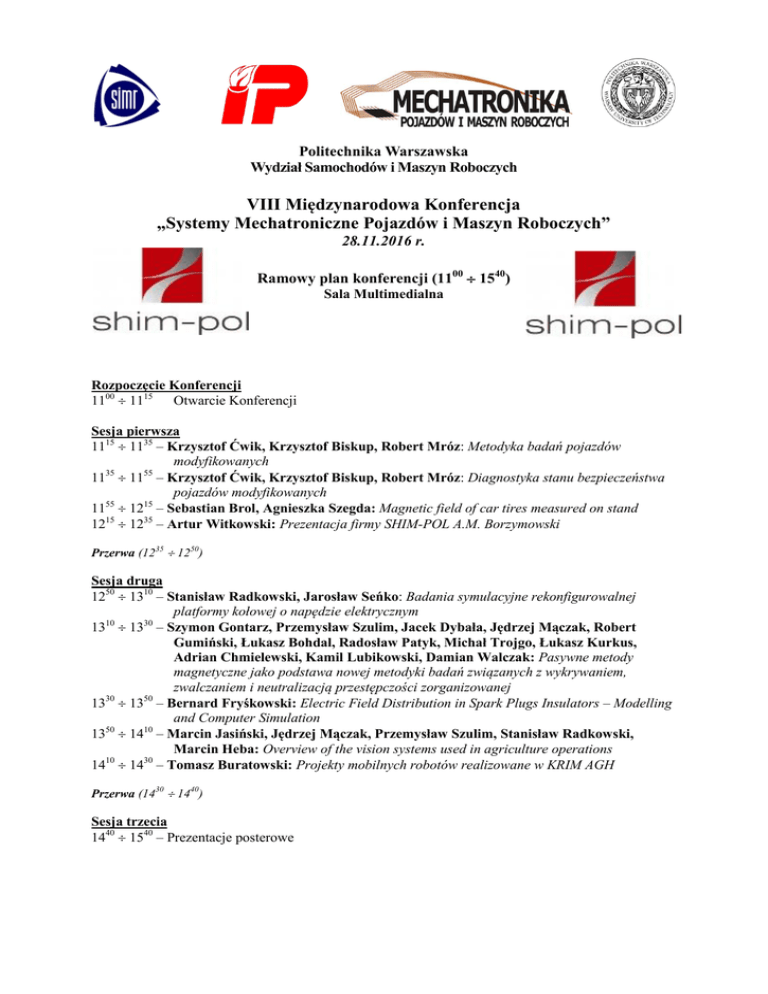 Politechnika Warszawska Wydział Samochodów i Maszyn Roboczych VIII Międzynarodowa Konferencja „Systemy Mechatroniczne Pojazdów i Maszyn Roboczych” 28.11.2016 r. Ramowy plan konferencji (1100 1540) Sala Multimedialna Rozpoczęcie Konferencji 1100 1115 Otwarcie Konferencji Sesja pierwsza 1115 1135 – Krzysztof Ćwik, Krzysztof Biskup, Robert Mróz: Metodyka badań pojazdów modyfikowanych 35 55 11 11 – Krzysztof Ćwik, Krzysztof Biskup, Robert Mróz: Diagnostyka stanu bezpieczeństwa pojazdów modyfikowanych 1155 1215 – Sebastian Brol, Agnieszka Szegda: Magnetic field of car tires measured on stand 1215 1235 – Artur Witkowski: Prezentacja firmy SHIM-POL A.M. Borzymowski Przerwa (1235 1250) Sesja druga 1250 1310 – Stanisław Radkowski, Jarosław Seńko: Badania symulacyjne rekonfigurowalnej platformy kołowej o napędzie elektrycznym 1310 1330 – Szymon Gontarz, Przemysław Szulim, Jacek Dybała, Jędrzej Mączak, Robert Gumiński, Łukasz Bohdal, Radosław Patyk, Michał Trojgo, Łukasz Kurkus, Adrian Chmielewski, Kamil Lubikowski, Damian Walczak: Pasywne metody magnetyczne jako podstawa nowej metodyki badań związanych z wykrywaniem, zwalczaniem i neutralizacją przestępczości zorganizowanej 1330 1350 – Bernard Fryśkowski: Electric Field Distribution in Spark Plugs Insulators – Modelling and Computer Simulation 50 10 13 14 – Marcin Jasiński, Jędrzej Mączak, Przemysław Szulim, Stanisław Radkowski, Marcin Heba: Overview of the vision systems used in agriculture operations 1410 1430 – Tomasz Buratowski: Projekty mobilnych robotów realizowane w KRIM AGH Przerwa (1430 1440) Sesja trzecia 1440 1540 – Prezentacje posterowe Prezentacje posterowe 1. Sebastian Brol, Agnieszka Szegda: The design of device for measuring of car tires magnetization 2. Adrian Chmielewski, Przemysław Szulim: Badania modelowe oraz symulacyjne elektrochemicznych magazynów energii 3. Rafał Czok, Sebastian Brol: Flow losses in the pneumatic-hydraulic drive system 4. Marcin Franczuk, Piotr Skawiński, Hubert Trzewik: Opracowanie modeli aerodynamicznych ultralekkiego pojazdu "Hussar" w celu polepszenia współczynnika czołowego oporu aerodynamicznego Cx 5. Szymon Gontarz, Krzysztof Biskup: Wykorzystanie zjawisk magnetycznych w identyfikacji pojazdów 6. Piotr Jeżak, Stanisław Radkowski: Failure Oriented Control System of Vehicle Suspension 7. Łukasz Kurkus, Łukasz Zieliński, Damian Walczak, Hubert Trzewik: Koncepcja algorytmu sterowania modelem robota z uwzględnieniem zależności kinematycznych 8. Arkadiusz Kwaśniewski, Paweł Ciężkowski: Koncepcja osprzętu kruszącego dla koparki 9. Jakub Lorencki: Sygnały ostrzegawcze w pojazdach elektrycznych i hybrydowych 10. Piotr Mróz, Sebastian Brol: Sequential control of pneumatic-hydraulic drive 11. Roman Rogacki, Jan Szczepaniak, Michał Maleszka*, Jacek Wojciechowski, Jarosław Mac: Budowa modułowego siłownika elektromagnetycznego 12. Krzysztof Rokicki: GPS and OBD data in testing of the vehicle dynamics 13. Pawel Skalski: Struktura inteligentna z elastomerem magnetoreologicznym 14. Krzysztof Szczurowski, Damian Walczak, Krzysztof Więcławski, Łukasz Zieliński: Analysis of operation gas injector used in dual-fuel engines, proposal for defining the flow factor 15. Michał Trojgo, Paweł Zawistowski: Projekt i budowa uniwersalnego testera motocyklowych cewek zapłonowych 16. Damian Walczak, Łukasz Zieliński: Analiza emisji spalin w dwupaliwowym silniku o zapłonie samoczynnym zasilanym olejem napędowym z dodatkiem estrów i LPG 17. Aleksandra Waszczuk-Młyńska, Stanisław Radkowski: Model uszkodzonej membrany 18. Przemysław Winiarski, Sebastian Brol: Energy recovery in system with hydraulicpneumatic and internal combustion engine 19. Przemysław Winiarski, Sebastian Brol, Sebastian Podsędek: Conceptions of coupling of powertrains in hydraulic pneumatic hybrid with internal combustion engine, including energy balances of existing solutions 20. Łukasz Zieliński, Jarosław Seńko, Damian Walczak, Łukasz Kurkus: System sterowania bezzałogową platformą ratunkową z napędem rozproszonym zorientowanym na rekonfigurację