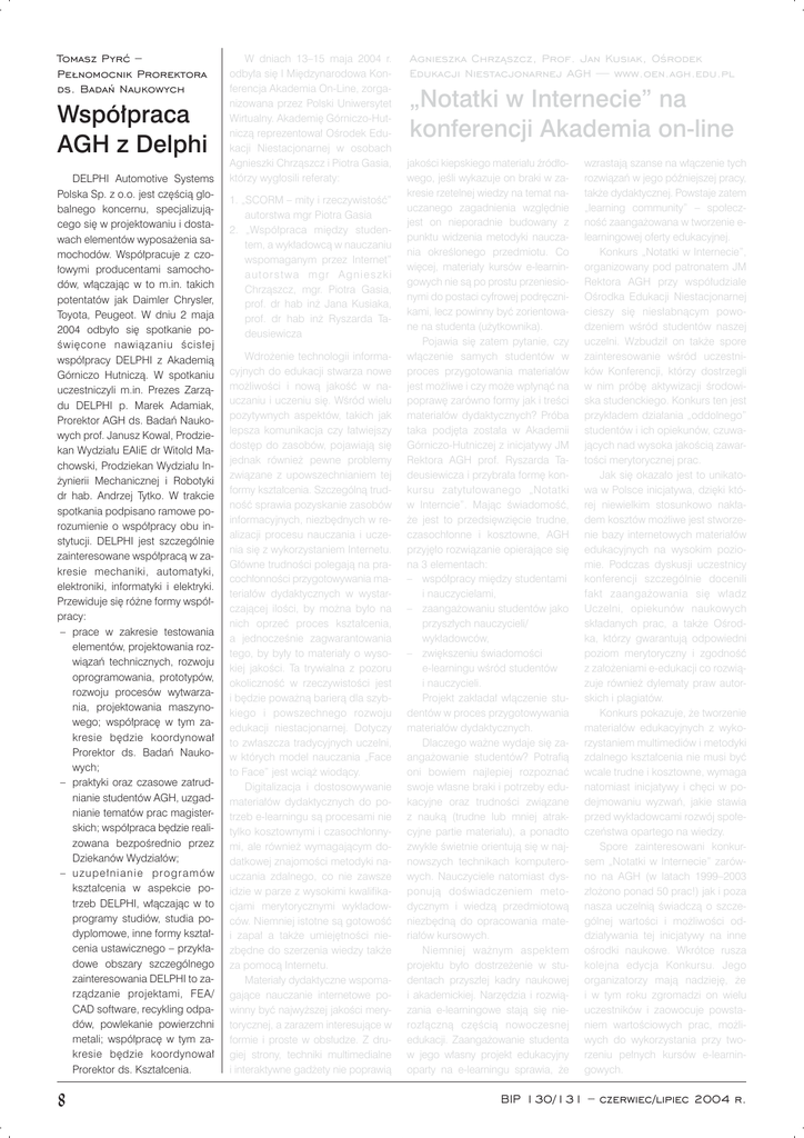 Tomasz Pyræ – Pe³nomocnik Prorektora ds. Badañ Naukowych Wspó³praca AGH z Delphi DELPHI Automotive Systems Polska Sp. z o.o. jest czêœci¹ globalnego koncernu, specjalizuj¹cego siê w projektowaniu i dostawach elementów wyposa¿enia samochodów. Wspó³pracuje z czo³owymi producentami samochodów, w³¹czaj¹c w to m.in. takich potentatów jak Daimler Chrysler, Toyota, Peugeot. W dniu 2 maja 2004 odby³o siê spotkanie poœwiêcone nawi¹zaniu œcis³ej wspó³pracy DELPHI z Akademi¹ Górniczo Hutnicz¹. W spotkaniu uczestniczyli m.in. Prezes Zarz¹du DELPHI p. Marek Adamiak, Prorektor AGH ds. Badañ Naukowych prof. Janusz Kowal, Prodziekan Wydzia³u EAIiE dr Witold Machowski, Prodziekan Wydzia³u In¿ynierii Mechanicznej i Robotyki dr hab. Andrzej Tytko. W trakcie spotkania podpisano ramowe porozumienie o wspó³pracy obu instytucji. DELPHI jest szczególnie zainteresowane wspó³prac¹ w zakresie mechaniki, automatyki, elektroniki, informatyki i elektryki. Przewiduje siê ró¿ne formy wspó³pracy: – prace w zakresie testowania elementów, projektowania rozwi¹zañ technicznych, rozwoju oprogramowania, prototypów, rozwoju procesów wytwarzania, projektowania maszynowego; wspó³pracê w tym zakresie bêdzie koordynowa³ Prorektor ds. Badañ Naukowych; – praktyki oraz czasowe zatrudnianie studentów AGH, uzgadnianie tematów prac magisterskich; wspó³praca bêdzie realizowana bezpoœrednio przez Dziekanów Wydzia³ów; – uzupe³nianie programów kszta³cenia w aspekcie potrzeb DELPHI, w³¹czaj¹c w to programy studiów, studia podyplomowe, inne formy kszta³cenia ustawicznego – przyk³adowe obszary szczególnego zainteresowania DELPHI to zarz¹dzanie projektami, FEA/ CAD software, recykling odpadów, powlekanie powierzchni metali; wspó³pracê w tym zakresie bêdzie koordynowa³ Prorektor ds. Kszta³cenia. 8 W dniach 13–15 maja 2004 r. odby³a siê I Miêdzynarodowa Konferencja Akademia On-Line, zorganizowana przez Polski Uniwersytet Wirtualny. Akademiê Górniczo-Hutnicz¹ reprezentowa³ Oœrodek Edukacji Niestacjonarnej w osobach Agnieszki Chrz¹szcz i Piotra Gasia, którzy wyg³osili referaty: 1. „SCORM – mity i rzeczywistoœæ” autorstwa mgr Piotra Gasia 2. „Wspó³praca miêdzy studentem, a wyk³adowc¹ w nauczaniu wspomaganym przez Internet” autorstwa mgr Agnieszki Chrz¹szcz, mgr. Piotra Gasia, prof. dr hab in¿ Jana Kusiaka, prof. dr hab in¿ Ryszarda Tadeusiewicza Wdro¿enie technologii informacyjnych do edukacji stwarza nowe mo¿liwoœci i now¹ jakoœæ w nauczaniu i uczeniu siê. Wœród wielu pozytywnych aspektów, takich jak lepsza komunikacja czy ³atwiejszy dostêp do zasobów, pojawiaj¹ siê jednak równie¿ pewne problemy zwi¹zane z upowszechnianiem tej formy kszta³cenia. Szczególn¹ trudnoœæ sprawia pozyskanie zasobów informacyjnych, niezbêdnych w realizacji procesu nauczania i uczenia siê z wykorzystaniem Internetu. G³ówne trudnoœci polegaj¹ na pracoch³onnoœci przygotowywania materia³ów dydaktycznych w wystarczaj¹cej iloœci, by mo¿na by³o na nich oprzeæ proces kszta³cenia, a jednoczeœnie zagwarantowania tego, by by³y to materia³y o wysokiej jakoœci. Ta trywialna z pozoru okolicznoœæ w rzeczywistoœci jest i bêdzie powa¿n¹ barier¹ dla szybkiego i powszechnego rozwoju edukacji niestacjonarnej. Dotyczy to zw³aszcza tradycyjnych uczelni, w których model nauczania „Face to Face” jest wci¹¿ wiod¹cy. Digitalizacja i dostosowywanie materia³ów dydaktycznych do potrzeb e-learningu s¹ procesami nie tylko kosztownymi i czasoch³onnymi, ale równie¿ wymagaj¹cym dodatkowej znajomoœci metodyki nauczania zdalnego, co nie zawsze idzie w parze z wysokimi kwalifikacjami merytorycznymi wyk³adowców. Niemniej istotne s¹ gotowoœæ i zapa³ a tak¿e umiejêtnoœci niezbêdne do szerzenia wiedzy tak¿e za pomoc¹ Internetu. Materia³y dydaktyczne wspomagaj¹ce nauczanie internetowe powinny byæ najwy¿szej jakoœci merytorycznej, a zarazem interesuj¹ce w formie i proste w obs³udze. Z drugiej strony, techniki multimedialne i interaktywne gad¿ety nie poprawi¹ Agnieszka Chrz¹szcz, Prof. Jan Kusiak, Oœrodek Edukacji Niestacjonarnej AGH — www.oen.agh.edu.pl „Notatki w Internecie” na konferencji Akademia on-line jakoœci kiepskiego materia³u Ÿród³owego, jeœli wykazuje on braki w zakresie rzetelnej wiedzy na temat nauczanego zagadnienia wzglêdnie jest on nieporadnie budowany z punktu widzenia metodyki nauczania okreœlonego przedmiotu. Co wiêcej, materia³y kursów e-learningowych nie s¹ po prostu przeniesionymi do postaci cyfrowej podrêcznikami, lecz powinny byæ zorientowane na studenta (u¿ytkownika). Pojawia siê zatem pytanie, czy w³¹czenie samych studentów w proces przygotowania materia³ów jest mo¿liwe i czy mo¿e wp³yn¹æ na poprawê zarówno formy jak i treœci materia³ów dydaktycznych? Próba taka podjêta zosta³a w Akademii Górniczo-Hutniczej z inicjatywy JM Rektora AGH prof. Ryszarda Tadeusiewicza i przybra³a formê konkursu zatytu³owanego „Notatki w Interncie”. Maj¹c œwiadomoœæ, ¿e jest to przedsiêwziêcie trudne, czasoch³onne i kosztowne, AGH przyjê³o rozwi¹zanie opieraj¹ce siê na 3 elementach: – wspó³pracy miêdzy studentami i nauczycielami, – zaanga¿owaniu studentów jako przysz³ych nauczycieli/ wyk³adowców, – zwiêkszeniu œwiadomoœci e-learningu wœród studentów i nauczycieli. Projekt zak³ada³ w³¹czenie studentów w proces przygotowywania materia³ów dydaktycznych. Dlaczego wa¿ne wydaje siê zaanga¿owanie studentów? Potrafi¹ oni bowiem najlepiej rozpoznaæ swoje w³asne braki i potrzeby edukacyjne oraz trudnoœci zwi¹zane z nauk¹ (trudne lub mniej atrakcyjne partie materia³u), a ponadto zwykle œwietnie orientuj¹ siê w najnowszych technikach komputerowych. Nauczyciele natomiast dysponuj¹ doœwiadczeniem metodycznym i wiedz¹ przedmiotow¹ niezbêdn¹ do opracowania materia³ów kursowych. Niemniej wa¿nym aspektem