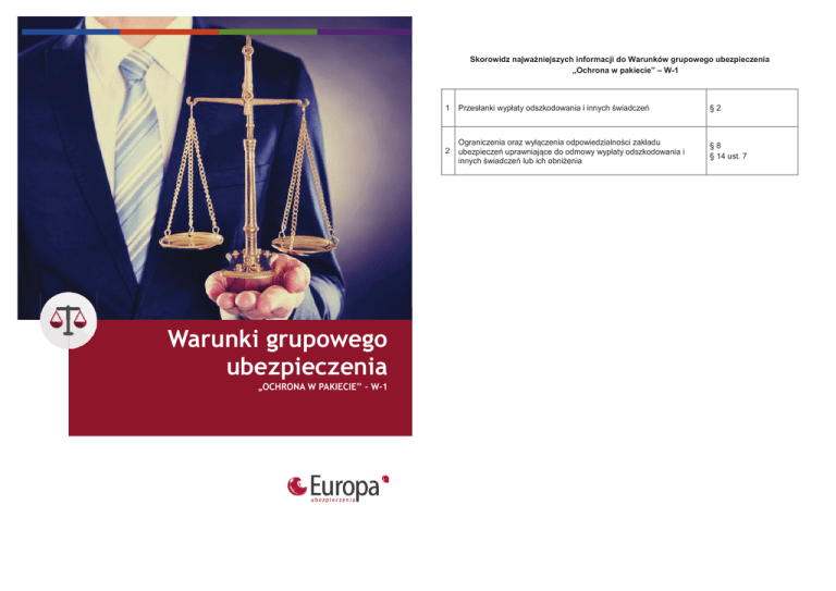 Skorowidz najważniejszych informacji do Warunków grupowego ubezpieczenia „Ochrona w pakiecie” – W-1 Warunki grupowego ubezpieczenia „OCHRONA W PAKIECIE” – W-1 1 Przesłanki wypłaty odszkodowania i innych świadczeń §2 2 Ograniczenia oraz wyłączenia odpowiedzialności zakładu ubezpieczeń uprawniające do odmowy wypłaty odszkodowania i innych świadczeń lub ich obniżenia §8 § 14 ust. 7 Załącznik nr 1 do Umowy grupowego ubezpieczenia Załacznik nr 1 do Aneksu nr 2 do Umowy grupowego ubezpieczenia Załącznik nr 1 do Umowy grupowego ubezpieczenia Załacznik nr 1 do Aneksu nr 2 do Umowy grupowego ubezpieczenia Okres odpowiedzialności Warunki grupowego ubezpieczenia „Ochrona w pakiecie” – W-1 (zwane dalej: W-1) Definicje §1 1. Agent – Getin Noble Bank S.A. z siedzibą w Warszawie wykonujący w imieniu i na rzecz Ubezpieczyciela czynności pośrednictwa ubezpieczeniowego; 2. Centrum Informacji Prawnej – podmiot działający na zlecenie Ubezpieczyciela, zawodowo zajmujący się świadczeniem usług pomocy prawnej i likwidacji szkód ochrony prawnej zgodnie z przepisami obowiązującego prawa; 3. Deklaracja Zgody – oświadczenie woli Klienta, mocą którego wyraża on zgodę na objęcie ochroną ubezpieczeniową na podstawie W-1; 4. Klient – podmiot/y, który/-e zawarł/y Umowę Kredytu z Getin Noble Bankiem S.A; 5. Konsultacja prawna – udzielenie informacji o powszechnie obowiązujących przepisach prawa polskiego, orzecznictwie i poglądach doktryny w zakresie problemu prawnego, z którym zgłosił się Ubezpieczony; 6. Kwota Kredytu – kwota wynikająca z Umowy Kredytu, wyrażona w polskich złotych; 7. Państwa Basenu Morza Śródziemnego – są to: Albania, Algieria, Bośnia i Hercegowina, Czarnogóra, Egipt, Izrael, Liban, Libia, Maroko, Monako, Syria, Tunezja, Turcja; 8. Pojazd – pojazd silnikowy w rozumieniu przepisów prawa o ruchu drogowym, zarejestrowany w Rzeczypospolitej Polskiej, będący przedmiotem kredytowania w Umowie Kredytu; 9. Ubezpieczający – Expert Ubezpieczenia Sp. z o.o. z siedzibą we Wrocławiu; 10. Ubezpieczony – Klient objęty ochroną ubezpieczeniową; 11. Ubezpieczyciel – Towarzystwo Ubezpieczeń Europa S.A. z siedzibą we Wrocławiu; 12. Umowa – Umowa grupowego ubezpieczenia dla Klientów Getin Noble Bank S.A. „Ochrona w pakiecie” zawarta pomiędzy TU Europa S.A. a Expert Ubezpieczenia Sp. z o.o.; 13. Umowa Kredytu – umowa o kredyt na zakup Pojazdu zawarta pomiędzy Getin Noble Bank S.A. a Klientem; Przedmiot i zakres ubezpieczenia §2 1. Przedmiotem ubezpieczenia jest świadczenie usługi asysty prawnej oraz refundacja wskazanych w W-1 kosztów pomocy prawnej na rzecz ochrony interesów prawnych Ubezpieczonego (ochrona prawna) związanych z posiadaniem oraz eksploatacją lub poruszaniem się Pojazdem. 2. Ochroną ubezpieczeniową objęte są wyłącznie zdarzenia zaistniałe na terenie państw Europy z zastrzeżeniem § 8 pkt 9) (kraje wyłączone z odpowiedzialności Ubezpieczyciela) lub Państw Basenu Morza Śródziemnego, o ile postępowania sądowe, administracyjne i inne wskazane w W-1 toczą się również na terytorium ww. państw. 3. Asysta prawna przysługuje w sprawach, podlegających prawu polskiemu lub jeżeli zdarzenie wystąpiło na terytorium Unii Europejskiej. Warunki objęcia ochroną ubezpieczeniową §3 Ochroną ubezpieczeniową może być objęty Klient, zamieszkujący lub posiadający siedzibę w Polsce, który dodatkowo zawarł Umowę Kredytu na kwotę nie wyższą niż 80.000 zł. Towarzystwo Ubezpieczeń Europa S.A. ul. Gwiaździsta 62 53-413 Wrocław [email protected] www.tueuropa.pl tel. 71 36 92 887, fax 71 36 92 707 Biuro Obsługi Klienta 801 500 300 (dla telefonów stacjonarnych) lub 71 36 92 887 (dla telefonów kom.) koszt połączenia zgodny z taryfą operatora TU Europa S.A. Sąd Rejonowy dla Wrocławia-Fabrycznej we Wrocławiu, KRS 0000002736 NIP 895-10-07-276,kapitał zakładowy zarejestrowany i opłacony 37 800 000 zł posiadającym zezwolenie Ministra Finansów z dnia 7 listopada 1994 r. na prowadzenie działalności ubezpieczeniowej §4 1. Okres odpowiedzialności rozpoczyna się po dniu złożenia podpisanej Deklaracji Zgody, jednak nie wcześniej niż od dnia uruchomienia kredytu i trwa przez okres od 12 do 21 miesięcy lub 23 miesiące zgodnie z Deklaracją Zgody. 2. Okres odpowiedzialności kończy się z dniem wystąpienia najwcześniejszego z poniższych zdarzeń: 1) z jego upływem, 2) z chwilą wyczerpania limitu świadczeń/sumy ubezpieczenia, 3) z dniem odstąpienia od Umowy Kredytu, 4) z upływem dnia, w którym Ubezpieczony złożył Ubezpieczającemu lub Ubezpieczycielowi oświadczenie o wystąpieniu z ubezpieczenia, o którym mowa w ust. 4. 3. W przypadku spłaty kredytu przed terminem ochrona ubezpieczeniowa trwa do końca okresu, za jaki została opłacona składka, chyba że Ubezpieczony wystąpi z ubezpieczenia. 4. Ubezpieczony może złożyć oświadczenie o wystąpieniu z ubezpieczenia: 1) w przypadku wystąpienia w ciągu 30 dni od dnia objęcia ochroną ubezpieczeniową, Ubezpieczającemu przysługuje zwrot wpłaconej składki. 2) w przypadku wystąpienia po 30. dniu od dnia objęcia ochroną ubezpieczeniową, za niewykorzystany okres ochrony Ubezpieczyciel zwraca część opłaconej składki proporcjonalnie do okresu niewykorzystanej ochrony. 5. Oświadczenie o wystąpieniu, może zostać złożone w formie pisemnej i powinno zawierać dane osoby je składającej. Za dzień złożenia oświadczenia woli o wystąpieniu rozumie się odpowiednio dzień otrzymania przez Ubezpieczyciela lub Ubezpieczającego pisemnego oświadczenia woli o wystąpieniu. 6. W przypadku, gdy w ramach jednej Umowy Kredytu ochroną ubezpieczeniową objęty jest więcej niż jeden Ubezpieczony, oświadczenie woli o wystąpieniu z ubezpieczenia składane jest przez wszystkich Ubezpieczonych. Ubezpieczenie ochrony prawnej §5 1. Ubezpieczenie ochrony prawnej, obejmuje po