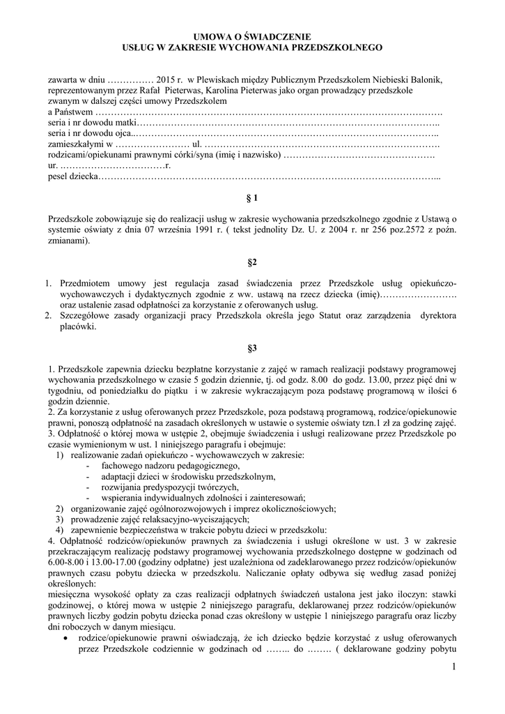 UMOWA O ŚWIADCZENIE USŁUG W ZAKRESIE WYCHOWANIA PRZEDSZKOLNEGO zawarta w dniu …………… 2015 r. w Plewiskach między Publicznym Przedszkolem Niebieski Balonik, reprezentowanym przez Rafał Pieterwas, Karolina Pieterwas jako organ prowadzący przedszkole zwanym w dalszej części umowy Przedszkolem a Państwem …………………………………………………………………………………………………. seria i nr dowodu matki…………………………………………………………………………………….. seria i nr dowodu ojca..…………………………………………………………………………………….. zamieszkałymi w …………………… ul. …………………………………………………………………. rodzicami/opiekunami prawnymi córki/syna (imię i nazwisko) …………………………………………. ur. .……………………………r. pesel dziecka………………………………………………………………………………………………... §1 Przedszkole zobowiązuje się do realizacji usług w zakresie wychowania przedszkolnego zgodnie z Ustawą o systemie oświaty z dnia 07 września 1991 r. ( tekst jednolity Dz. U. z 2004 r. nr 256 poz.2572 z poźn. zmianami). §2 1. Przedmiotem umowy jest regulacja zasad świadczenia przez Przedszkole usług opiekuńczowychowawczych i dydaktycznych zgodnie z ww. ustawą na rzecz dziecka (imię)……………………. oraz ustalenie zasad odpłatności za korzystanie z oferowanych usług. 2. Szczegółowe zasady organizacji pracy Przedszkola określa jego Statut oraz zarządzenia dyrektora placówki. §3 1. Przedszkole zapewnia dziecku bezpłatne korzystanie z zajęć w ramach realizacji podstawy programowej wychowania przedszkolnego w czasie 5 godzin dziennie, tj. od godz. 8.00 do godz. 13.00, przez pięć dni w tygodniu, od poniedziałku do piątku i w zakresie wykraczającym poza podstawę programową w ilości 6 godzin dziennie. 2. Za korzystanie z usług oferowanych przez Przedszkole, poza podstawą programową, rodzice/opiekunowie prawni, ponoszą odpłatność na zasadach określonych w ustawie o systemie oświaty tzn.1 zł za godzinę zajęć. 3. Odpłatność o której mowa w ustępie 2, obejmuje świadczenia i usługi realizowane przez Przedszkole po czasie wymienionym w ust. 1 niniejszego paragrafu i obejmuje: 1) realizowanie zadań opiekuńczo - wychowawczych w zakresie: - fachowego nadzoru pedagogicznego, - adaptacji dzieci w środowisku przedszkolnym, - rozwijania predyspozycji twórczych, - wspierania indywidualnych zdolności i zainteresowań; 2) organizowanie zajęć ogólnorozwojowych i imprez okolicznościowych; 3) prowadzenie zajęć relaksacyjno-wyciszających; 4) zapewnienie bezpieczeństwa w trakcie pobytu dzieci w przedszkolu: 4. Odpłatność rodziców/opiekunów prawnych za świadczenia i usługi określone w ust. 3 w zakresie przekraczającym realizację podstawy programowej wychowania przedszkolnego dostępne w godzinach od 6.00-8.00 i 13.00-17.00 (godziny odpłatne) jest uzależniona od zadeklarowanego przez rodziców/opiekunów prawnych czasu pobytu dziecka w przedszkolu. Naliczanie opłaty odbywa się według zasad poniżej określonych: miesięczna wysokość opłaty za czas realizacji odpłatnych świadczeń ustalona jest jako iloczyn: stawki godzinowej, o której mowa w ustępie 2 niniejszego paragrafu, deklarowanej przez rodziców/opiekunów prawnych liczby godzin pobytu dziecka ponad czas określony w ustępie 1 niniejszego paragrafu oraz liczby dni roboczych w danym miesiącu. rodzice/opiekunowie prawni oświadczają, że ich dziecko będzie korzystać z usług oferowanych przez Przedszkole codziennie w godzinach od …….. do .……. ( deklarowane godziny pobytu 1 dziecka), w tym z odpłatnych usług i świadczeń oferowanych przez Przedszkole codziennie w godz. od .……. do .……. i od…….. do …….., czyli w wymiarze .……. … godzin dziennie. Zadeklarowany czas pobytu dziecka w przedszkolu nie podlega zmianie, w ciągu roku. rodzice/opiekunowie prawni zobowiązani są uiszczać opłatę miesięczną z tytułu możliwości korzystania przez dziecko ze świadczeń oferowanych przez Przedszkole, w zakresie przekraczającym realizację podstawy programowej- tj.za ……… godzin dziennie w wysokości 1 zł za każdą rozpoczętą godzinę, za każdy dzień pobytu dziecka. za każdą rozpoczętą godzinę pobytu dziecka w przedszkolu, powyżej zadeklarowanych, rodzice/opiekunowie prawni zobowiązani są wnieść dodatkową opłatę w wysokości 1 zł. 5. Opłata miesięczna, o której mowa w ust. 4 ulega na wniosek rodziców/opiekunów prawnych dziecka, obniżeniu o 25% w przypadku, gdy: a) z usług Przedszkola korzysta dziecko z rodziny, w której dochód na jedną osobę w rodzinie nie przekracza dochodu obowiązującego przy ustalaniu prawa do zasiłku rodzinnego. Podstawą obniżenia jest przedłożenie zaświadczenia o otrzymywaniu zasiłku rodzinnego.; b) z usług Przedszkola korzysta dwoje lub więcej dzieci z tej samej rodziny, bez względu na wysokość dochodów uzyskiwanych w rodzinie, z tym zastrzeżeniem, iż upust o którym mowa w niniejszym pkt, dotyczyć będzie drugiego lub kolejnego dziecka z tej samej rodziny. 6. W przypadku zawarcia umowy w trakcie miesiąca, odpłatność - opłata miesięczna o której mowa w ustępie 4 naliczana będzie proporcjonalnie od dnia zawarcia umowy do końca danego miesiąca. 7. Odpłatność za usługi gastronomiczne - catering wynosi 10,50 zł dziennie i obejmuje: śniadanie, II śniadanie i obiad. W przypadku, gdy dziecko korzysta z zajęć realizowanych jedynie w zakresie podstawy programowej odpłatność za wyżywienie obejmuje: śniadanie i II śniadanie i wynosi 5,00 zł dziennie. 8. W przypadku absencji dziecka w Przedszkolu, opłata za świadczenia przedszkolne, o których mowa w ustępie.4 oraz stawka żywieniowa podl
