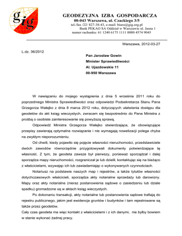 GEODEZYJNA IZBA GOSPODARCZA 00-043 Warszawa, ul. Czackiego 3/5 tel./fax /22/ 827-38-43, e-mail: [email protected] Bank PEKAO SA Oddział w Warszawie ul. Jasna 1 numer rachunku: 61 1240 6175 1111 0000 4574 9045 Warszawa, 2012-03-27 L.dz. 36/2012 Pan Jarosław Gowin Minister Sprawiedliwości Al. Ujazdowskie 11 00-950 Warszawa W nawiązaniu do mojego wystąpienia z dnia 5 września 2011 roku do poprzedniego Ministra Sprawiedliwości oraz odpowiedzi Podsekretarza Stanu Pana Grzegorza Wałejko z dnia 8 marca 2012 roku, dotyczących ułatwienia dostępu dla geodetów do akt ksiąg wieczystych, zwracam się bezpośrednio do Pana Ministra z prośbą o osobiste zainteresowanie się powyższą sprawą. Odpowiedź Ministra Grzegorza Wałejko stwierdzająca, że obowiązujące przepisy zawierają optymalne rozwiązanie i nie wymagają nowelizacji polega chyba na zwykłym nieporozumieniu. Od chwili, kiedy pojawiło się pojęcie własności nieruchomości, przedstawiciele dwóch zawodów równorzędnie przygotowywali dokumenty potwierdzające tę własność. Z tym, że geodeta zawsze był pierwszy, ponieważ sporządzał i dalej sporządza mapy nieruchomości, rozgraniczał je lub dzielił, kontaktując się na bieżąco z właścicielami, wzywając ich lub zawiadamiając o wykonywanych czynnościach. Notariusz na podstawie naszych map i rejestrów, a także tytułów własności dotychczasowych właścicieli, sporządza akty notarialne sprzedaży lub darowizny. Mapy oraz akty notarialne (nieraz postanowienia sądowe o zasiedzeniu lub dziale spadku) gromadzone są w aktach ksiąg wieczystych. Po dokonaniu transakcji, akty notarialne lub postanowienia sądowe trafiają do rejestru publicznego, jakim jest ewidencja gruntów i budynków i tam rejestrowane są także przez geodetów. Cały czas geodeta ma więc kontakt z właścicielami i z ich danymi, nie byłby bowiem w stanie wykonać żadnej pracy. Przez wiele lat geodeci podobnie jak notariusze czy sędziowie mieli prawo do przeglądania akt ksiąg wieczystych, czy zbiorów dokumentów bezpośrednio w archiwach, bez żadnych ograniczeń. Zupełnie niezrozumiałe są obecne ograniczenia, przy których geodeta , tak jak każdy interesant z ulicy, musi udowodnić swój interes prawny, żeby sprawdzić stare mapy, zbadać przebieg granic nieruchomości oraz wszystkie inne dokumenty, pozwalające na prawidłowe wykonanie nowych map. Jest to w interesie właścicieli nieruchomości, ale także w interesie sądu wieczysto-księgowego, bo błędy w oznaczeniu nieruchomości są ogromnym problemem dla sądów i kłopotem dla właścicieli. Oprócz tego każdy sąd ustala własne zasady i kryteria, którym muszą podporządkować się geodeci aby uzyskać zgodę Prezesa Sądu na zbadanie akt ksiąg wieczystych. Na uzyskanie w/w zgody czeka się najczęściej kilka lub kilkanaście dni. Jeśli geodeta uprawniony ma już taką zgodę, okazuje się, że np. w Warszawie może otrzymać w ciągu jednego dnia zaledwie akta 5 ksiąg, a przejrzeć w ciągu 8 godzin mógłby 25-30 ksiąg. Proszę sobie wyobrazić inwestycję drogową, gdzie do zbadania mamy 1000 ksiąg. Łatwo policzyć, ile czasu potrzeba na te czynności i odpowiedzieć na pytanie, dlaczego występują opóźnienia przy realizacji inwestycji. Dodatkowo Pan Minister Grzegorz Wałejko uzasadniając swoją odmowę stwierdza, że nie możemy uzyskać takich samych praw jak notariusze, ponieważ nie jesteśmy zawodem zaufania publicznego, gdyż „obowiązujące przepisy takiego statusu geodetom wprost nie przyznają”. Pan Minister ma rację, że wprost nie, ale z wielu przepisów pośrednio wynika, że jesteśmy zawodem zaufania publicznego, gdyż: - mamy prawo, przy rozgraniczaniu nieruchomości, sporządzać pomiędzy sąsiadami ugody co do przebiegu granic, mające moc ugód sądowych, - bez żadnych ograniczeń, tylko na podstawie zgłoszenia pracy, mamy dostęp do wszystkich danych w ewidencji gruntów i budynków, a więc do nazwisk, adresów, dokumentów własności itp., - mamy prawo wzywać lub zawiadamiać strony o czynnościach geodezyjnych, a także uprawnieni jesteśmy do wstępu na nieruchomości w celu wykonania pomiarów, ustalenia granic, stabilizacji punktów granicznych itp., - na zlecenie inwestorów realizujemy cele publiczne, a w oparciu o nasze mapy i wykazy właścicieli nieruchomości wojewodowie lub starostowie wydają decyzje o odjęciu praw własności na rzecz Skarbu Państwa lub samorządu terytorialnego, np. dla dróg i kolei. - nikt nie kwestionuje naszych opracowań, zawierających szczegółowe dane o właścicielach ich adresach, tytułach własności, hipotekach lub służebnościach gruntowych jako naruszających ustawę o ochronie danych osobowych. - dziwi więc fakt, że takie wątpliwości ma Ministerstwo Sprawiedliwości. Natomiast wystąpienie do wszystkich prezesów sądów okręgowych o umożliwienie łatwiejszego i szybszego dostępu geodetów do akt ksiąg wieczystych nie jest zbyt skuteczne i nie rozwiązuje zasadniczego problemu. Reasumując, bardzo proszę Pana Ministra o powtórne rozważenie sprawy i uwzględnienie naszego wniosku o nowelizację ustawy, co pozwoli na bezpośredni dostęp geodetów do akt ksiąg wieczystych. Prezes Geodezyjnej Izby Gospodarczej Bogdan Grzechnik Do wiadomości: 1. Minister Administracji i Cyfryzacji 2. Główny Geodeta Kraju