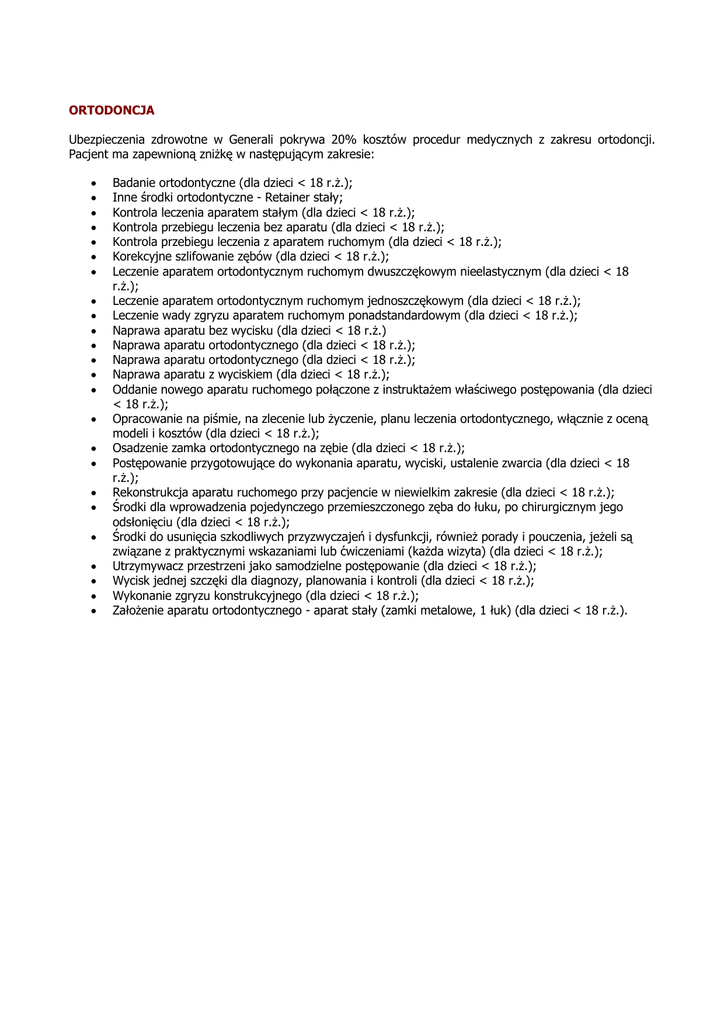 ORTODONCJA Ubezpieczenia zdrowotne w Generali pokrywa 20% kosztów procedur medycznych z zakresu ortodoncji. Pacjent ma zapewnioną zniżkę w następującym zakresie: · · · · · · · · · · · · · · · · · · · · · · · · Badanie ortodontyczne (dla dzieci < 18 r.ż.); Inne środki ortodontyczne - Retainer stały; Kontrola leczenia aparatem stałym (dla dzieci < 18 r.ż.); Kontrola przebiegu leczenia bez aparatu (dla dzieci < 18 r.ż.); Kontrola przebiegu leczenia z aparatem ruchomym (dla dzieci < 18 r.ż.); Korekcyjne szlifowanie zębów (dla dzieci < 18 r.ż.); Leczenie aparatem ortodontycznym ruchomym dwuszczękowym nieelastycznym (dla dzieci < 18 r.ż.); Leczenie aparatem ortodontycznym ruchomym jednoszczękowym (dla dzieci < 18 r.ż.); Leczenie wady zgryzu aparatem ruchomym ponadstandardowym (dla dzieci < 18 r.ż.); Naprawa aparatu bez wycisku (dla dzieci < 18 r.ż.) Naprawa aparatu ortodontycznego (dla dzieci < 18 r.ż.); Naprawa aparatu ortodontycznego (dla dzieci < 18 r.ż.); Naprawa aparatu z wyciskiem (dla dzieci < 18 r.ż.); Oddanie nowego aparatu ruchomego połączone z instruktażem właściwego postępowania (dla dzieci < 18 r.ż.); Opracowanie na piśmie, na zlecenie lub życzenie, planu leczenia ortodontycznego, włącznie z oceną modeli i kosztów (dla dzieci < 18 r.ż.); Osadzenie zamka ortodontycznego na zębie (dla dzieci < 18 r.ż.); Postępowanie przygotowujące do wykonania aparatu, wyciski, ustalenie zwarcia (dla dzieci < 18 r.ż.); Rekonstrukcja aparatu ruchomego przy pacjencie w niewielkim zakresie (dla dzieci < 18 r.ż.); Środki dla wprowadzenia pojedynczego przemieszczonego zęba do łuku, po chirurgicznym jego odsłonięciu (dla dzieci < 18 r.ż.); Środki do usunięcia szkodliwych przyzwyczajeń i dysfunkcji, również porady i pouczenia, jeżeli są związane z praktycznymi wskazaniami lub ćwiczeniami (każda wizyta) (dla dzieci < 18 r.ż.); Utrzymywacz przestrzeni jako samodzielne postępowanie (dla dzieci < 18 r.ż.); Wycisk jednej szczęki dla diagnozy, planowania i kontroli (dla dzieci < 18 r.ż.); Wykonanie zgryzu konstrukcyjnego (dla dzieci < 18 r.ż.); Założenie aparatu ortodontycznego - aparat stały (zamki metalowe, 1 łuk) (dla dzieci < 18 r.ż.).