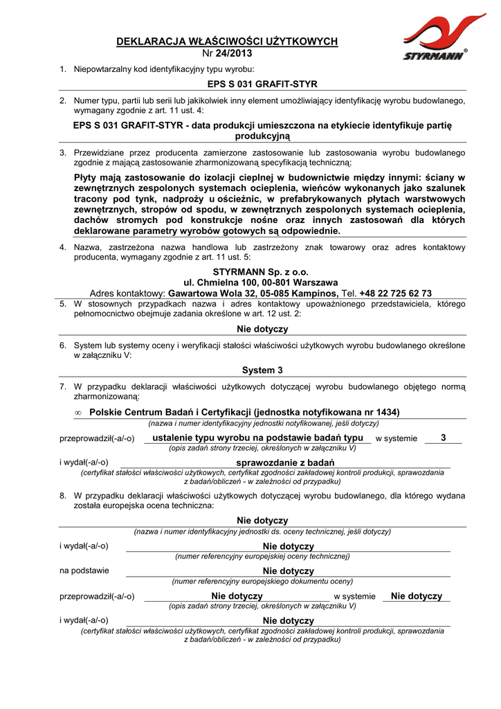 DEKLARACJA WŁAŚCIWOŚCI UŻYTKOWYCH Nr 24/2013 1. Niepowtarzalny kod identyfikacyjny typu wyrobu: EPS S 031 GRAFIT-STYR 2. Numer typu, partii lub serii lub jakikolwiek inny element umożliwiający identyfikację wyrobu budowlanego, wymagany zgodnie z art. 11 ust. 4: EPS S 031 GRAFIT-STYR - data produkcji umieszczona na etykiecie identyfikuje partię produkcyjną 3. Przewidziane przez producenta zamierzone zastosowanie lub zastosowania wyrobu budowlanego zgodnie z mającą zastosowanie zharmonizowaną specyfikacją techniczną: Płyty mają zastosowanie do izolacji cieplnej w budownictwie między innymi: ściany w zewnętrznych zespolonych systemach ocieplenia, wieńców wykonanych jako szalunek tracony pod tynk, nadproży u ościeżnic, w prefabrykowanych płytach warstwowych zewnętrznych, stropów od spodu, w zewnętrznych zespolonych systemach ocieplenia, dachów stromych pod konstrukcje nośne oraz innych zastosowań dla których deklarowane parametry wyrobów gotowych są odpowiednie. 4. Nazwa, zastrzeżona nazwa handlowa lub zastrzeżony znak towarowy oraz adres kontaktowy producenta, wymagany zgodnie z art. 11 ust. 5: STYRMANN Sp. z o.o. ul. Chmielna 100, 00-801 Warszawa Adres kontaktowy: Gawartowa Wola 32, 05-085 Kampinos, Tel. +48 22 725 62 73 5. W stosownych przypadkach nazwa i adres kontaktowy upoważnionego przedstawiciela, którego pełnomocnictwo obejmuje zadania określone w art. 12 ust. 2: Nie dotyczy 6. System lub systemy oceny i weryfikacji stałości właściwości użytkowych wyrobu budowlanego określone w załączniku V: System 3 7. W przypadku deklaracji właściwości użytkowych dotyczącej wyrobu budowlanego objętego normą zharmonizowaną: • Polskie Centrum Badań i Certyfikacji (jednostka notyfikowana nr 1434) (nazwa i numer identyfikacyjny jednostki notyfikowanej, jeśli dotyczy) przeprowadził(-a/-o) ustalenie typu wyrobu na podstawie badań typu w systemie 3 (opis zadań strony trzeciej, określonych w załączniku V) i wydał(-a/-o) sprawozdanie z badań (certyfikat stałości właściwości użytkowych, certyfikat zgodności zakładowej kontroli produkcji, sprawozdania z badań/obliczeń - w zależności od przypadku) 8. W przypadku deklaracji właściwości użytkowych dotyczącej wyrobu budowlanego, dla którego wydana została europejska ocena techniczna: Nie dotyczy (nazwa i numer identyfikacyjny jednostki ds. oceny technicznej, jeśli dotyczy) i wydał(-a/-o) Nie dotyczy (numer referencyjny europejskiej oceny technicznej) na podstawie Nie dotyczy (numer referencyjny europejskiego dokumentu oceny) przeprowadził(-a/-o) Nie dotyczy w systemie Nie dotyczy (opis zadań strony trzeciej, określonych w załączniku V) i wydał(-a/-o) Nie dotyczy (certyfikat stałości właściwości użytkowych, certyfikat zgodności zakładowej kontroli produkcji, sprawozdania z badań/obliczeń - w zależności od przypadku) 9. Deklarowane właściwości użytkowe Uwagi do tabeli: 1. Kolumna 1 zawiera wykaz zasadniczych charakterystyk określonych w zharmonizowanych specyfikacjach technicznych dla zamierzonego zastosowania lub zamierzonych zastosowań wskazanych w pkt 3 powyżej. 2. Dla każdej zasadniczej charakterystyki wymienionej w kolumnie 1 i zgodnie z wymaganiami art. 6 kolumna 2 zawiera deklarowane właściwości użytkowe wyrażone jako poziom lub klasa, lub w sposób opisowy, powiązane z odpowiednimi zasadniczymi charakterystykami. Zawiera litery „NPD” (właściwości użytkowe nieustalone; ang. No Performance Determined), o ile właściwości użytkowe nie zostały zadeklarowane. 3. Dla każdej zasadniczej charakterystyki wymienionej w kolumnie 1 kolumna 3 zawiera: a) datowane odniesienie do odpowiedniej normy zharmonizowanej oraz w stosownych wypadkach numer referencyjny zastosowanej specjalnej lub odpowiedniej dokumentacji technicznej; lub b) datowane odniesienie do odpowiedniego europejskiego dokumentu oceny, w przypadku gdy jest on dostępny, oraz numer referencyjny zastosowanej europejskiej oceny technicznej. Zasadnicze charakterystyki (zob. uwaga 1) Długość Szerokość Grubość Prostokątność Płaskość Reakcja na ogień Ciągłe spalanie w postaci żarzenia Długotrwała nasiąkliwość wodą Absorpcja wody przy długotrwałej dyfuzji Uwalnianie się substancji niebezpiecznych do środowiska wewnętrznego Wskaźnik izolacyjności od dźwięków powietrznych przenoszonych drogą bezpośrednią Wskaźnik pochłaniania dźwięku Wskaźnik izolacyjności od dźwięków uderzeniowych (dla podłóg) Opór cieplny Współczynnik przewodzenia ciepła Przepuszczalność pary wodnej Naprężenie ściskające przy 10 % odkształceniu Wytrzymałość na zginanie Wytrzymałość na rozciąganie prostopadle do powierzchni czołowych Trwałość reakcji na ogień w funkcji ciepła, warunków atmosferycznych, starzenia/degradacji Trwałość oporu cieplnego w funkcji ciepła, warunków atmosferycznych, starzenia/degradacji Stabilność wymiarowa w określonych warunkach temperaturowych Stabilność wymiarowa w określonych warunkach temperaturowych i wilgotnościowych Trwałość właściwości Odkształcenie w określonych warunkach obciążenia ściskającego i temperatury Trwałość wytrzymałości na ściskanie w funkcji Właściwości użytkowe (zob. uwaga 2) L(2) W(2) T(1) S(2) P(5) E NPD NPD NPD NPD NPD NPD NPD RD - tabela poniżej Nie więcej niż 0,031 W/m⋅K NPD NPD BS115 TR100 Brak zmian Brak zmian DS(N)2 DS(70,-)1 Brak zmian NPD NPD Zharmonizowana specyfikacja techniczna (zob. uwaga 3) EN 13163:2012 Właściwości użytkowe (zob. uwaga 2) Zasadnicze charakterystyki (zob. uwaga 1) starzenia i degradacji Odporność na zamrażanie-odmrażanie Długotrwała redukcja grubości Zharmonizowana specyfikacja techniczna (zob. uwaga 3) NPD NPD Deklarowany opór cieplny RD: Grubość [mm] 10 Deklar. opór cieplny RD [m2K/W] 20 30 40 50 60 70 80 100 120 140 150 160 180 200 0,323 0,645 0,968 1,290 1,613 1,935 2,258 2,580 3,226 3,871 4,516 4,839 5,161 