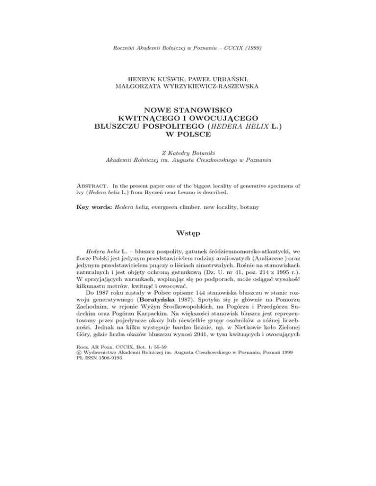 Roczniki Akademii Rolniczej w Poznaniu – CCCIX (1999) HENRYK KUŚWIK, PAWEŁ URBAŃSKI, MAŁGORZATA WYRZYKIEWICZ-RASZEWSKA NOWE STANOWISKO KWITNĄCEGO I OWOCUJĄCEGO BLUSZCZU POSPOLITEGO (HEDERA HELIX L.) W POLSCE Z Katedry Botaniki Akademii Rolniczej im. Augusta Cieszkowskiego w Poznaniu Abstract. In the present paper one of the biggest locality of generative specimens of ivy (Hedera helix L.) from Ryczeń near Leszno is described. Key words: Hedera helix, evergreen climber, new locality, botany Wstęp Hedera helix L. – bluszcz pospolity, gatunek śródziemnomorsko-atlantycki, we florze Polski jest jedynym przedstawicielem rodziny araliowatych (Araliaceae ) oraz jedynym przedstawicielem pnączy o liściach zimotrwałych. Rośnie na stanowiskach naturalnych i jest objęty ochroną gatunkową (Dz. U. nr 41, poz. 214 z 1995 r.). W sprzyjających warunkach, wspinając się po podporach, może osiągać wysokość kilkunastu metrów, kwitnąć i owocować. Do 1987 roku zostały w Polsce opisane 144 stanowiska bluszczu w stanie rozwoju generatywnego (Boratyńska 1987). Spotyka się je głównie na Pomorzu Zachodnim, w rejonie Wyżyn Środkowopolskich, na Pogórzu i Przedgórzu Sudeckim oraz Pogórzu Karpackim. Na większości stanowisk bluszcz jest reprezentowany przez pojedyncze okazy lub niewielkie grupy osobników o różnej liczebności. Jednak na kilku występuje bardzo licznie, np. w Nietkowie koło Zielonej Góry, gdzie liczba okazów bluszczu wynosi 2941, w tym kwitnących i owocujących Rocz. AR Pozn. CCCIX, Bot. 1: 55-59 c Wydawnictwo Akademii Rolniczej im. Augusta Cieszkowskiego w Poznaniu, Poznań 1999 PL ISSN 1508-9193 56 H. Kuświk, P. Urbański, M. Wyrzykiewicz-Raszewska 1156 (Czekalski 1992), czy w okolicach Lubienia w Wolińskim Parku Narodowym – ponad 100 okazów (Piotrowska i Olaczek 1979) oraz Rajska koło Krakowa, również około 100 okazów (Kmieć i Strzałka 1981). Do wymienionych wyżej stanowisk należy dopisać nowe, nie notowane dotąd w dostępnej literaturze, znajdujące się w Ryczeniu, koło Góry, w województwie leszczyńskim. Materiał i metody Badania terenowe wykonano w 1995 roku na stanowisku znajdującym się 29 km na południe od Leszna i około 8 km na południe od Góry, na prawym brzegu rzeki Baryczy, koło wsi Ryczeń (ryc. 1). Ryc. 1. Mapa położenia wsi Ryczeń oraz szkic sytuacyjny stanowiska bluszczu w Ryczeniu Fig. 1. Map of the situation of Ryczeń village and sketch of the ivy locality in Ryczeń Nowe stanowisko kwitnącego i owocującego bluszczu... 57 Bluszcz występuje tu w dwóch nieco oddalonych od siebie miejscach. Jedno z nich znajduje się na zachód od wioski w drzewostanie dębowo-sosnowym, w oddziale 308, w którym przeprowadzono dokładną inwentaryzację bluszczu. Teren ten należy do Nadleśnictwa Góra Śląska, Obrębu Jemielno i Leśnictwa Ryczeń (ryc. 1). Drugie miejsce jest położone po południowej stronie wioski koło mostu, w rozwidleniu między korytem rzeki Baryczy a jej starorzeczem (na rycinie oznaczono symbolem x). Jest to prawdopodobnie teren prywatny lub gminny i dlatego poczyniono tutaj jedynie pobieżne obserwacje. Pod względem geobotanicznym omawiany teren należy do Działu Bałtyckiego, Poddziału Pasa Wielkich Dolin, Krainy Wielkopolsko-Kujawskiej, Okręgu Baryckiego (Kondracki 1980). Określono szczegółowo lokalizację stanowiska i jego granice. Podczas inwentaryzowania bluszczu określano: gatunek drzewa podporowego, liczbę okazów bluszczu wspinających się po jednej podporze, przybliżoną wysokość wspinania się bluszczu, liczbę okazów w stanie rozwoju generatywnego i zdrowotność. Mierzono obwód drzew podporowych i średnicę pędów bluszczu na wysokości pierśnicy. Sporządzono również dokumentację fotograficzną. Wyniki W wyniku przeprowadzonej inwentaryzacji stwierdzono obecność ogółem 240 okazów bluszczu wspinających się po drzewach podporowych, z czego 68 było w stanie rozwoju generatywnego (pododdział 308 j oraz 308 i). Najczęściej bluszcz wspinał się po dębie szypułkowym (Quercus robur L.). Na 57 drzewach tego gatunku stwierdzono 204 okazy bluszczu, co oznacza że na jednym pniu drzewa wspinało się często więcej bluszczy. Liczba ta wynosiła od 1 do 9 okazów na jednym pniu. Innymi drzewami podporowymi były: sosna zwyczajna (Pinus sylvestris L.) – na 11 drzewach obserwowano 29 okazów bluszczu, czeremcha zwyczajna (Prunus padus L.) – na 2 drzewach 3 okazy, a także lipa drobnolistna (Tilia cordata Miller), buk zwyczajny (Fagus sylvatica L.), świerk pospolity (Picea abies (L.) Kersten) i wiąz szypułkowy (Ulmus laevis Pallas). Na czterech ostatnich gatunkach drzew stwierdzono po jednym okazie wspinającego się bluszczu. Średnica pędów bluszczu na wysokości pierśnicy wynosiła od 0,5 cm do 12 cm. Okazów bluszczu, które dopiero zaczynały się wspinać i nie osiągnęły wysokości 1,3 m, nie mierzono. Niektóre bluszcze osiągały wysokość drzewa podporowego, czyli 18-20 m, co szczególnie można było zaobserwować wiosną, kiedy drzewa nie rozwinęły jeszcze własnych liści. Pędy bluszczu wytwarzały bardzo licznie korzenie przybyszowe, pełniące funkcję czepną. 58 H. Kuświk, P. Urbański, M. Wyrzykiewicz-Raszewska W pododdziałach 308 i oraz 308 j bluszcz występował także obficie w runie, miejscami osiągając 100% pokrycia. Nie obserwowano uszkodzeń bluszczu powodowanych przez mrozy, choroby lub szkodniki. Jednakże stwierdzono jego niezwykle silną i bezwzględną dewastację, polegającą na całkowitym odcinaniu dolnych części pędów, w wyniku której większość najbardziej okazałych bluszczy obumarła. Zniszczonych zostało w ten sposób ponad 60 owocujących pędów bluszczy na terenie położonym przy moście, między rzeką a starorzeczem, po południowej stronie Ryczenia. Podobne próby niszczenia bluszczy, na pojedynczych okazach, zauważono także w oddziale 308. Podsumowanie Wcześniejsze obserwacje blusz