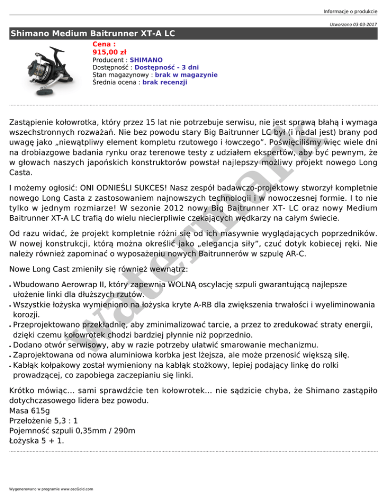 Informacje o produkcie Utworzono 03-03-2017 Shimano Medium Baitrunner XT-A LC Cena : 915,00 zł Producent : SHIMANO Dostępność : Dostępność - 3 dni Stan magazynowy : brak w magazynie Średnia ocena : brak recenzji er m ar k Zastąpienie kołowrotka, który przez 15 lat nie potrzebuje serwisu, nie jest sprawą błahą i wymaga wszechstronnych rozważań. Nie bez powodu stary Big Baitrunner LC był (i nadal jest) brany pod uwagę jako „niewątpliwy element kompletu rzutowego i łowczego”. Poświęciliśmy więc wiele dni na drobiazgowe badania rynku oraz terenowe testy z udziałem ekspertów, aby być pewnym, że w głowach naszych japońskich konstruktorów powstał najlepszy możliwy projekt nowego Long Casta. I możemy ogłosić: ONI ODNIEŚLI SUKCES! Nasz zespół badawczo-projektowy stworzył kompletnie nowego Long Casta z zastosowaniem najnowszych technologii i w nowoczesnej formie. I to nie tylko w jednym rozmiarze! W sezonie 2012 nowy Big Baitrunner XT- LC oraz nowy Medium Baitrunner XT-A LC trafią do wielu niecierpliwie czekających wędkarzy na całym świecie. Od razu widać, że projekt kompletnie różni się od ich masywnie wyglądających poprzedników. W nowej konstrukcji, którą można określić jako „elegancja siły”, czuć dotyk kobiecej ręki. Nie należy również zapominać o wyposażeniu nowych Baitrunnerów w szpulę AR-C. Nowe Long Cast zmieniły się również wewnątrz: ● ● ● ● at ● Wbudowano Aerowrap II, który zapewnia WOLNĄ oscylację szpuli gwarantującą najlepsze ułożenie linki dla dłuższych rzutów. Wszystkie łożyska wymieniono na łożyska kryte A-RB dla zwiększenia trwałości i wyeliminowania korozji. Przeprojektowano przekładnię, aby zminimalizować tarcie, a przez to zredukować straty energii, dzięki czemu kołowrotek chodzi bardziej płynnie niż poprzednio. Dodano otwór serwisowy, aby w razie potrzeby ułatwić smarowanie mechanizmu. Zaprojektowana od nowa aluminiowa korbka jest lżejsza, ale może przenosić większą siłę. Kabłąk kołpakowy został wymieniony na kabłąk stożkowy, lepiej podający linkę do rolki prowadzącej, co zapobiega zaczepianiu się linki. w ● Krótko mówiąc... sami sprawdźcie ten kołowrotek... nie sądzicie chyba, że Shimano zastąpiło dotychczasowego lidera bez powodu. Masa 615g Przełożenie 5,3 : 1 Pojemność szpuli 0,35mm / 290m Łożyska 5 + 1. Wygenerowano w programie www.oscGold.com