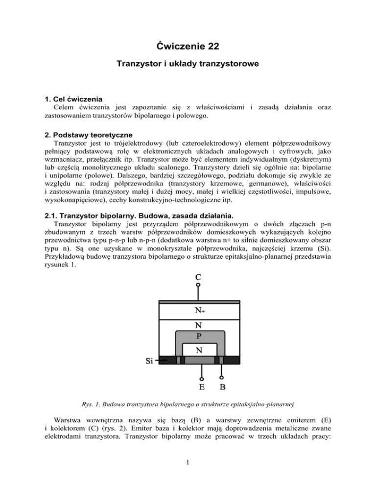Ćwiczenie 22 Tranzystor i układy tranzystorowe 1. Cel ćwiczenia Celem ćwiczenia jest zapoznanie się z właściwościami i zasadą działania oraz zastosowaniem tranzystorów bipolarnego i polowego. 2. Podstawy teoretyczne Tranzystor jest to trójelektrodowy (lub czteroelektrodowy) element półprzewodnikowy pełniący podstawową rolę w elektronicznych układach analogowych i cyfrowych, jako wzmacniacz, przełącznik itp. Tranzystor może być elementem indywidualnym (dyskretnym) lub częścią monolitycznego układu scalonego. Tranzystory dzieli się ogólnie na: bipolarne i unipolarne (polowe). Dalszego, bardziej szczegółowego, podziału dokonuje się zwykle ze względu na: rodzaj półprzewodnika (tranzystory krzemowe, germanowe), właściwości i zastosowania (tranzystory małej i dużej mocy, małej i wielkiej częstotliwości, impulsowe, wysokonapięciowe), cechy konstrukcyjno-technologiczne itp. 2.1. Tranzystor bipolarny. Budowa, zasada działania. Tranzystor bipolarny jest przyrządem półprzewodnikowym o dwóch złączach p-n zbudowanym z trzech warstw półprzewodników domieszkowych wykazujących kolejno przewodnictwa typu p-n-p lub n-p-n (dodatkowa warstwa n+ to silnie domieszkowany obszar typu n). Są one uzyskane w monokrysztale półprzewodnika, najczęściej krzemu (Si). Przykładową budowę tranzystora bipolarnego o strukturze epitaksjalno-planarnej przedstawia rysunek 1. Rys. 1. Budowa tranzystora bipolarnego o strukturze epitaksjalno-planarnej Warstwa wewnętrzna nazywa się bazą (B) a warstwy zewnętrzne emiterem (E) i kolektorem (C) (rys. 2). Emiter baza i kolektor mają doprowadzenia metaliczne zwane elektrodami tranzystora. Tranzystor bipolarny może pracować w trzech układach pracy: 1 o wspólnej bazie (OB), o wspólnym emiterze (OE) oraz o wspólnym kolektorze (OC). Strukturę, symbole graficzne tranzystora bipolarnego (NPN i PNP) i polaryzację elektrod w układzie OB przedstawiono na rysunku 2. Rys. 2. Struktura, polaryzacja elektrod (układ OB) i symbole graficzne tranzystora: a) typu p-n-p b) typu n-p-n Stan tranzystora zapewniający uzyskanie przez niego właściwości wzmacniających uzyskuje się przez odpowiednią polaryzację elektrod (rys. 2). W obydwu typach tranzystorów złącze emiterowe (emiter-baza) spolaryzowane jest w kierunku przewodzenia, zaś kolektorowe (kolektor-baza) w kierunku zaporowym. Zachodzące w tranzystorze zjawiska fizyczne wyjaśniono na przykładzie tranzystora p-n-p. (rys. 3). Rys. 3. Zasada działania tranzystora: a) tranzystor niespolaryzowany, b) tranzystor spolaryzowany w kierunku przewodzenia. 2 W stanie równowagi, bez polaryzacji zewnętrznej na obu złączach tranzystora występują jednakowe bariery potencjału (U1 i U2 na rys.3a) spowodowane rekombinacją dziur z obszarów emitera i kolektora z elektronami obszaru bazy. Zaznaczone na rys. 3a ładunki „+” i „-” oznaczają odpowiednio ładunki nieruchomych jonów donorowych i akceptorowych. Jeżeli złącze kolektorowe (J2) zostanie spolaryzowane w kierunku zaporowym przez włączenie źródła EC, zwiększy się bariera potencjału U2 między kolektorem a bazą (rys.3b). Jeżeli włączymy źródło EE , polaryzujące złącze emiterowe w kierunku przewodzenia (rys. 3b) to obniży się bariera potencjału U1 między emiterem a bazą. Dziury z obszaru emitera przepływają drogą dyfuzji do obszaru bazy, gdzie częściowo rekombinują z elektronami tworząc prąd bazy IB. Ponieważ szerokość bazy jest niewielka i np. w tranzystorach małej mocy zawiera się w granicach (0,3-1) m, liczba rekombinujących dziur w bazie stanowi (1-5)% dyfundujących z emitera dziur. Większość dziur osiąga więc złącze kolektorowe i jest unoszona do obszaru kolektora. Miarą „ubytku” dyfundujących nośników większościowych emitera (prądu emitera IE) jest tzw. współczynnik wzmocnienia prądowego wyznaczany w układzie OB, przy czym I C I E (1) gdzie: IC , IE - przyrosty prądu: kolektora i emitera. Wartość współczynnika jest nieco mniejsza od jedności i zawiera się w granicach (0,95-0,99). Działanie tranzystora n-p-n jest analogiczne do działania tranzystora p-n-p z tą różnicą, że napięcia polaryzujące mają przeciwne znaki, zaś prąd emitera składa się głównie z elektronów, a nie dziur. Najczęściej stosowanym układem pracy tranzystora bipolarnego jest układ o wspólnym emiterze (OE) przedstawiony na rysunku 4. Rys. 4. Układ pracy tranzystora o wspólnym emiterze (OE) W układzie o wspólnym emiterze (rys. 4) prądem wejściowym (sterującym) jest prąd bazy a wyjściowym prąd kolektora. Elektroda wspólna jest przyłączona do masy. Wzmocnienie prądowe oznaczane w katalogach układów elektronicznych jako h21E określa zależność: I C I B gdzie: B - przyrost prądu bazy. 3 (2) Na rys. 5 podano typowy przebieg charakterystyk statycznych tranzystora n-p-n w układzie (OE). Rys. 5. Statyczne charakterystyki tranzystora w układzie OE. a) wejściowa; b) wyjściowa Obszar aktywny bezpiecznej pracy tranzystora jest ograniczony krzywą maksymalnych strat mocy Pmax, której hiperboliczny przebieg wynika z maksymalnej wartości iloczynu napięcia między kolektorem a emiterem i określonych wartości prądów kolektora, dla których nie jest przekroczona maksymalna temperatura złącz tranzystora powodująca jego uszkodzenie. Charakterystyka dla prądu IB = 0 ogranicza obszar odcięcia (zatkania) tranzystora, w którym obydwa złącza tzn. baza emiter i kolektor - baza spolaryzowane są w kierunku zaporowym. W stanie nasycenia złącza baza emiter i kolektor - baza, spolaryzowane są w kierunku przewodzenia. 2.2. Tranzystor polowy z izolowaną bramką. Budowa, zasada działania. Tranzystor polowy z izolowaną bramką, w którym rolę izolatora pełni tlenek krzemu SiO2 (ang. oxide) nazywany jest MOSFET (Metal-Oxide-Semiconductor Field Effect Transistor) lub w skrócie MOS. Jest on zazwyczaj elementem trójkońcówkowym Może być 
