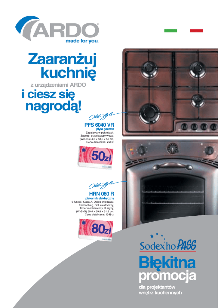 Zaaranżuj kuchnię z urządzeniami ARDO i ciesz się nagrodą! PFS 6040 VR płyta gazowa Zapalarka w pokrętłach, Zabezp. przeciwwypływowe, (WxSxG) 4,8 x 58,5 x 50 cm, Cena detaliczna: 750 zł 50zł HRN 060 R piekarnik elektryczny 6 funkcji, Klasa A, Obieg chłodzący, Termoobieg, Grill elektryczny, Timer mechaniczny, 3 szyby, (WxSxG) 59,4 x 59,8 x 51,9 cm, Cena detaliczna: 1349 zł 80zł Błękitna promocja dla projektantów wnętrz kuchennych 80zł Błękitna promocja dla projektantów wnętrz kuchennych PFT 7041 VXG 50zł PVT 6031 VBG płyta gazowa płyta gazowa na szkle Ruszt żeliwny, Potrójna Korona, Zapalarka w pokrętłach, Zabezp. przeciwwypływowe, (WxSxG) 5,9 x 72 x 51 cm, Cena detaliczna: 949 zł Ruszt żeliwny, Potrójna Korona, Zapalarka w pokrętłach, Zabezp. przeciwwypływowe, (WxSxG) 5,8 x 62 x 53 cm, Cena detaliczna: 949 zł 50zł HE 085 X HD 080 X piekarnik elektryczny 8 funkcji, Display, Klasa A, Obieg chłodzący, Termoobieg, Grill elektryczny, Programator elektroniczny, 3 szyby EasySlide, Prowadnice teleskopowe, Drabinki, Podwójne oświetlenie, Emalia Easy to Clean, (WxSxG) 59,7 x 59,5 x 56,2 cm, Cena detaliczna: 1499 zł 80zł 80zł 8 funkcji, Klasa A, Obieg chłodzący, Termoobieg, Grill elektryczny, Timer mechaniczny, 3 szyby EasySlide, Prowadnice teleskopowe, Drabinki, Podświetlane pokrętła PushPull, Podwójne oświetlenie, Emalia Easy to Clean, (WxSxG) 59,7 x 59,5 x 56,2 cm, Cena detaliczna: 1449 zł PE 58 AV E1 PFS 4030 VX płyta ceramiczna płyta gazowa 4 pola Hi-Light (w tym 1 poszerzone), Display, Sterowanie sensorowe, Booster, Funkcja Overflow, (WxSxG) 4,8 x 58 x 51 cm, Cena detaliczna: 1149 zł Zapalarka w pokrętłach, Zabezp. przeciwwypływowe, (WxSxG) 4 x 45 x 50 cm, Cena detaliczna: 600 zł 20zł 50zł 50zł piekarnik elektryczny HB 040 X HSN 040 S piekarnik elektryczny piekarnik elektryczny 4 funkcje, Klasa A, Obieg chłodzący, Termoobieg, Grill elektryczny, Timer akustyczny, 2 szyby, Emalia Easy to Clean (WxSxG) 59,7 x 59,5 x 56,2 cm, Cena detaliczna: 889 zł 6 funkcji, Klasa A, Obieg chłodzący, Termoobieg, Grill elektryczny, Timer akustyczny, 2 szyby, Emalia Easy to Clean, (WxSxG) 59,6 x 45 x 56,8 cm, Cena detaliczna: 1299 zł 80zł Za sprzedaż każdego z produktów biorącego udział w Błękitnej promocji otrzymasz nagrodę w postaci bonu SodexhoPASS o określonej wartości. Objętych promocją jest ponad 100 produktów do zabudowy z gamy ARDO, urządzenia podane w ulotce są przykładowe. O szczegóły pytaj naszych handlowców. VR 90 X 80zł IT 90 X okap kominowy okap kominowy Wydajność 661 m3/h, Timer, Filtr aluminiowy, Oświetlenie halogenowe, Komin sprzedawany oddzielnie, (WxSxG) bez komina: 45,6 x 90 x 34 cm, (WxSxG) z kominem: 102-149 x 90 x 34 cm, Cena detaliczna: 2399 zł Wydajność 471 m3/h, Filtr aluminiowy, Oświetlenie standardowe, (WxSxG) 69-111,5 x 90 x 48 cm, Cena detaliczna: 969 zł 50zł S3 60 X okap teleskopowy 20zł 50zł 50zł Wydajność 370 m3/h, Filtr aluminiowy, 2 silniki, Oświetlenie halogenowe, (WxSxG) 23 x 60 x 27-44 cm, Cena detaliczna: 649 zł IMP 15 SA ICO 30 SH-1 chłodziarkozamrażarka podblatowa do zabudowy Klasa A, Poj. 120 l, Półki szklane, Antibacteria, R600a, Obieg chłodzący, Zużycie energii 0,61 kWh, (WxSxG) 81,7-86,6 x 59,5 x 54,8 cm, Cena detaliczna: 1229 zł chłodziarkozamrażarka do zabudowy Klasa A+, Poj. 277 l, Półki szklane, Antibacteria, Funkcja ECO, R600a, Zużycie energii 0,75 kWh, (WxSxG) 177,3 x 54 x 54,8 cm Cena detaliczna: 1549 zł 80zł LS 9325 BE DWI 60 L zmywarka do zabudowy (panel ukryty) Klasa BBB, 8 kompletów, 7 programów, AcquaStop, 4 temperatury, Zużycie wody 13 l, Zużycie energii 0,88 kWh, Opóźnienie startu, (WxSxG) 81,5-86,7 x 44,5 x 54 cm, Cena detaliczna: 1299 zł zmywarka do zabudowy (panel ukryty) klasa AAA, 12 kompletów, 10 programów, Display LCD, AcquaStop, 4 temperatury, Program 3w1, Zużycie wody 14 l, Zużycie energii 1,05 kWh, Opóźnienie startu, (WxSxG) 81,9- 86,8 x 59,6 x 57 cm, Cena detaliczna: 1799 zł 80zł MWB 23 SX 50zł kuchenka mikrofalowa do zabudowy 10 poziomów mocy, Display, Grill, Timer, Funckja szybkiego rozmrażania, Moc 900 W, Pojemność 23 l, (WxSxG) z ramką: 38,6 x 59,6 x 39,6 cm, (WxSxG) bez ramki: 35 x 51 x 39,6 cm, (WxSxG) wnęka: 35(+0,2) x 56(+0,2) x 43(±0,2) cm, Cena detaliczna: 849 zł FLI 120 L pralka do zabudowy 80zł Klasa A+A, Display LCD, 19 programów, EasyLogic, Wsad prania 5 kg, Zużycie wody 49 l, Zużycie energii 0,95 kWh, (WxSxG) 82-88,6 x 59,5 x 53,7 cm, Cena detaliczna: 1749 zł Ceny produktów zawarte w ulotce to ceny promocyjne, detaliczne brutto z oferty promocyjnej Built-In “ARGENTA” O szczegóły promocji pytaj naszych handlowców: Gdańsk Białystok Warszawa Poznań Łódź Wrocław Rzeszów Kraków Region Poznań Region Wrocław Norbert Gotowicki 695 393 001 [email protected] Paweł Tuchorski 695 393 111 [email protected] Region Gdańsk Region Łódź Jacek Rogalski 695 393 058 [email protected] Adrian Makowski 695 393 070 [email protected] Region Białystok Region Kraków Łukasz Łempicki 695 393 083 [email protected] Katarzyna Jastrzębska 695 393 104 [email protected] Region Warszawa Region Rzeszów Alberto Contilli 695 393 020 [email protected] Marcin Barwiak 695 393 004 [email protected] 22 87 17 777 infolinia handlowa ARDO S.A. ul. Żupnicza 17, 03-821 Warszawa www.ardo.com.pl Katalogi i cenniki przygotowane przez naszą firmę stanowią jedynie informację handlową i nie mogą być uznawane za ofertę w rozumieniu art. 66 par. 1 Kodeksu Cywilnego. Zamieszczane w informacjach o produktach zdjęcia mogą nie odzwierciedlać wyglądu rzeczywistego towarów w zakresie koloru oraz wyposażenia.