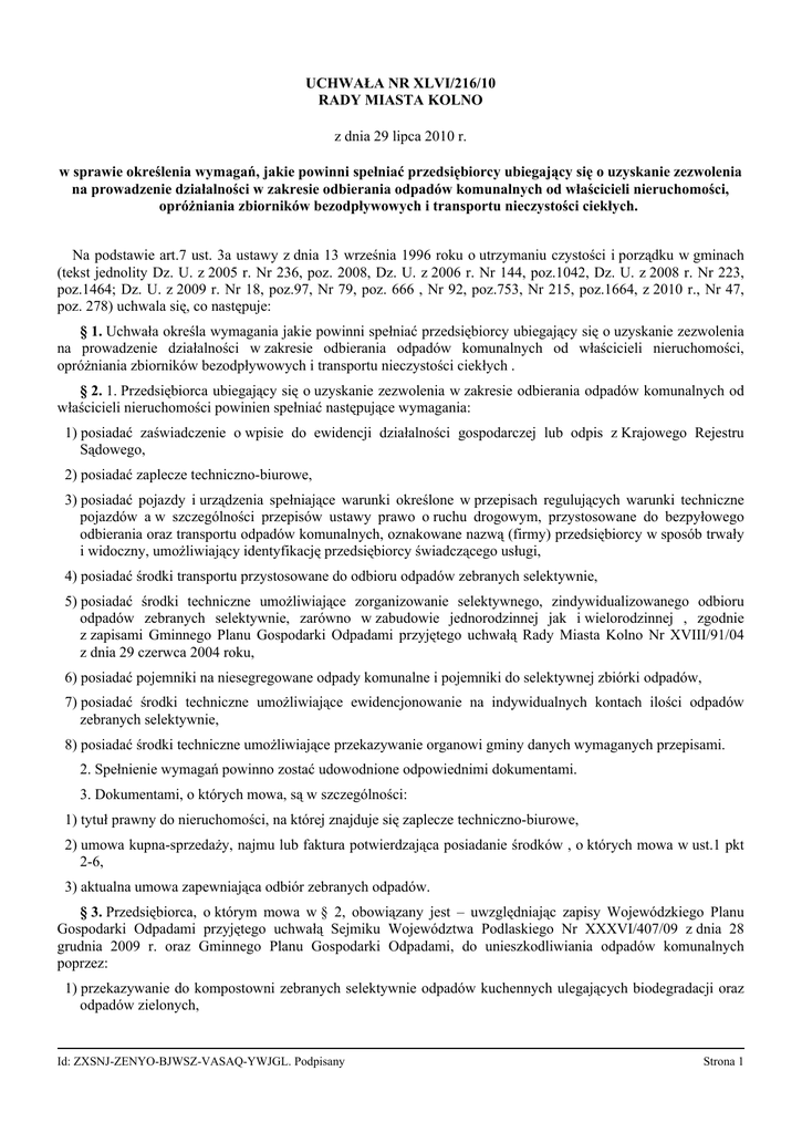 UCHWAŁA NR XLVI/216/10 RADY MIASTA KOLNO z dnia 29 lipca 2010 r. w sprawie określenia wymagań, jakie powinni spełniać przedsiębiorcy ubiegający się o uzyskanie zezwolenia na prowadzenie działalności w zakresie odbierania odpadów komunalnych od właścicieli nieruchomości, opróżniania zbiorników bezodpływowych i transportu nieczystości ciekłych. Na podstawie art.7 ust. 3a ustawy z dnia 13 września 1996 roku o utrzymaniu czystości i porządku w gminach (tekst jednolity Dz. U. z 2005 r. Nr 236, poz. 2008, Dz. U. z 2006 r. Nr 144, poz.1042, Dz. U. z 2008 r. Nr 223, poz.1464; Dz. U. z 2009 r. Nr 18, poz.97, Nr 79, poz. 666 , Nr 92, poz.753, Nr 215, poz.1664, z 2010 r., Nr 47, poz. 278) uchwala się, co następuje: § 1. Uchwała określa wymagania jakie powinni spełniać przedsiębiorcy ubiegający się o uzyskanie zezwolenia na prowadzenie działalności w zakresie odbierania odpadów komunalnych od właścicieli nieruchomości, opróżniania zbiorników bezodpływowych i transportu nieczystości ciekłych . § 2. 1. Przedsiębiorca ubiegający się o uzyskanie zezwolenia w zakresie odbierania odpadów komunalnych od właścicieli nieruchomości powinien spełniać następujące wymagania: 1) posiadać zaświadczenie o wpisie do ewidencji działalności gospodarczej lub odpis z Krajowego Rejestru Sądowego, 2) posiadać zaplecze techniczno-biurowe, 3) posiadać pojazdy i urządzenia spełniające warunki określone w przepisach regulujących warunki techniczne pojazdów a w szczególności przepisów ustawy prawo o ruchu drogowym, przystosowane do bezpyłowego odbierania oraz transportu odpadów komunalnych, oznakowane nazwą (firmy) przedsiębiorcy w sposób trwały i widoczny, umożliwiający identyfikację przedsiębiorcy świadczącego usługi, 4) posiadać środki transportu przystosowane do odbioru odpadów zebranych selektywnie, 5) posiadać środki techniczne umożliwiające zorganizowanie selektywnego, zindywidualizowanego odbioru odpadów zebranych selektywnie, zarówno w zabudowie jednorodzinnej jak i wielorodzinnej , zgodnie z zapisami Gminnego Planu Gospodarki Odpadami przyjętego uchwałą Rady Miasta Kolno Nr XVIII/91/04 z dnia 29 czerwca 2004 roku, 6) posiadać pojemniki na niesegregowane odpady komunalne i pojemniki do selektywnej zbiórki odpadów, 7) posiadać środki techniczne umożliwiające ewidencjonowanie na indywidualnych kontach ilości odpadów zebranych selektywnie, 8) posiadać środki techniczne umożliwiające przekazywanie organowi gminy danych wymaganych przepisami. 2. Spełnienie wymagań powinno zostać udowodnione odpowiednimi dokumentami. 3. Dokumentami, o których mowa, są w szczególności: 1) tytuł prawny do nieruchomości, na której znajduje się zaplecze techniczno-biurowe, 2) umowa kupna-sprzedaży, najmu lub faktura potwierdzająca posiadanie środków , o których mowa w ust.1 pkt 2-6, 3) aktualna umowa zapewniająca odbiór zebranych odpadów. § 3. Przedsiębiorca, o którym mowa w § 2, obowiązany jest – uwzględniając zapisy Wojewódzkiego Planu Gospodarki Odpadami przyjętego uchwałą Sejmiku Województwa Podlaskiego Nr XXXVI/407/09 z dnia 28 grudnia 2009 r. oraz Gminnego Planu Gospodarki Odpadami, do unieszkodliwiania odpadów komunalnych poprzez: 1) przekazywanie do kompostowni zebranych selektywnie odpadów kuchennych ulegających biodegradacji oraz odpadów zielonych, Id: ZXSNJ-ZENYO-BJWSZ-VASAQ-YWJGL. Podpisany Strona 1 2) przekazywanie do zakładu unieszkodliwiania zebranych selektywnie opakowań z papieru i tektury oraz z papieru i tektury nieopakowaniowych, opakowań wielomateriałowych, opakowań z tworzyw sztucznych, tekstyliów, opakowań ze szkła, opakowań z blachy stalowej i aluminium oraz metali, 3) przekazywanie do zakładu unieszkodliwiania zebranych selektywnie odpadów wielkogabarytowych oraz zużytego sprzętu elektrycznego i elektronicznego, 4) przekazywanie do zakładu unieszkodliwiania zebranej selektywnie frakcji odpadów niebezpiecznych zawartych w odpadach komunalnych, 5) przekazywanie do zakładu unieszkodliwiania zebranych selektywnie odpadów budowlanych z remontów, 6) składowanie na składowisku odpadów komunalnych nie podlegających selekcji, a więc: tworzyw sztucznych nieopakowaniowych, szkła nieopakowaniowego, odpadów mineralnych, drobnej frakcji popiołowej oraz innych strumieni odpadów komunalnych zmieszanych 7) posiadać dokument potwierdzający gotowość do odbioru odpadów komunalnych przez wysypisko miejskie w Kolnie. § 4. 1. Przedsiębiorca ubiegający się o uzyskanie zezwolenia w zakresie opróżniania bezodpływowych i transportu nieczystości ciekłych powinien spełniać następujące wymagania: zbiorników 1) posiadać zaświadczenie o wpisie do ewidencji działalności gospodarczej lub odpis z Krajowego Rejestru Sądowego, 2) posiadać zaplecze techniczno-biurowe, 3) posiadać sprzęt samochodowy (pojazdy asenizacyjne) posiadające możliwość opróżniania zbiornika bezodpływowego, zgodnie z technicznymi oraz sanitarno-porządkowymi wymaganiami Rozporządzenia Ministra Infrastruktury z dnia 12 listopada 2002r. w sprawie wymagań dla pojazdów asenizacyjnych (Dz. U. z 2002r. Nr 193, poz. 1617), 4) powadzić ewidencję kontrahentów i ilości zebranych odpadów. 5) posiadać dokument potwierdzający gotowość do odbioru nieczystości płynnych przez oczyszczalnię ścieków w Kolnie. 6) pojazdy o których mowa w ust.1 pkt 3 winne być: a) oznakowany nazwą (firmy) przedsiębiorcy w sposób trwały i widoczny, umożliwiający identyfikację przedsiębiorcy świadczącego usługi b) każdorazowo po zakończeniu pracy myte i poddane dezynfekcji. § 5. Dokumenty określone w § 2 i w § 4 muszą być dostarczone w oryginale lub kserokopii potwierdzonej na każdej ze stron „ za zgodność z oryginałem” przez osobę upoważnioną do reprezentowania przedsiębiorcy ubiegającego się o przedmiotowe zezwolenie. § 6. Wykonanie uchwały powierza się Burmistr
